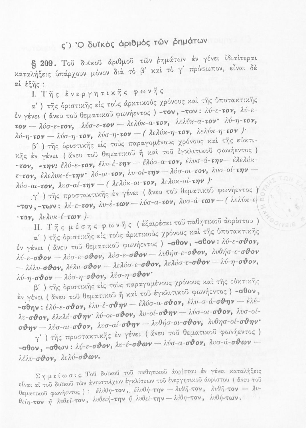 Σχολικό εγχειρίδιο Αρχαίων Ελληνικών Α', Β', Γ' και Δ' Γυμνασίου που περιέχει τους κανόνες γραμματικής και είναι χωρισμένο σε φθογγολογικό, τυπολογικό και ετυμολογικό μέρος. Περιέχει και κατάλογο ανωμάλων ρημάτων. Φέρει το σύμβολο της δικτατορίας.