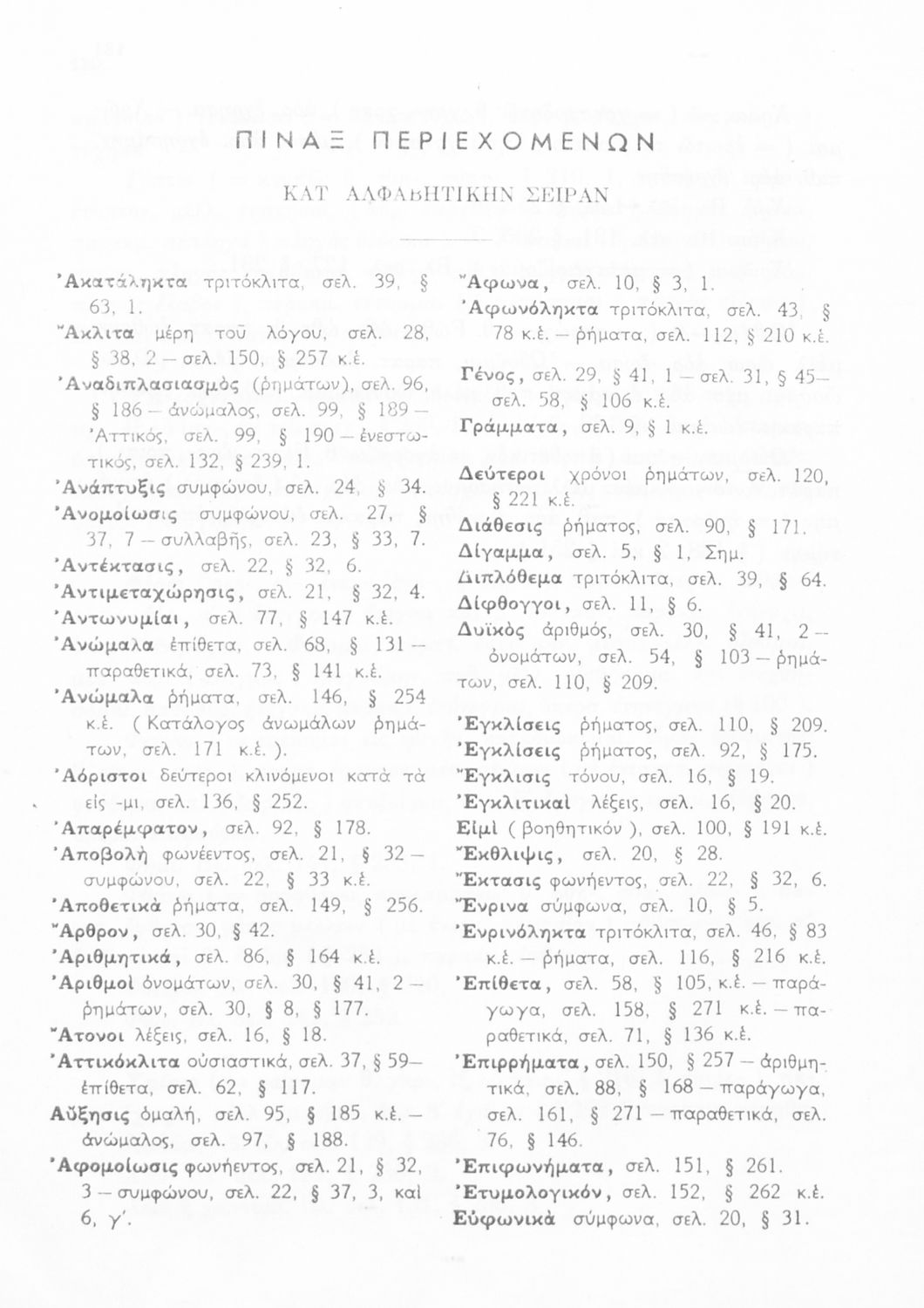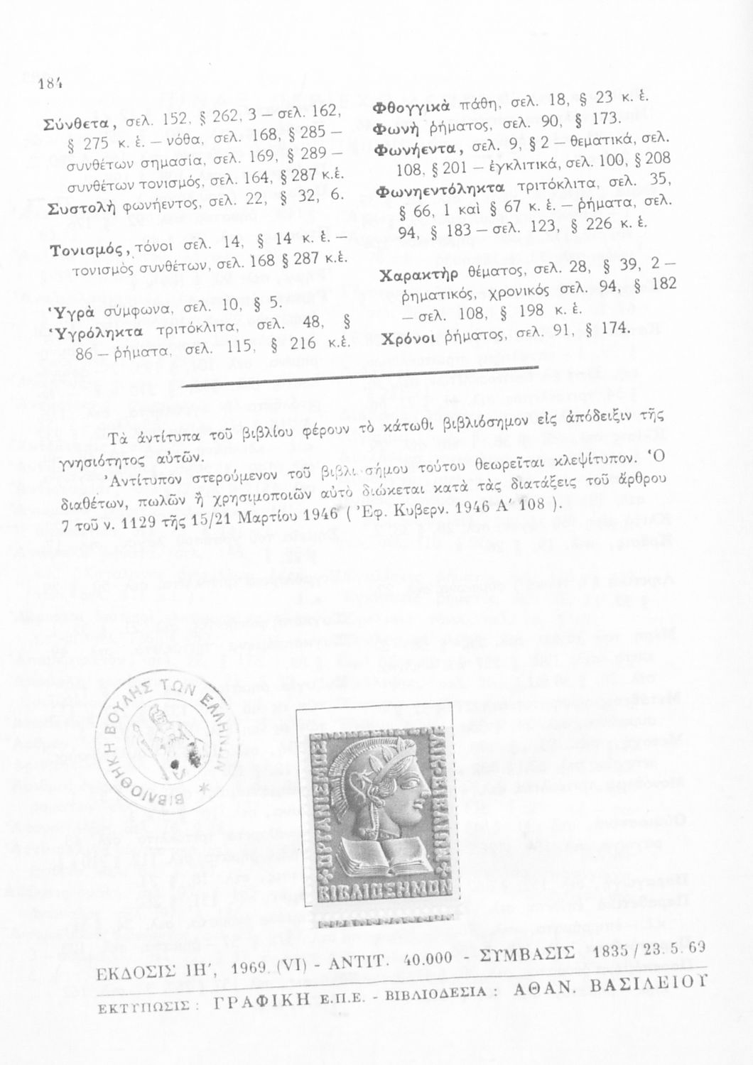 Σχολικό εγχειρίδιο Αρχαίων Ελληνικών Α', Β', Γ' και Δ' Γυμνασίου που περιέχει τους κανόνες γραμματικής και είναι χωρισμένο σε φθογγολογικό, τυπολογικό και ετυμολογικό μέρος. Περιέχει και κατάλογο ανωμάλων ρημάτων. Φέρει το σύμβολο της δικτατορίας.
