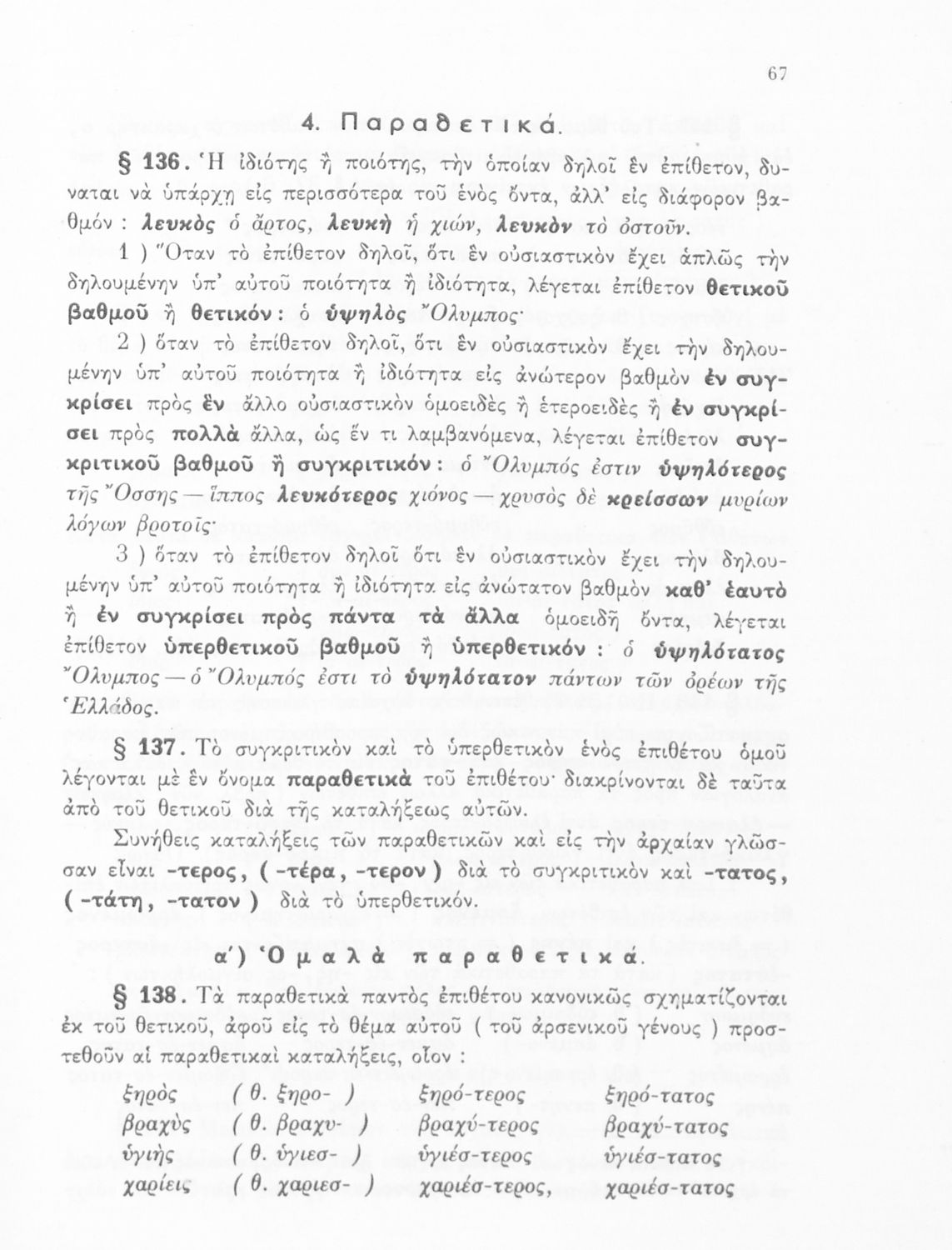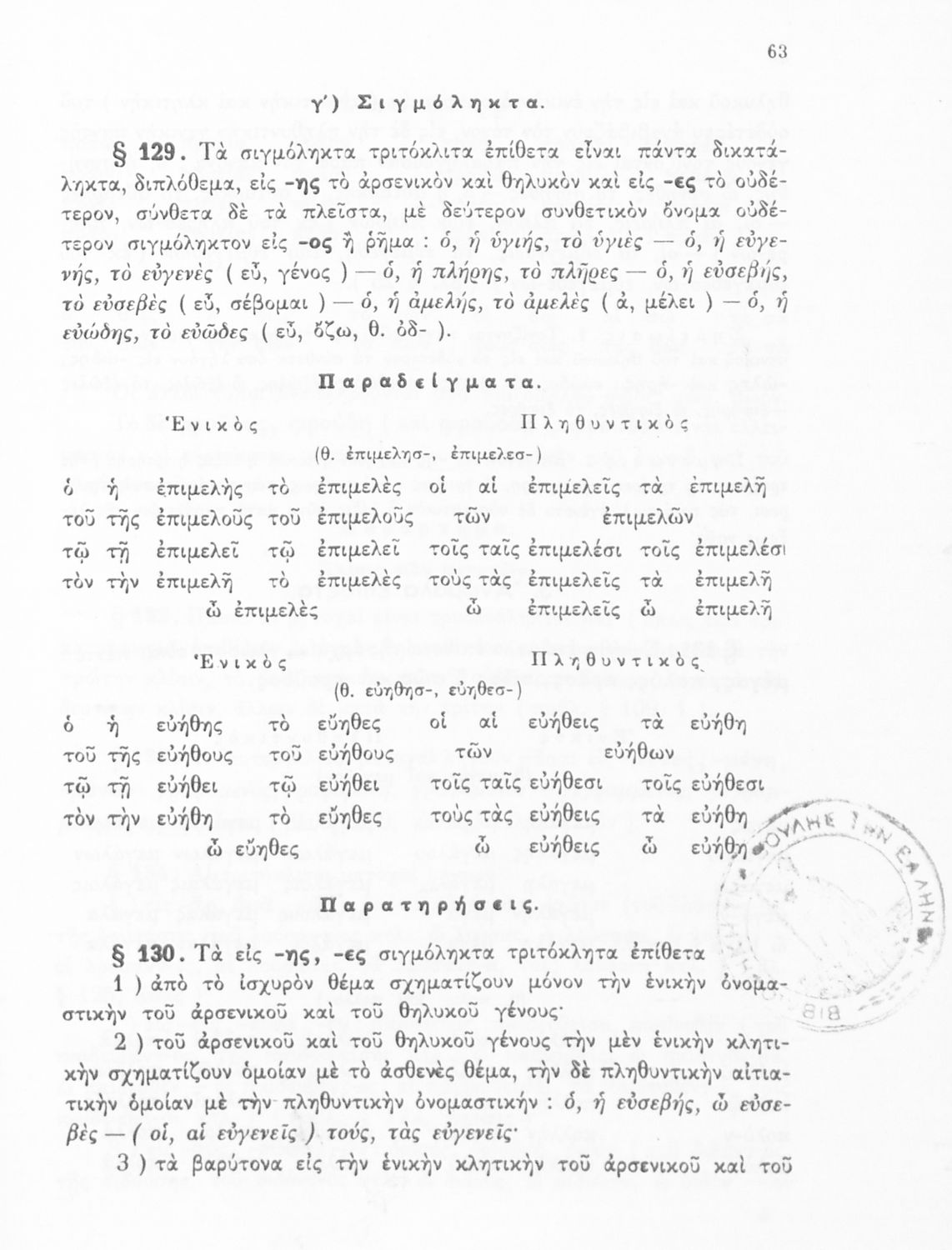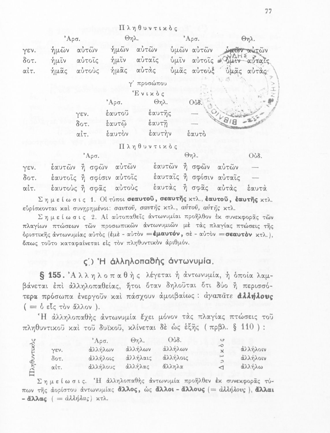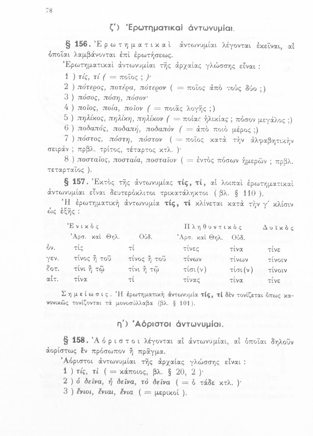 Σχολικό εγχειρίδιο Αρχαίων Ελληνικών Α', Β', Γ' και Δ' Γυμνασίου που περιέχει τους κανόνες γραμματικής και είναι χωρισμένο σε φθογγολογικό, τυπολογικό και ετυμολογικό μέρος. Περιέχει και κατάλογο ανωμάλων ρημάτων. Φέρει το σύμβολο της δικτατορίας.