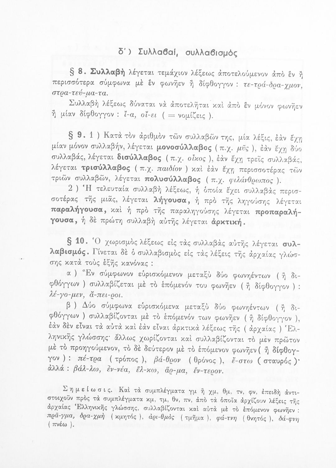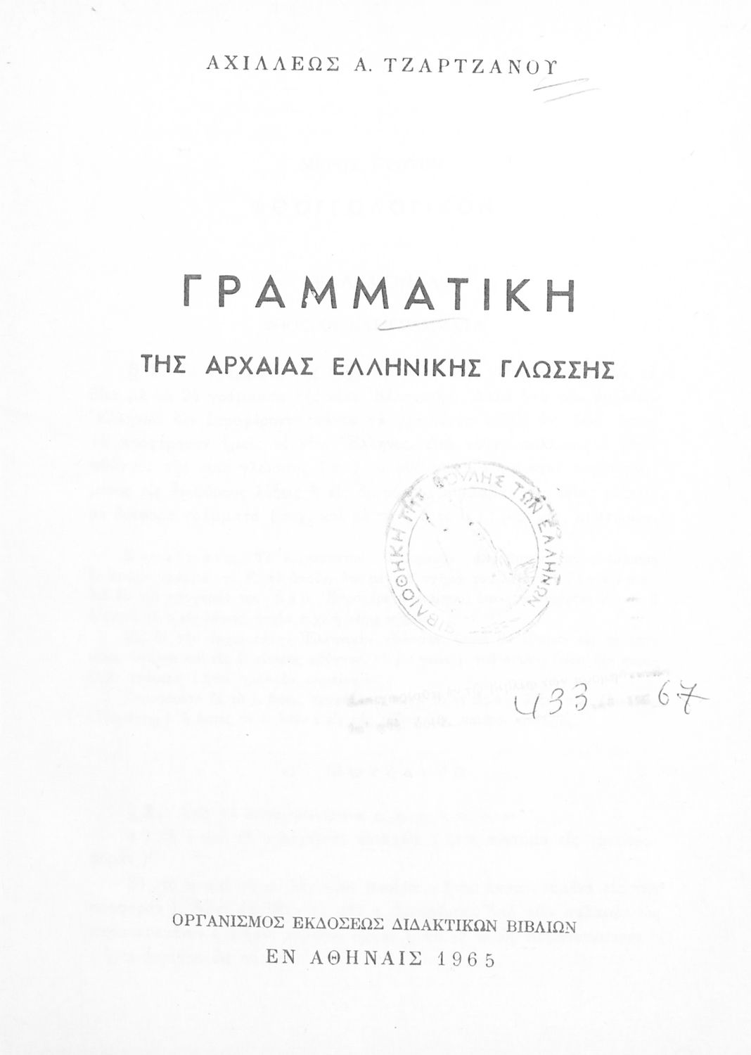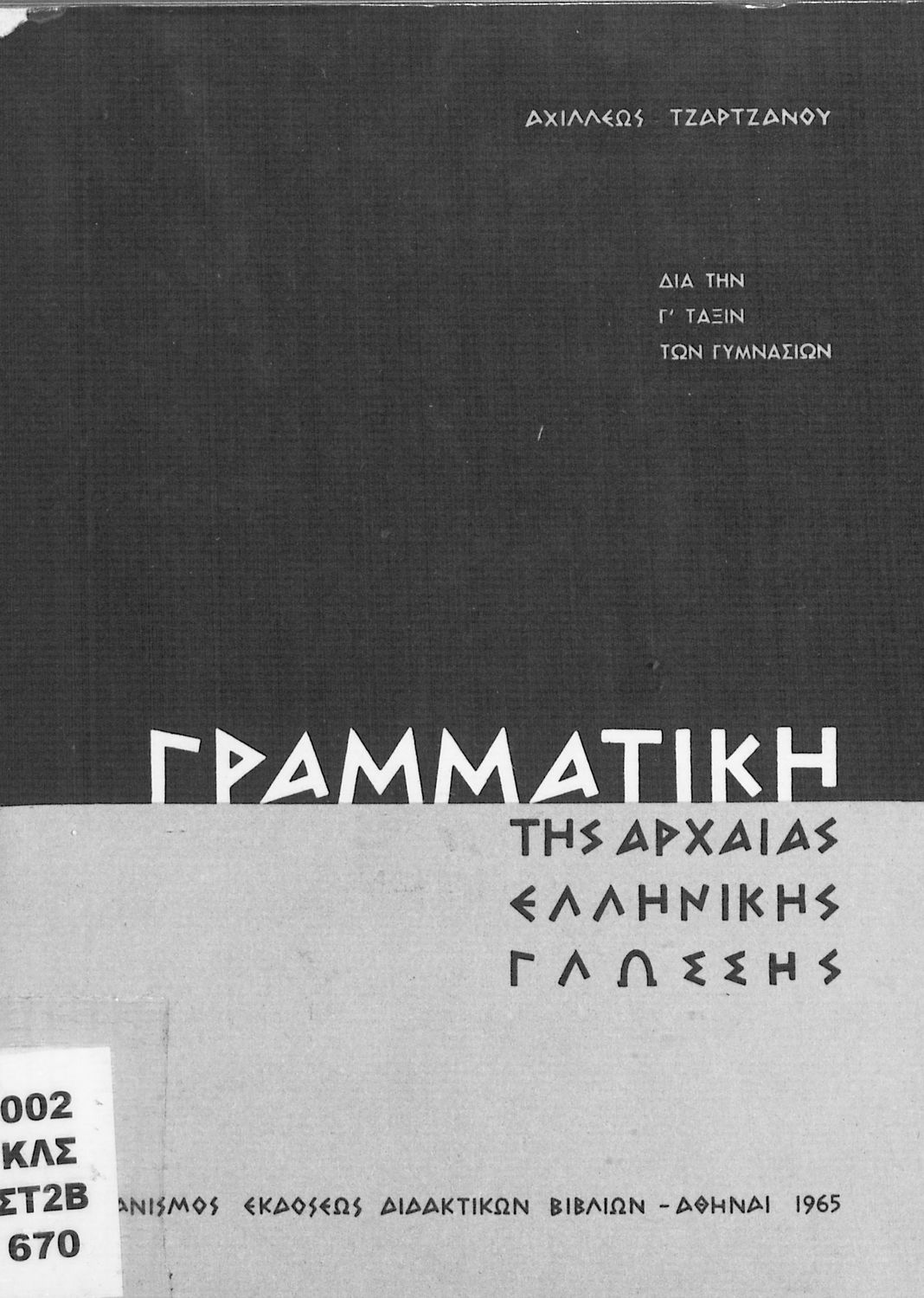 Σχολικό εγχειρίδιο Αρχαίων Ελληνικών Γ΄ Γυμνασίου που περιέχει τους κανόνες γραμματικής και είναι χωρισμένο σε φθογγολογικό, τυπολογικό και ετυμολογικό μέρος. Περιέχει και κατάλογο ανωμάλων ρημάτων.