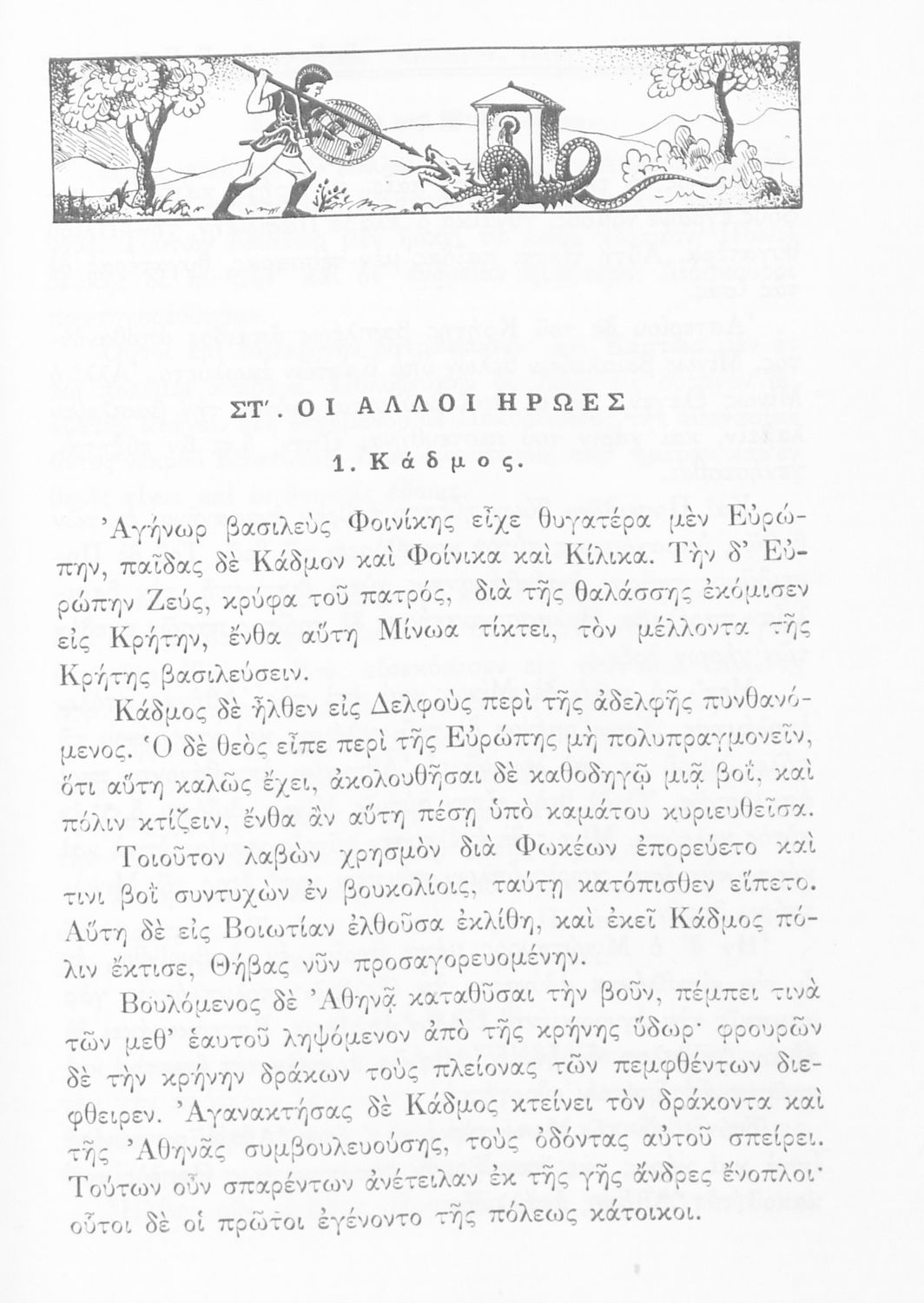 Σχολικό εγχειρίδιο Αρχαίων Ελληνικών Α΄ και Β΄ Γυμνασίου που περιέχει αποσπάσματα από έργα αρχαίων Ελλήνων συγγραφέων, ερμηνευτικά και πραγματολογικά σχόλια και γραμματικές παρατηρήσεις. Φέρει το σύμβολο της δικτατορίας.
