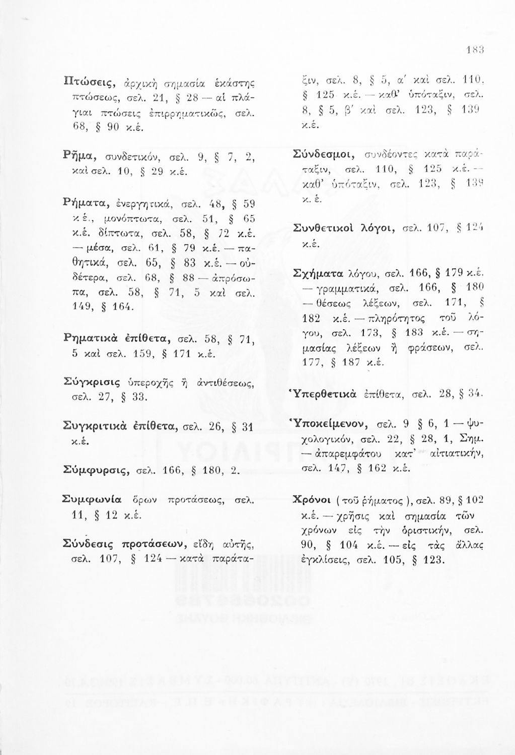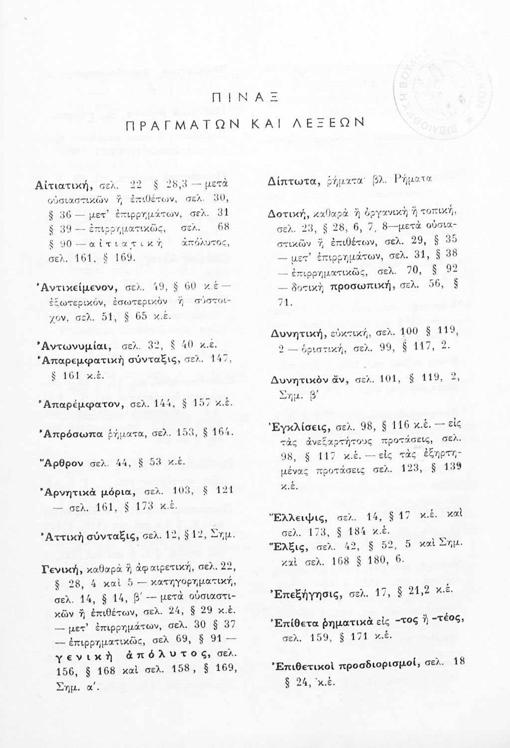 Σχολικό εγχειρίδιο Αρχαίων Ελληνικών Γ΄ Γυμνασίου που εξετάζει τα μέρη του λόγου και την σύνταξή τους. Φέρει το σύμβολο της δικτατορίας.