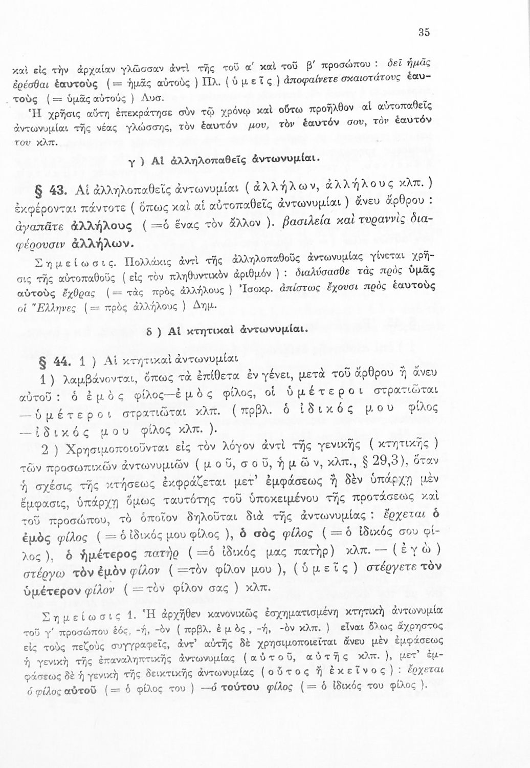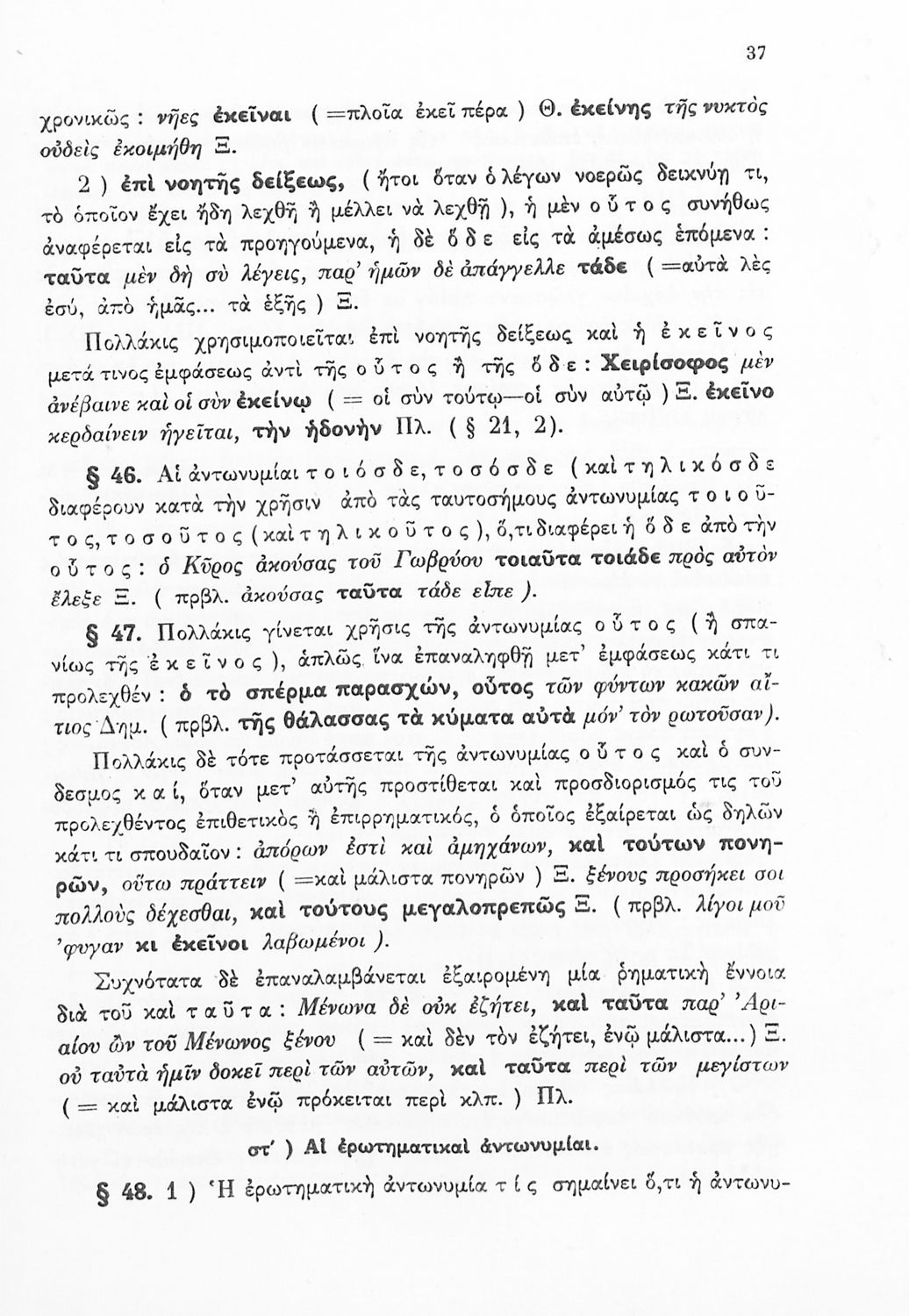 Παρουσίαση περιεχομένου: Σχολικό εγχειρίδιο Αρχαίων Ελληνικών Γ΄ Γυμνασίου που εξετάζει τα μέρη του λόγου και την σύνταξή τους. Φέρει το σύμβολο της δικτατορίας.