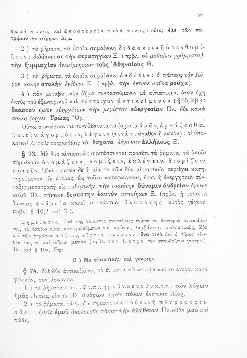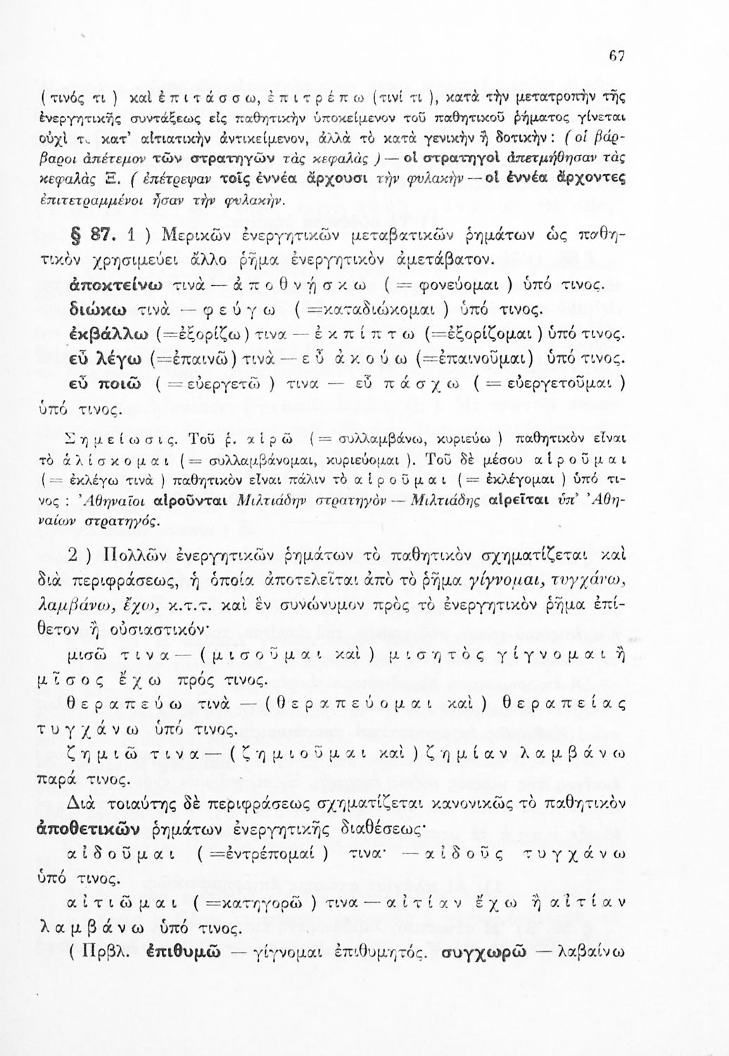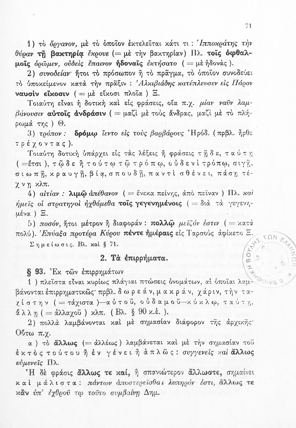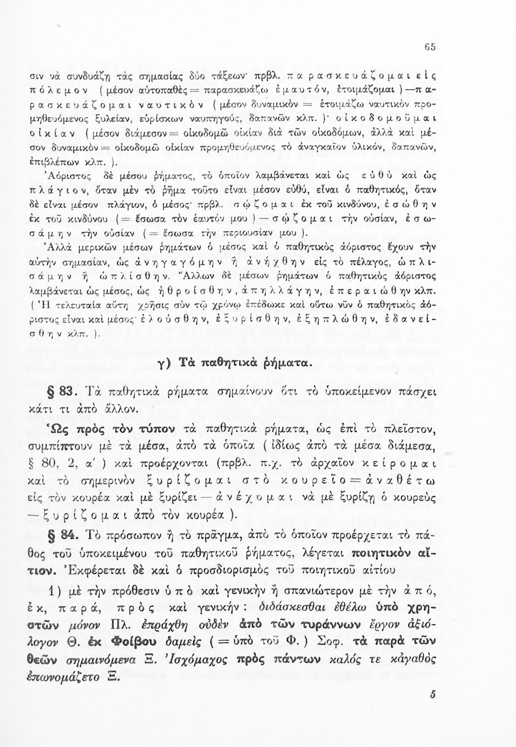 Σχολικό εγχειρίδιο Αρχαίων Ελληνικών Γ΄ Γυμνασίου που εξετάζει τα μέρη του λόγου και την σύνταξή τους. Φέρει το σύμβολο της δικτατορίας.