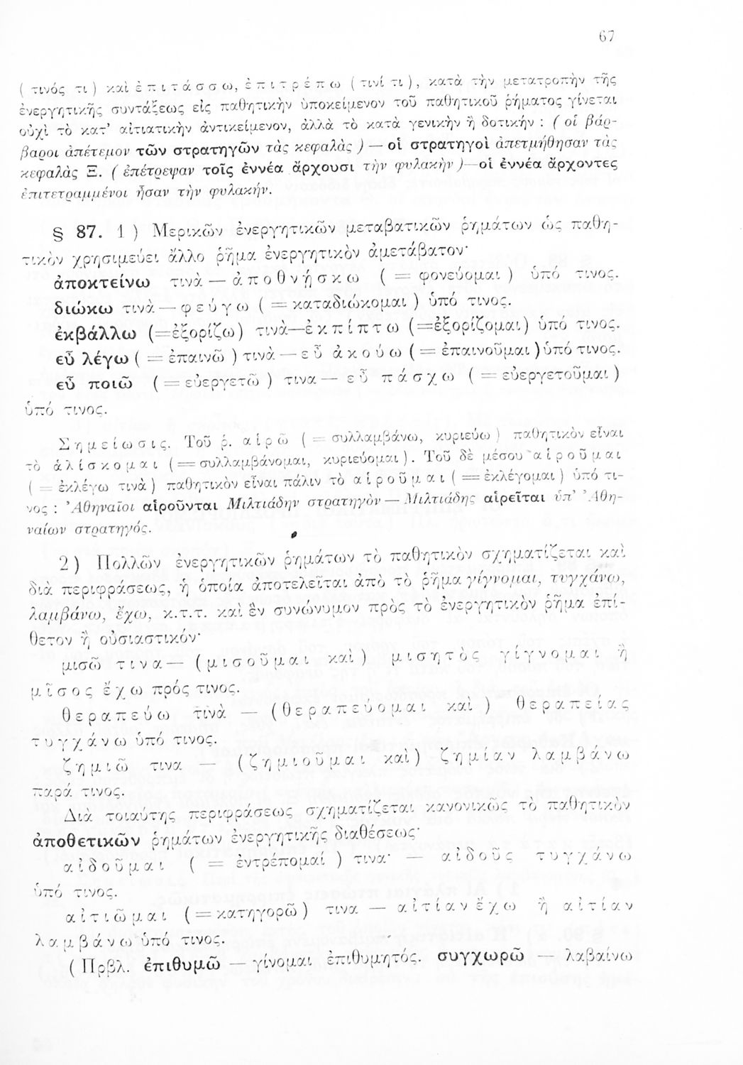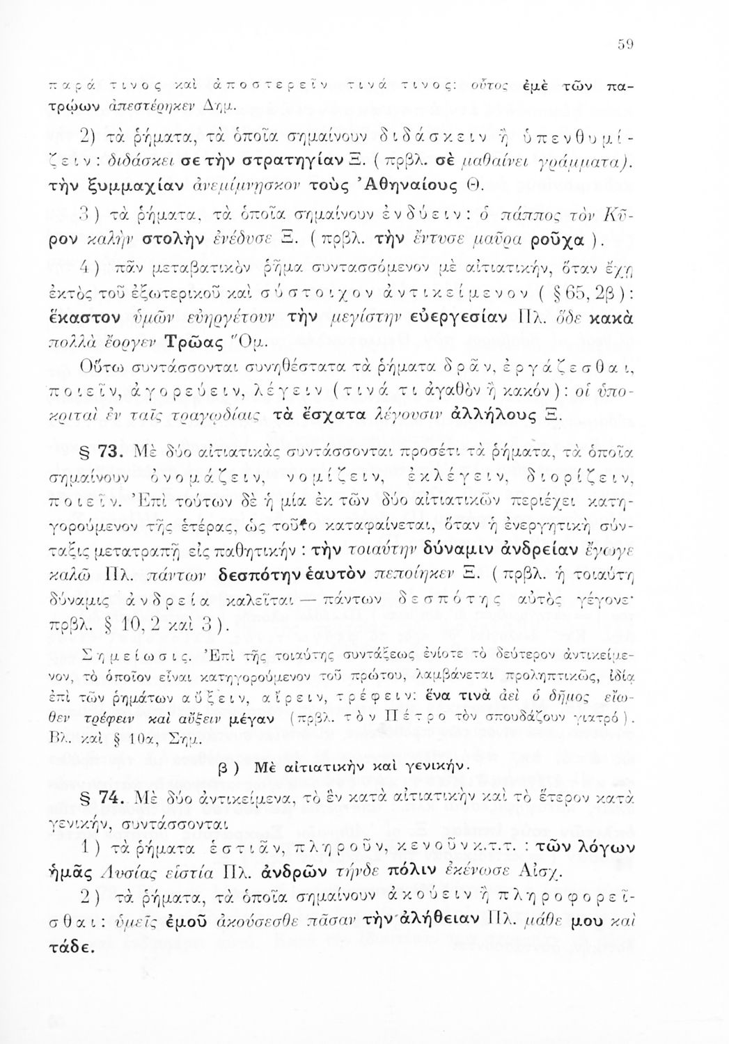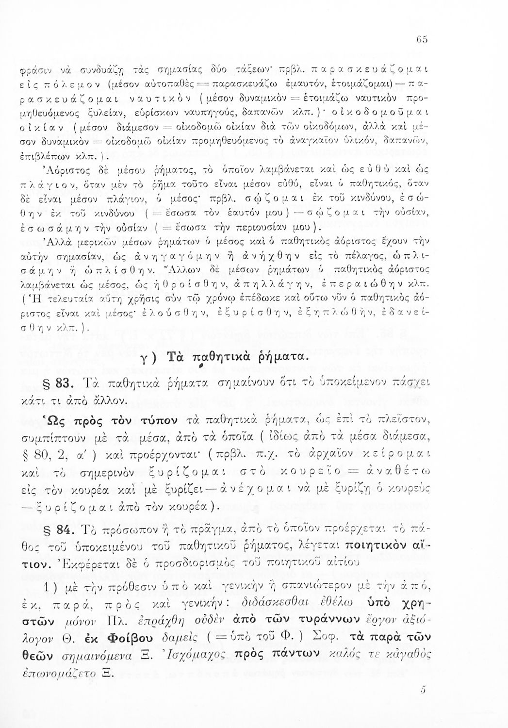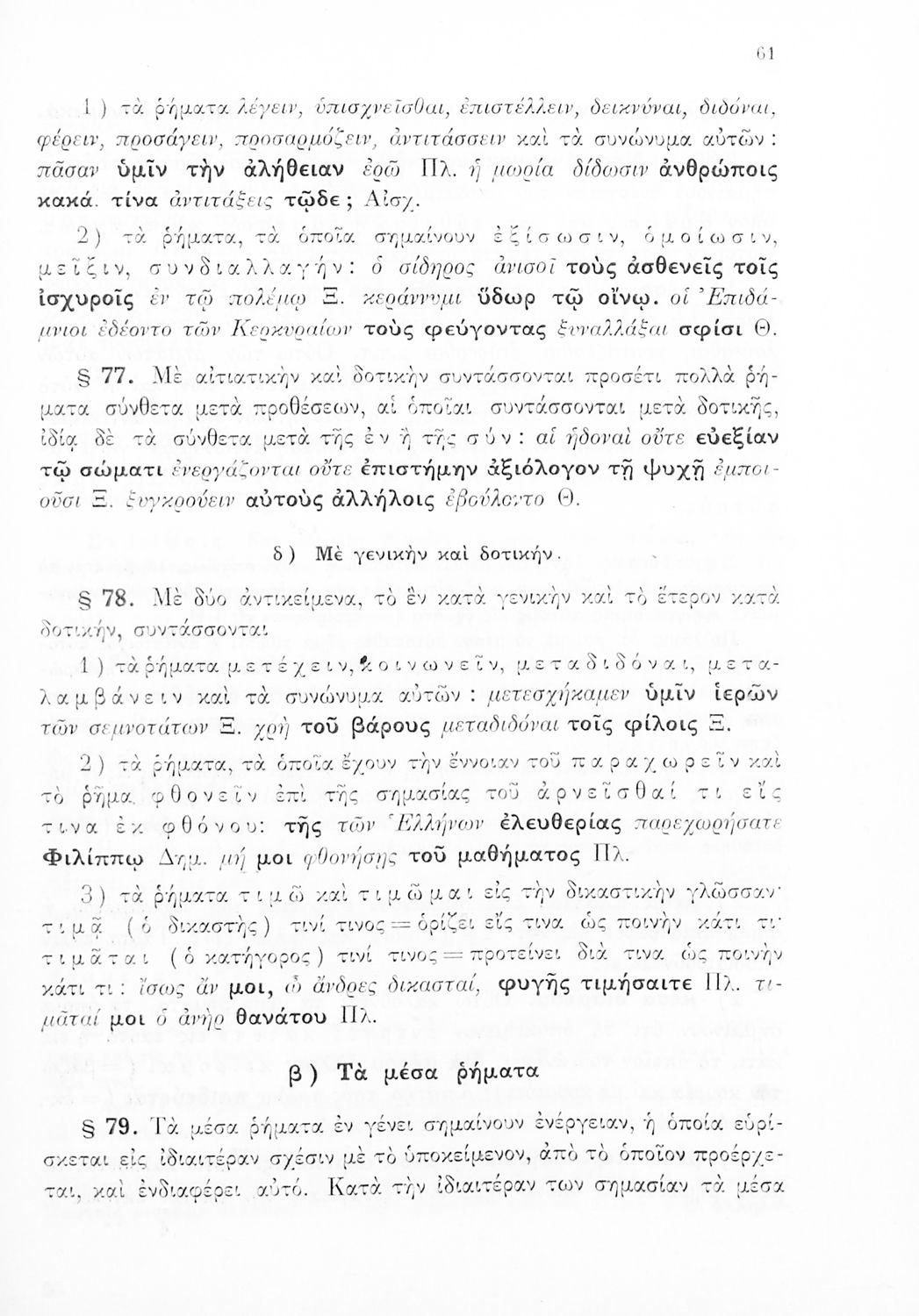 Βαθμίδα εκπαίδευσης: Δευτεροβάθμια Τάξη: Γυμνάσιο Μάθημα: Αρχαία Ελληνικά Γλώσσα: Καθαρεύουσα Παρουσίαση περιεχομένου: Σχολικό εγχειρίδιο Αρχαίων Ελληνικών Γυμνασίου που εξετάζει τα μέρη του λόγου και την σύνταξή τους. |