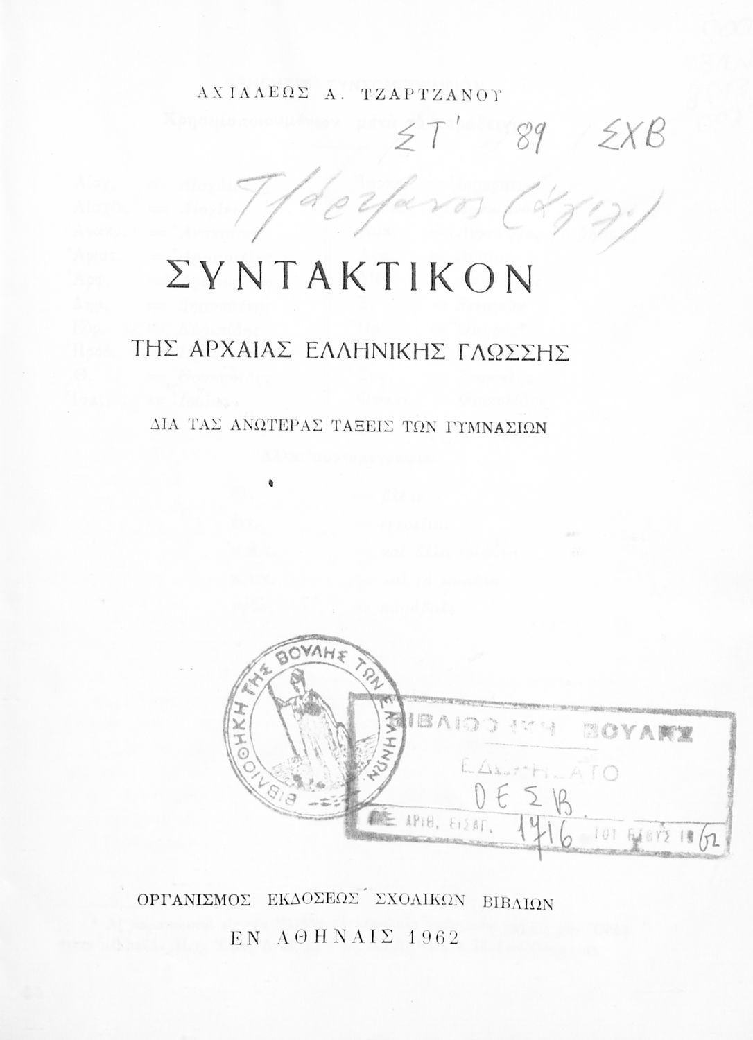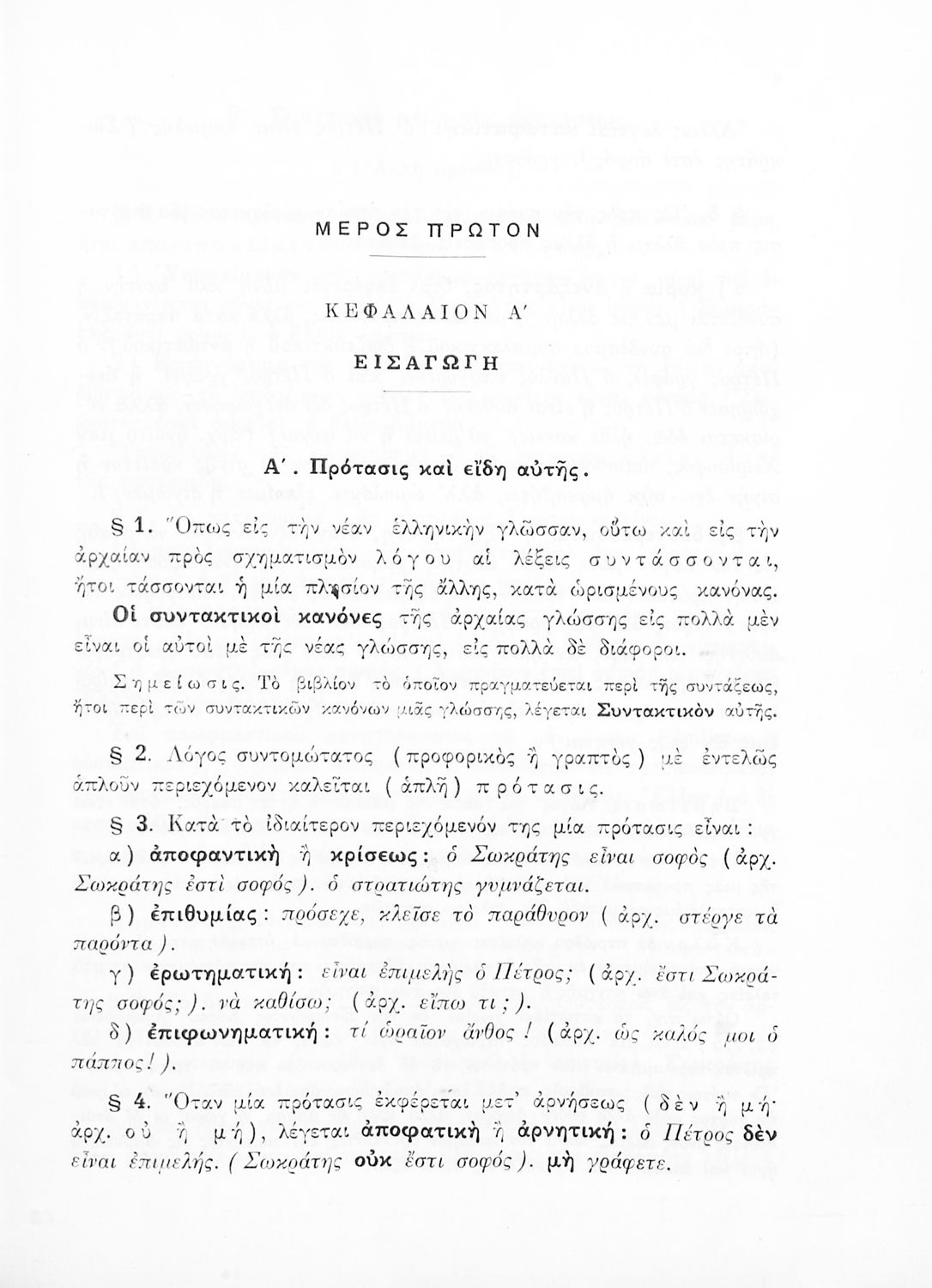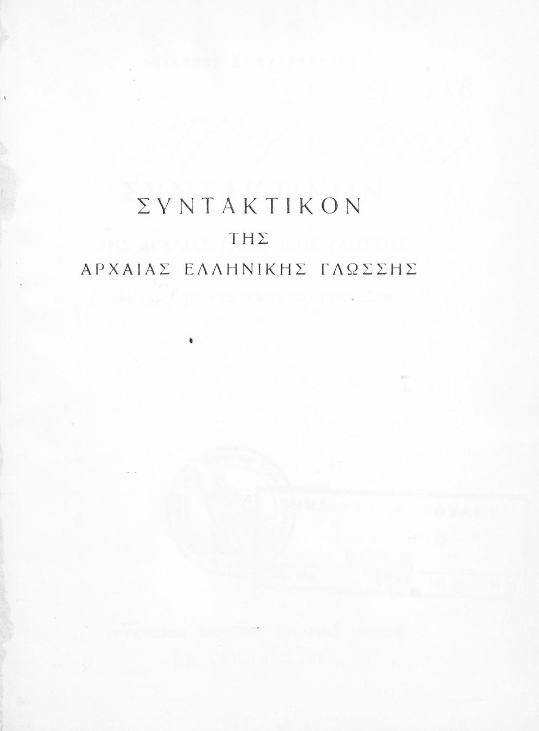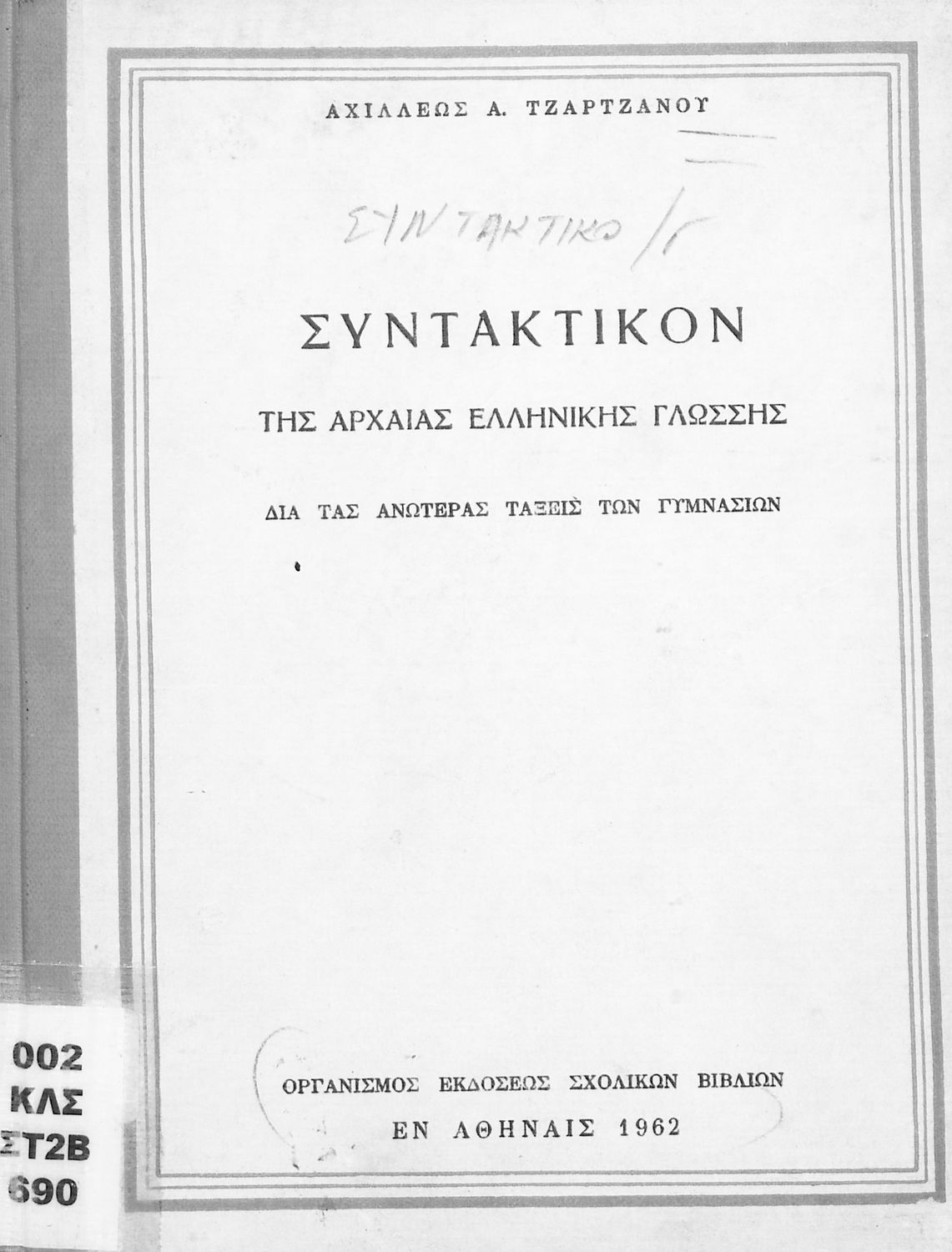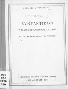 Βαθμίδα εκπαίδευσης: Δευτεροβάθμια Τάξη: Γυμνάσιο Μάθημα: Αρχαία Ελληνικά Γλώσσα: Καθαρεύουσα Παρουσίαση περιεχομένου: Σχολικό εγχειρίδιο Αρχαίων Ελληνικών Γυμνασίου που εξετάζει τα μέρη του λόγου και την σύνταξή τους. |