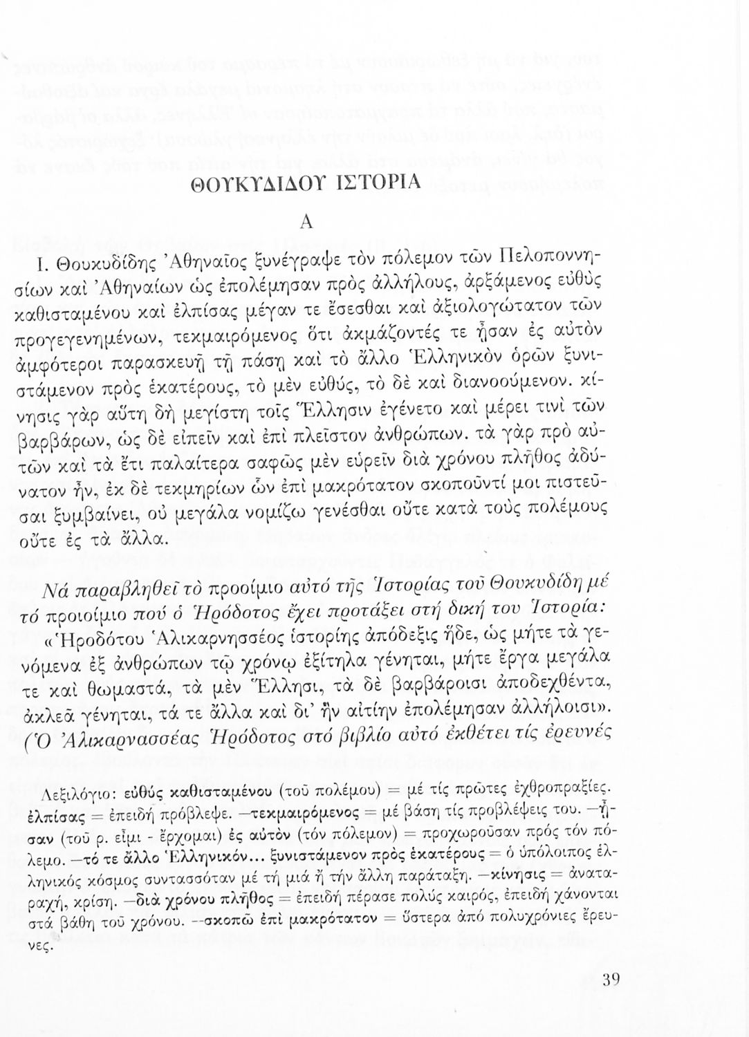 Σχολικό Εγχειρίδιο Αρχαίων Ελληνικών Α' και Β΄ Γυμνασίου που περιλαμβάνει κείμενα προσαρμοσμένα στη διδασκαλία των γραμματικών και συντακτικών φαινομένων, και ερμηνευτικές και λεξιλογικές σημειώσεις.