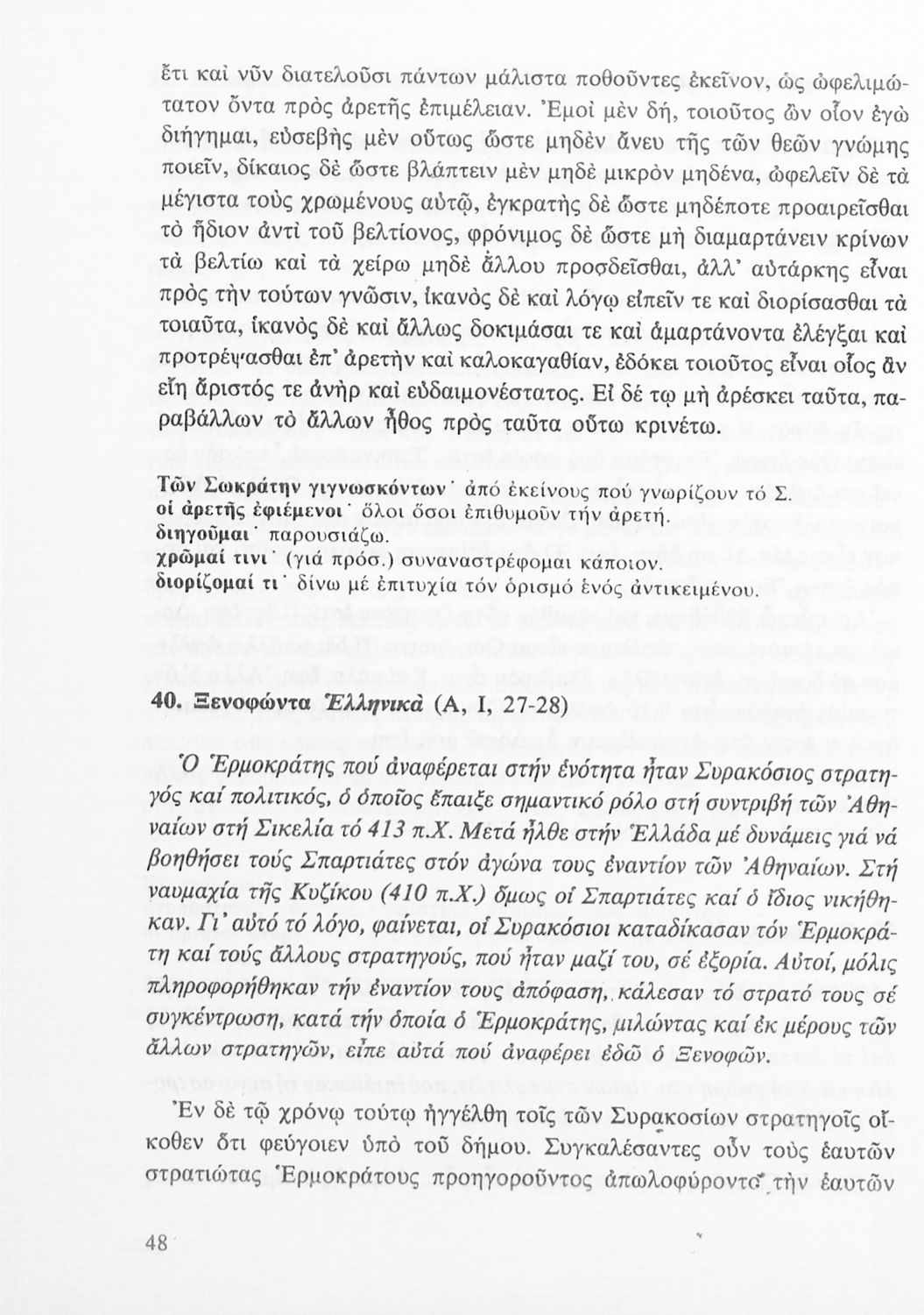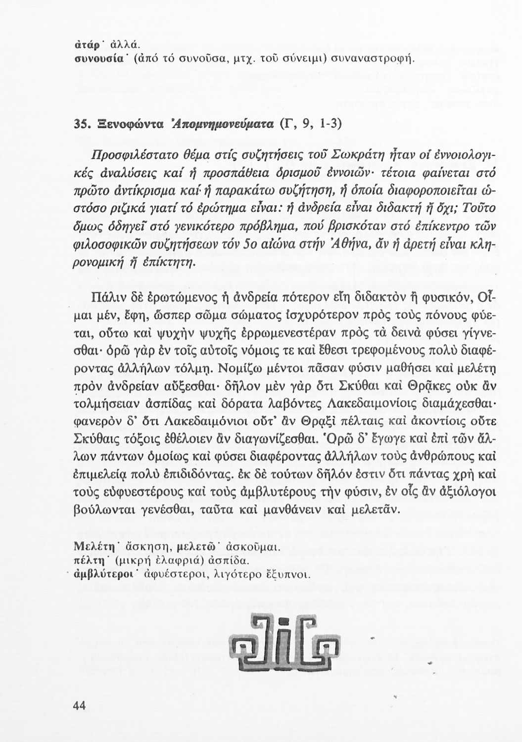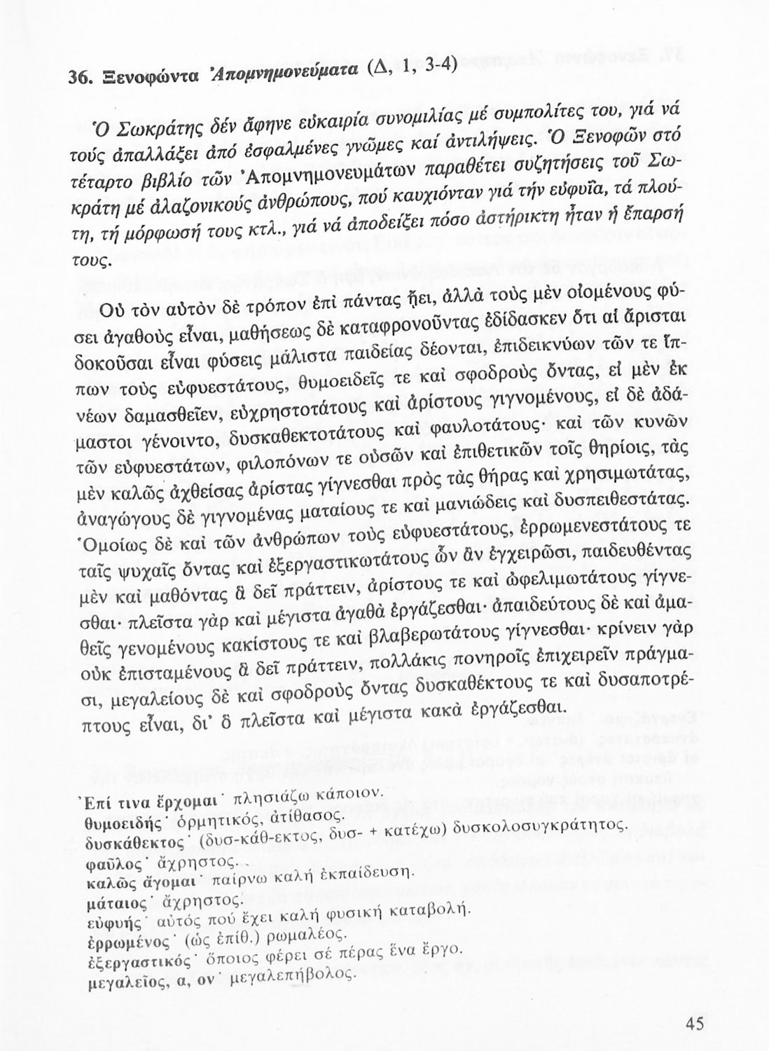 Σχολικό εγχειρίδιο Αρχαίων Ελληνικών Α' Λυκείου που περιλαμβάνει αποσπάσματα από κείμενα αρχαίων Ελλήνων συγγραφέων και γραμματικές, συντακτικές και ερμηνευτικές σημειώσεις. Περιέχει και ασκήσεις γραμματικής.