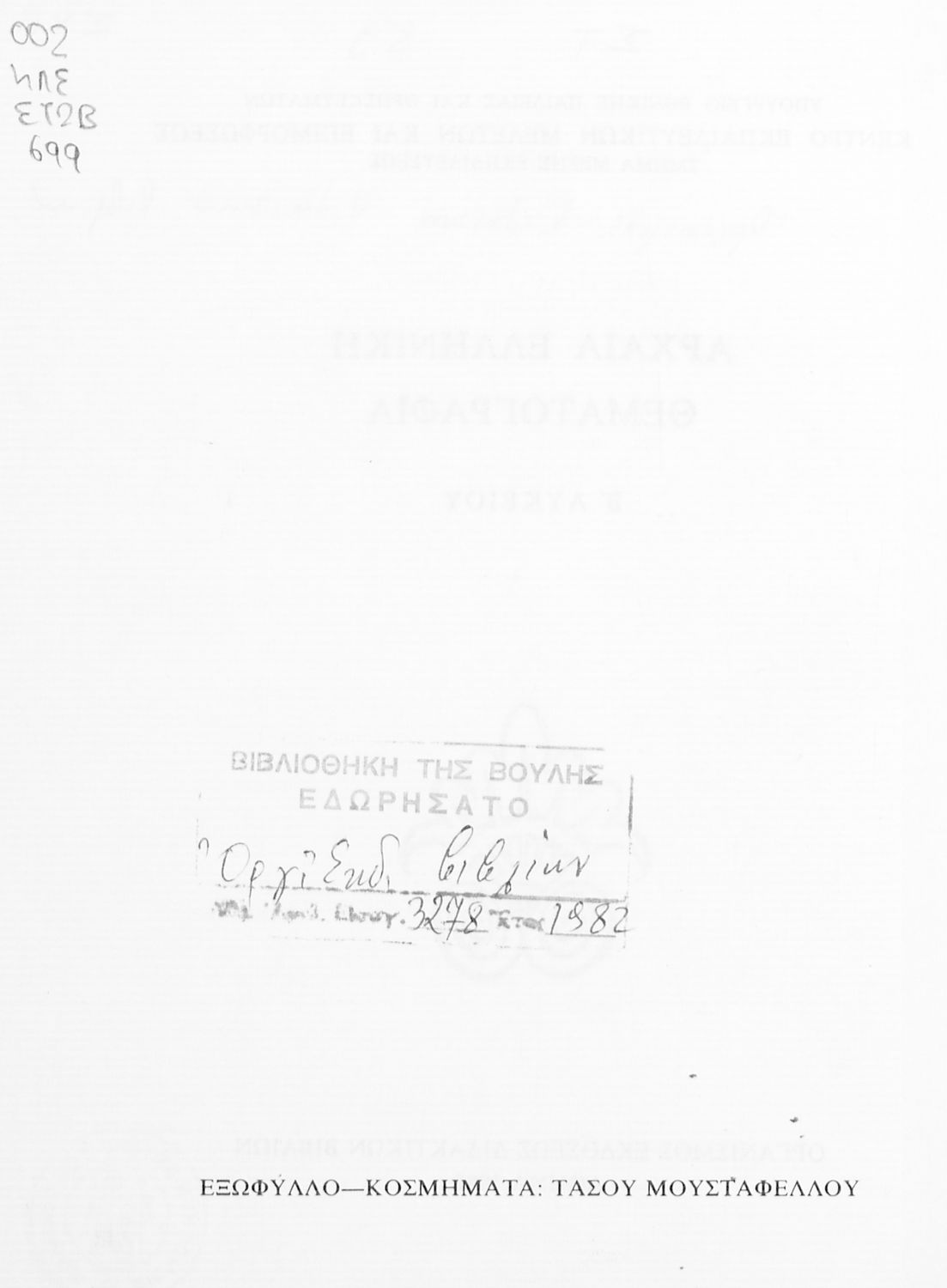 Εντοπισμός πρωτοτύπου: Βιβλιοθήκη της Βουλής των Ελλήνων Κωδικός βιβλιοθήκης: 20556800 |