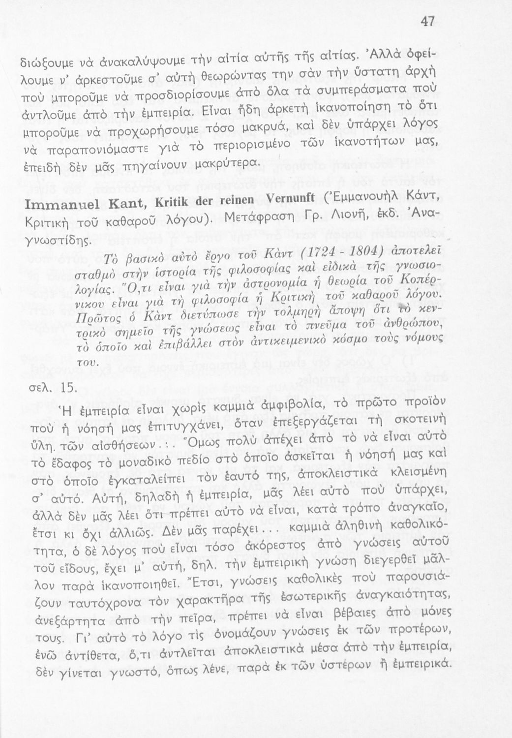 Σχολικό εγχειρίδιο Φιλοσοφίας για την Γ΄ Λυκείου που περιέχει αποσπάσματα από διάσημα φιλοσοφικά κείμενα τόσο της ελληνικής αρχαιότητας όσο και της σύγχρονης ευρωπαϊκής σκέψης και θέματα προς συζήτηση. Περιλαμβάνει και λεξιλόγιο φιλοσοφικών όρων και ειδικό κεφάλαιο για τους προσωκρατικούς.