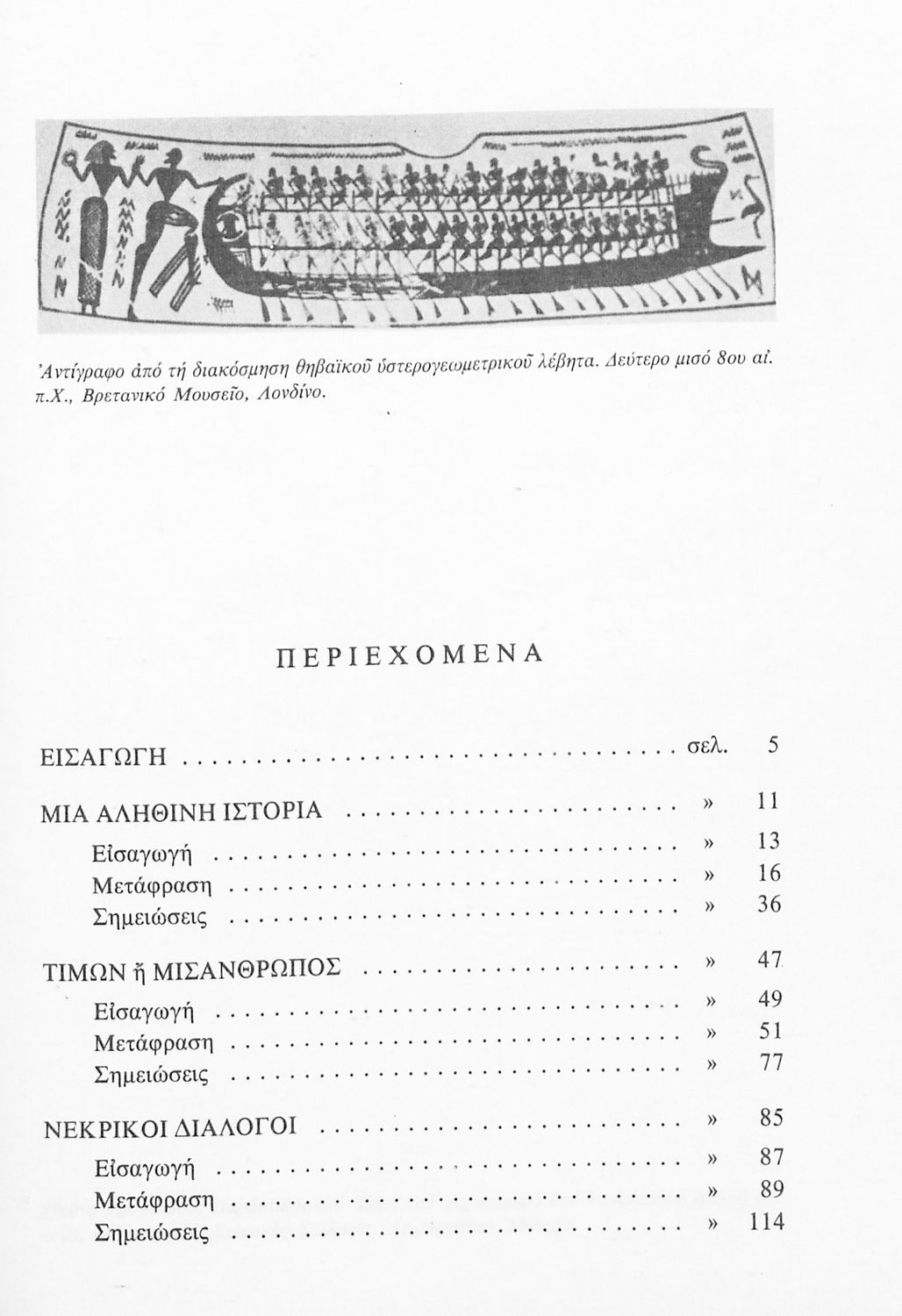 Σχολικό εγχειρίδιο Αρχαίων Ελληνικών Α' Γυμνασίου που περιέχει εισαγωγή στην ζωή και το έργο του Λουκιανού, τα έργα του Μία αληθινή ιστορία, Τιμών ή Μισάνθρωπος, Νεκρικοί Διάλογοι και ερμηνευτικές σημειώσεις.