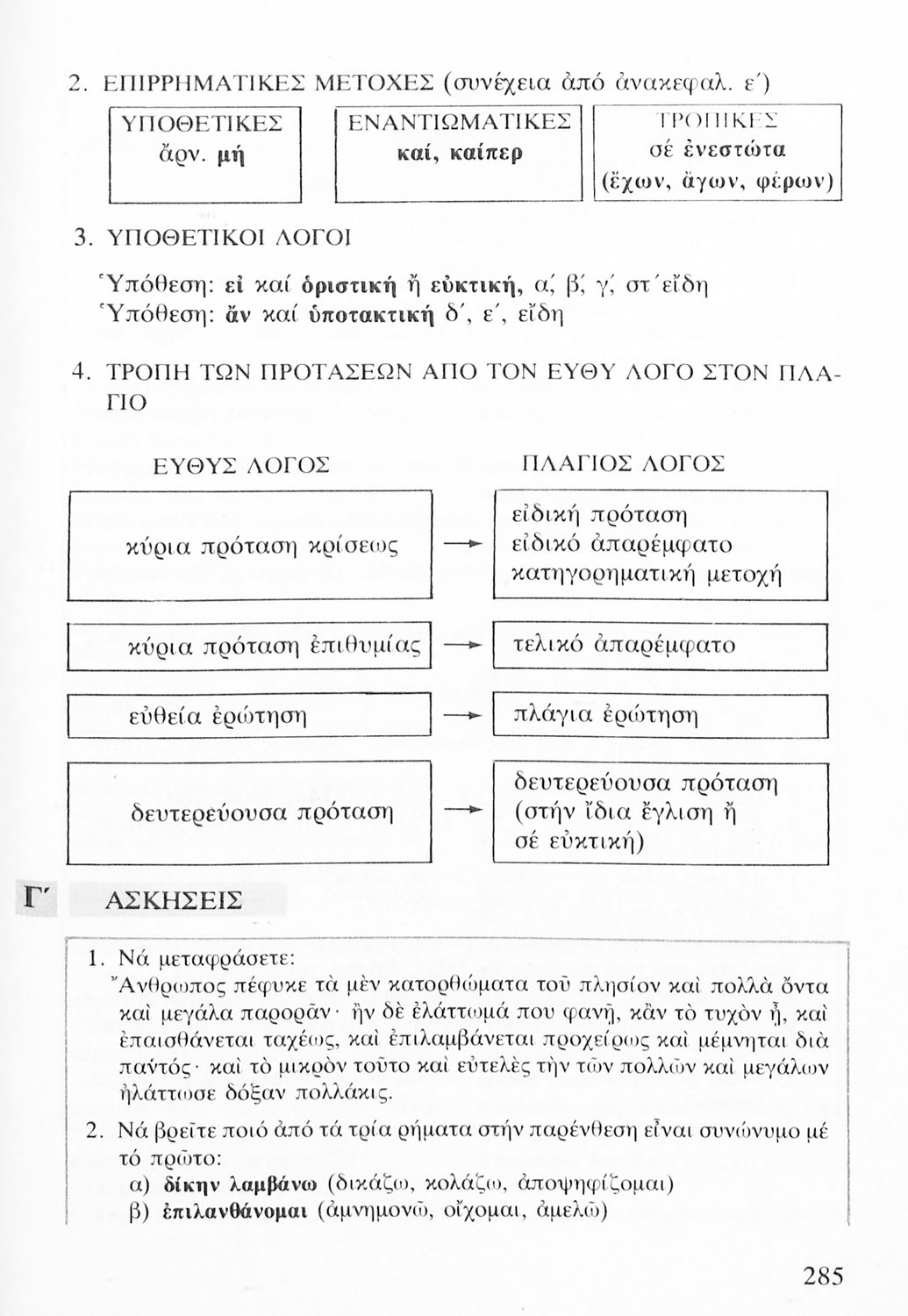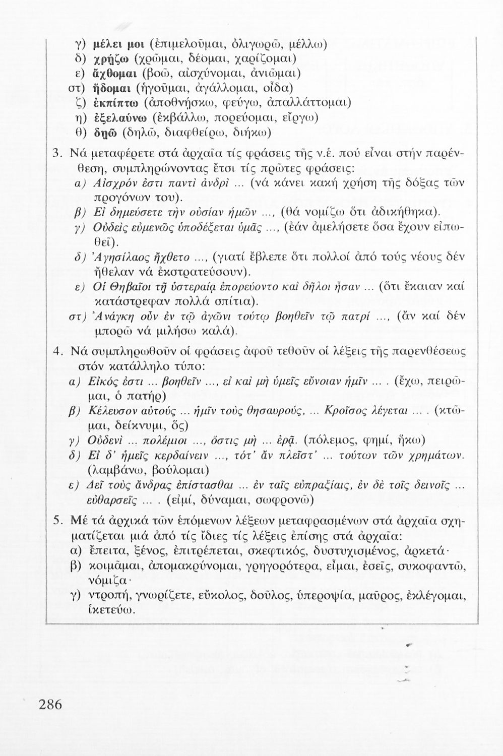 Σχολικό εγχειρίδιο Αρχαίων Ελληνικών για τις Α΄, Β΄ και Γ΄ Λυκείου που εξετάζει τα μέρη του λόγου και την σύνταξή τους.