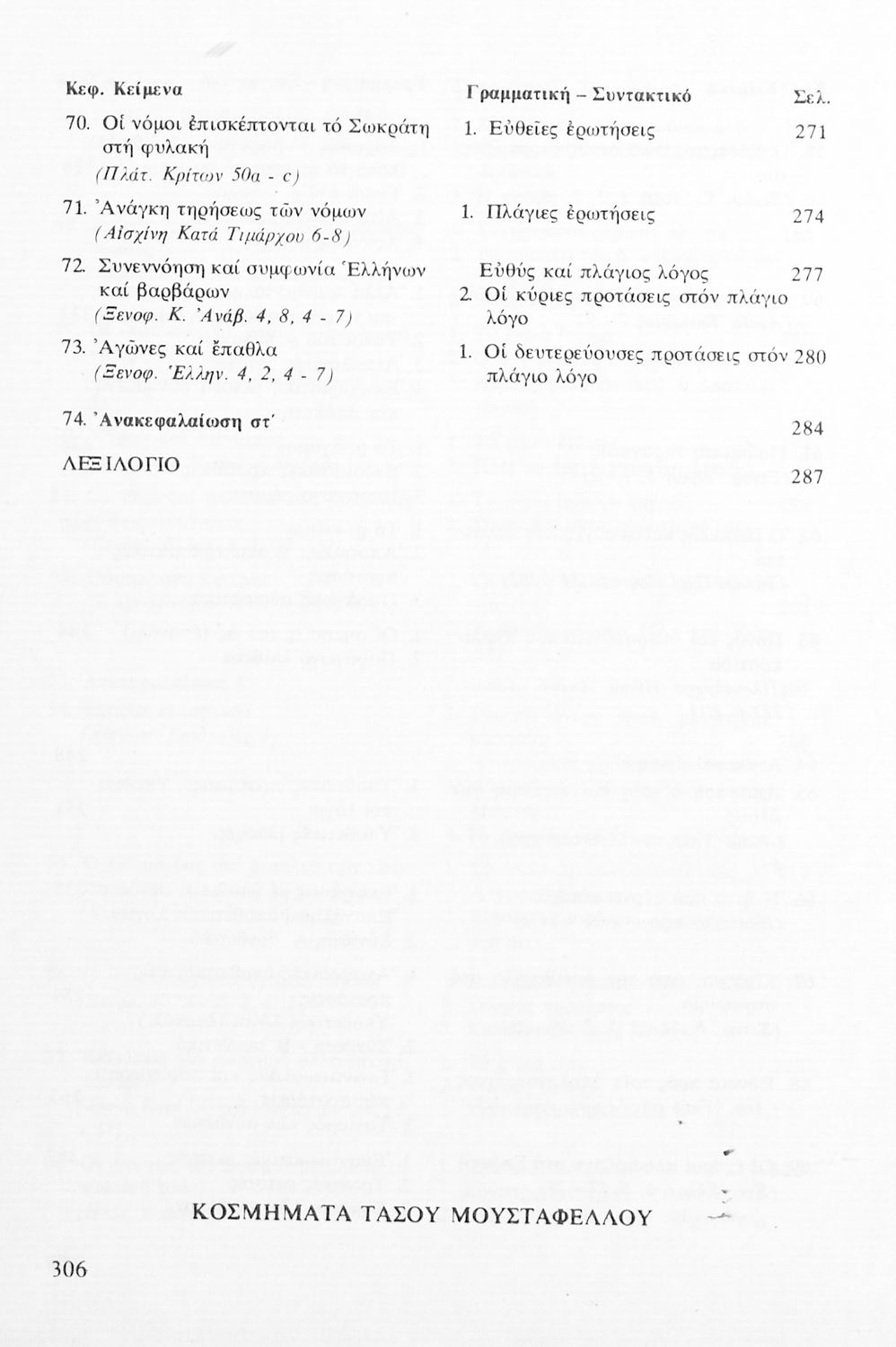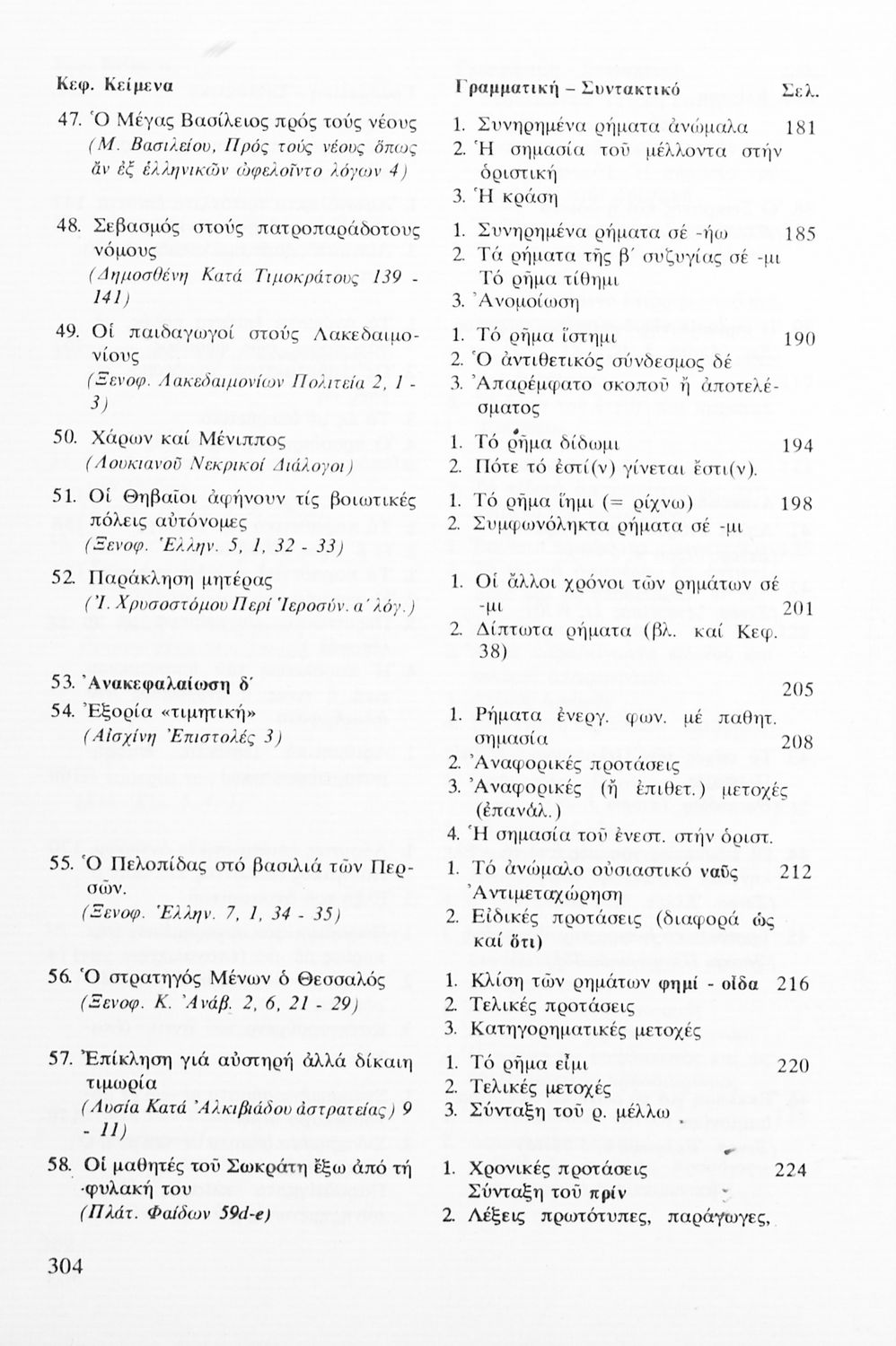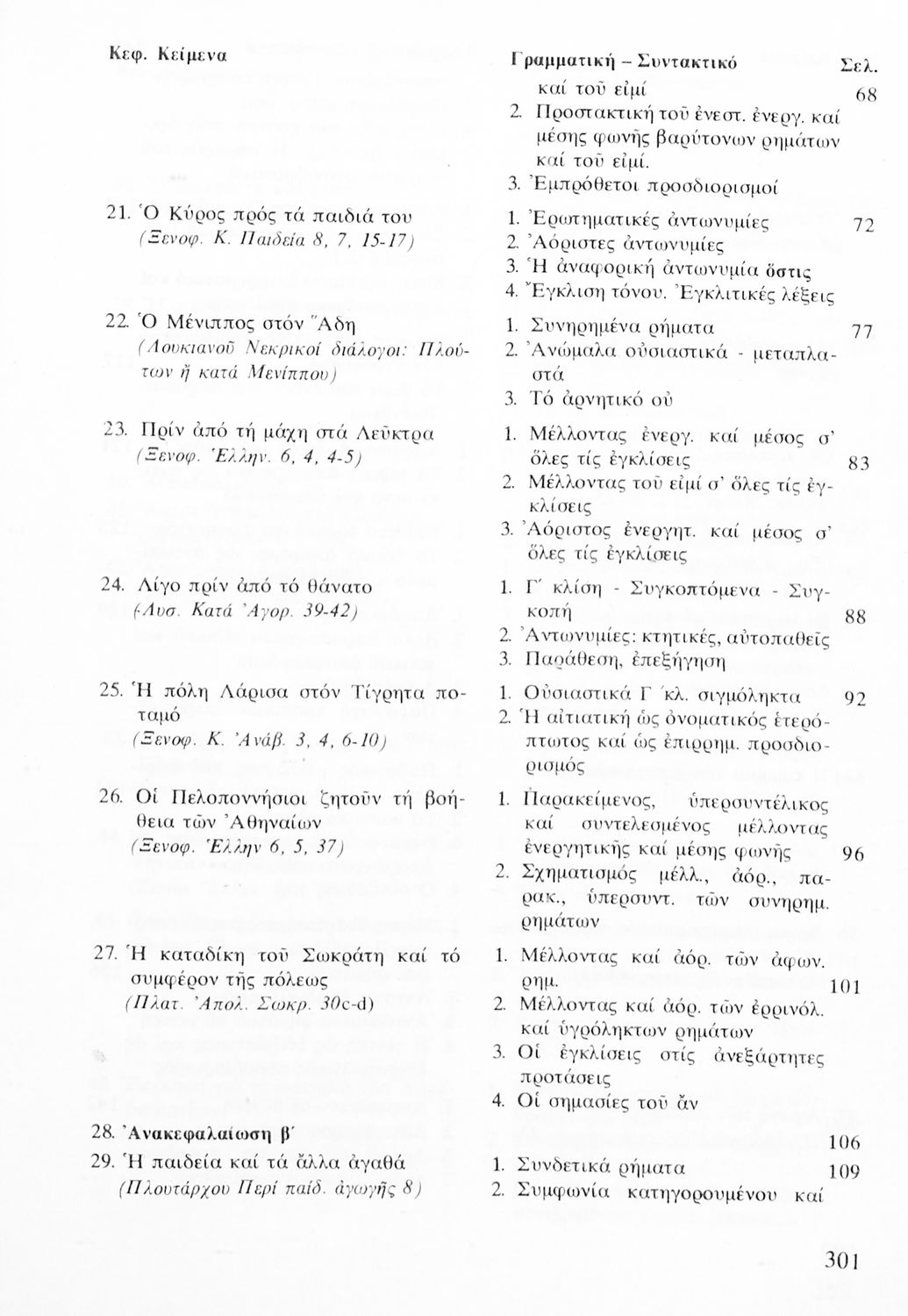 Σχολικό εγχειρίδιο Αρχαίων Ελληνικών Α' Λυκείου που περιλαμβάνει αποσπάσματα από κείμενα αρχαίων Ελλήνων συγγραφέων και γραμματικές, συντακτικές και ερμηνευτικές σημειώσεις. Περιέχει και ασκήσεις γραμματικής.