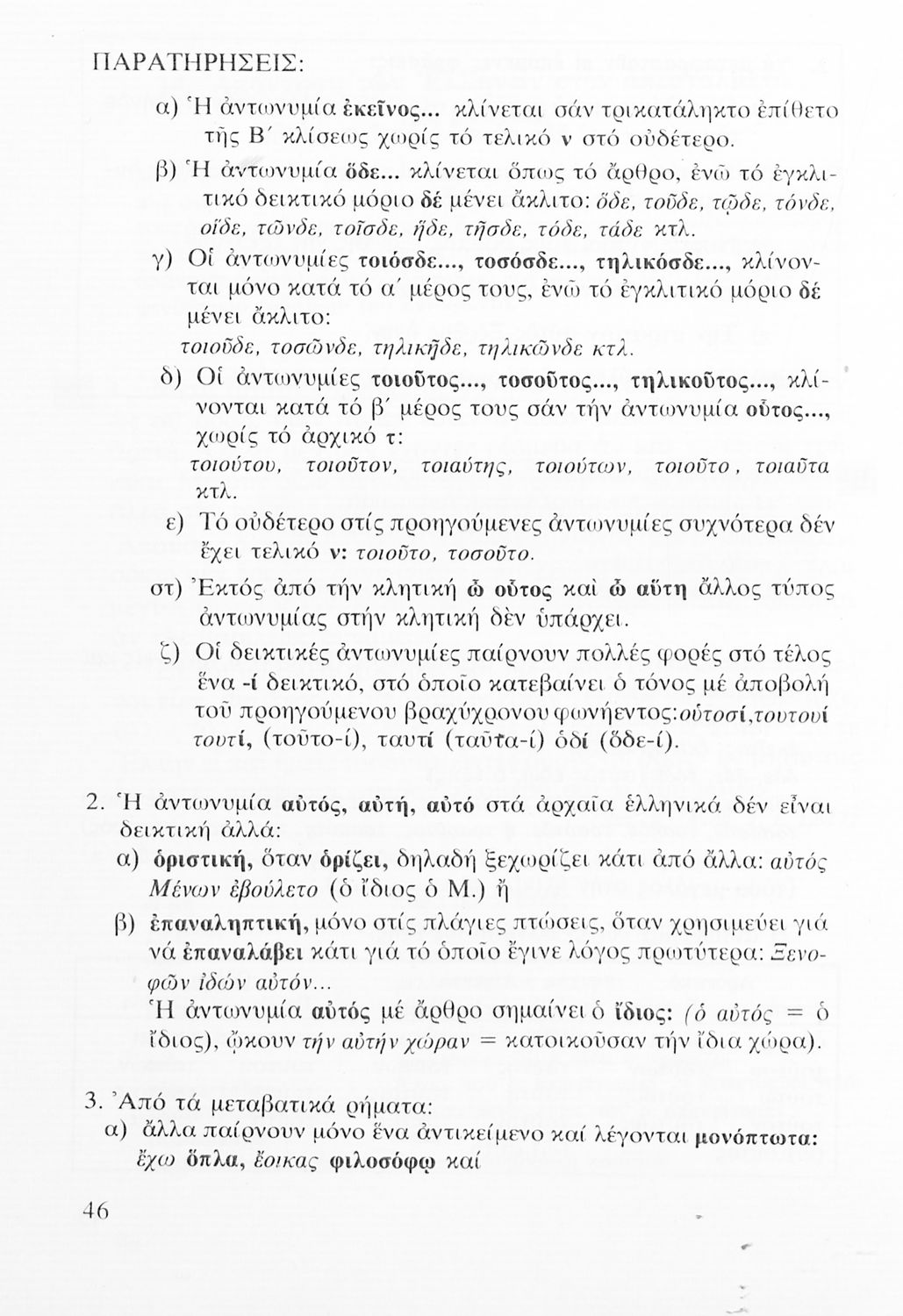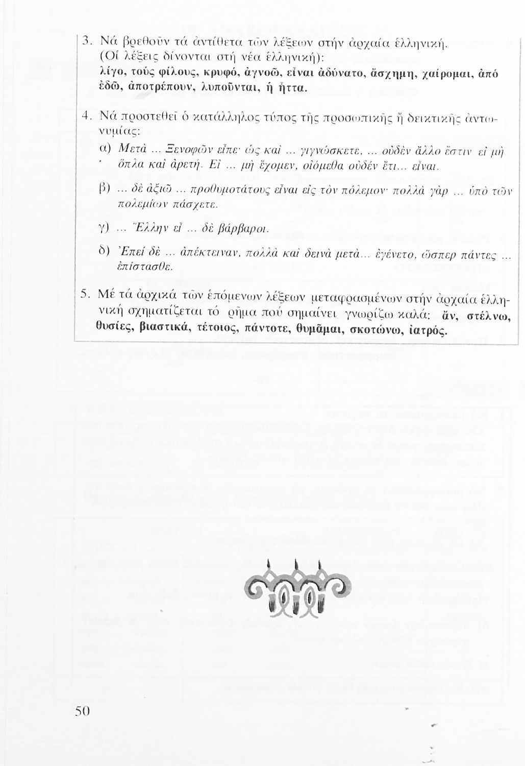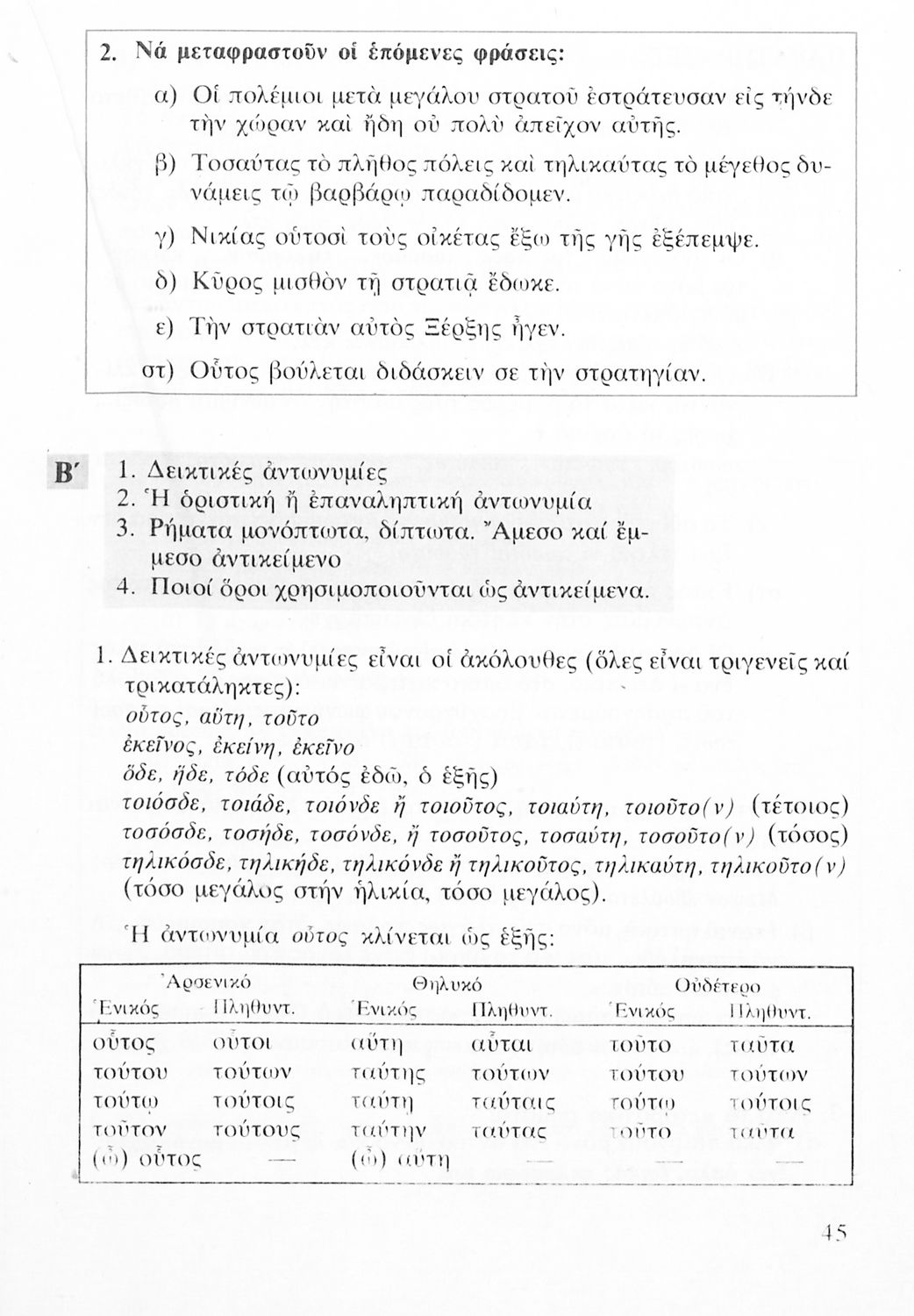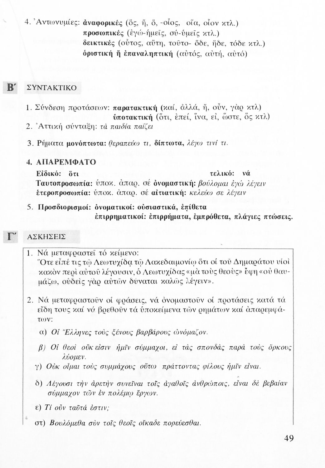 Σχολικό εγχειρίδιο Αρχαίων Ελληνικών για τις Α΄, Β΄ και Γ΄ Λυκείου που εξετάζει τα μέρη του λόγου και την σύνταξή τους.