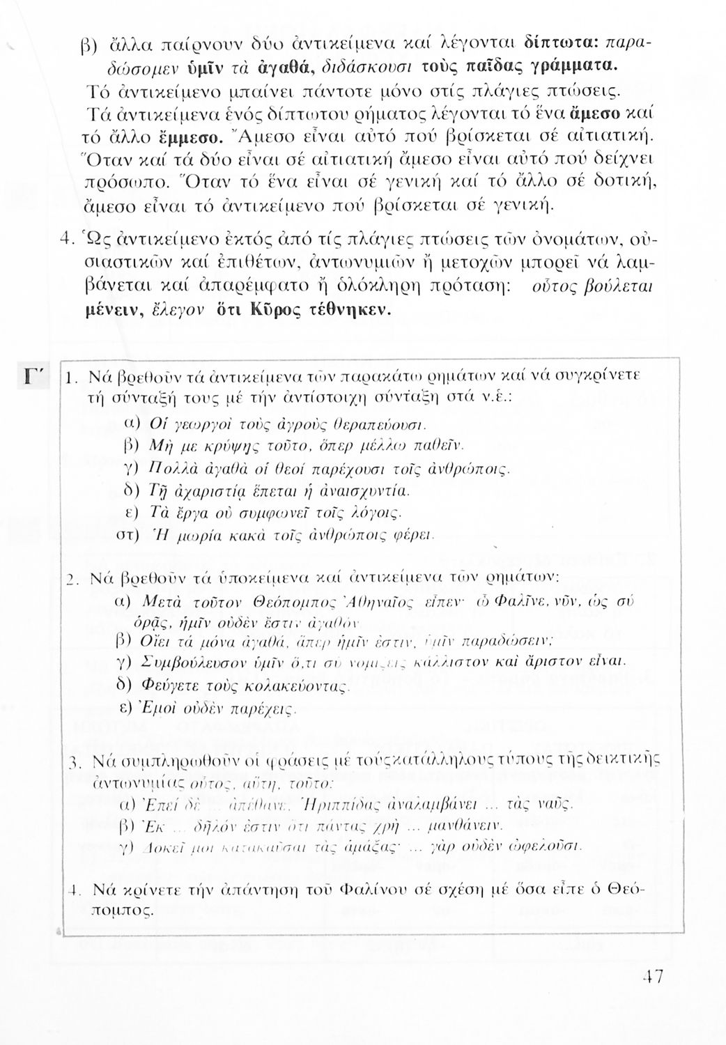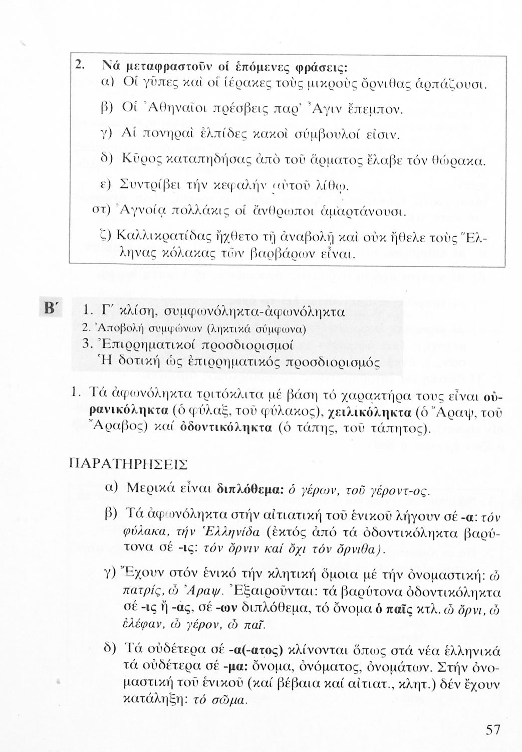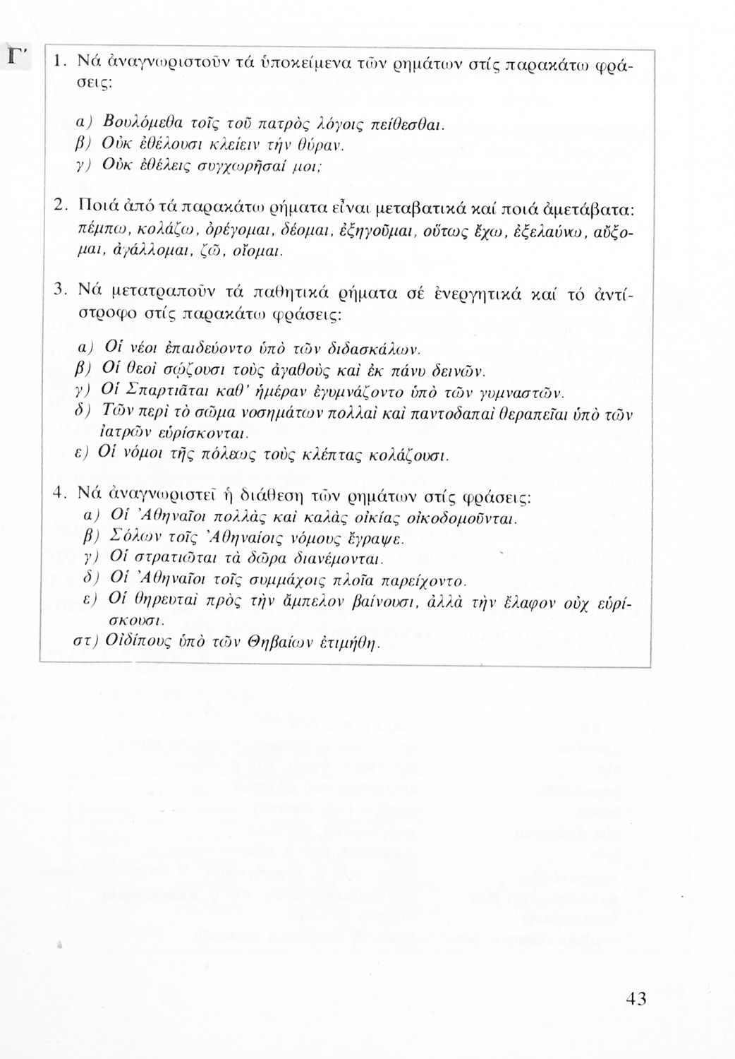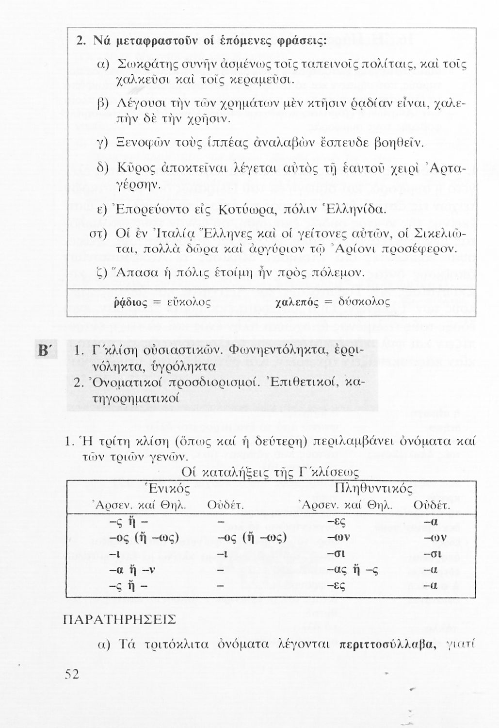 Σχολικό εγχειρίδιο Αρχαίων Ελληνικών για τις Α΄, Β΄ και Γ΄ Λυκείου που εξετάζει τα μέρη του λόγου και την σύνταξή τους.