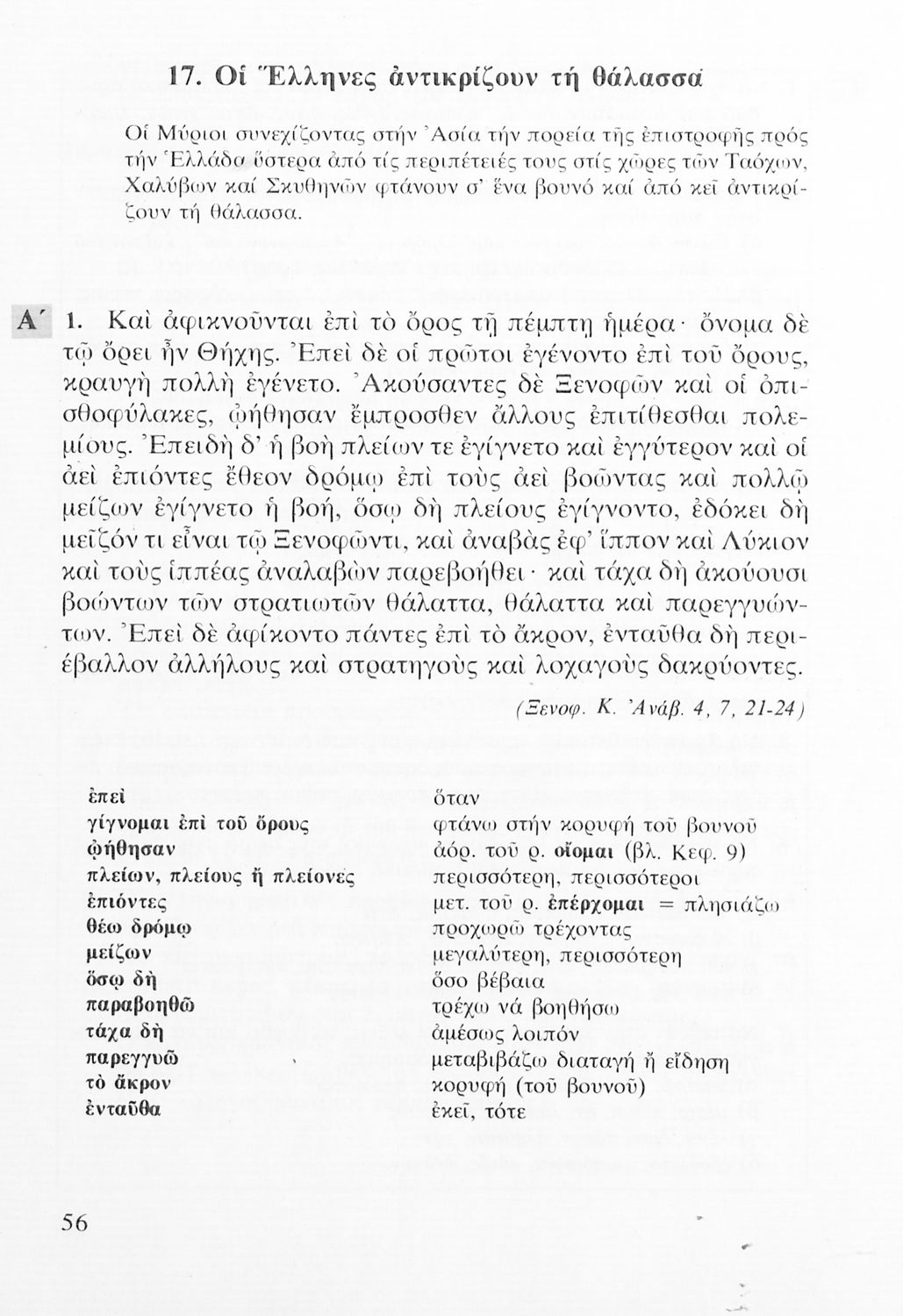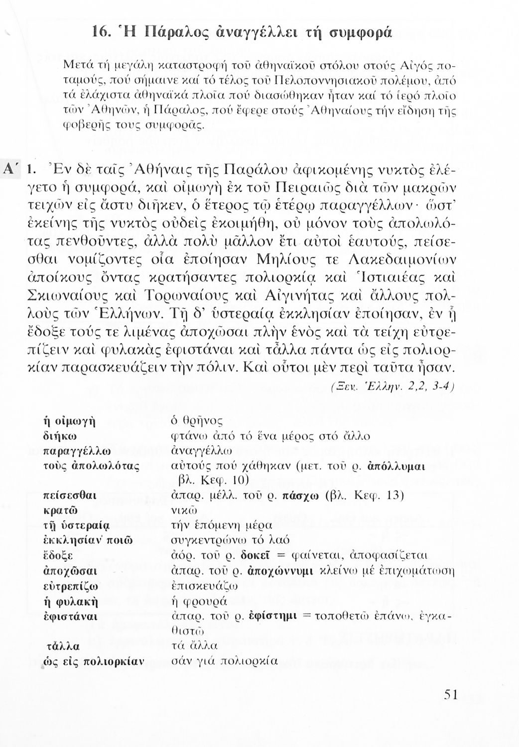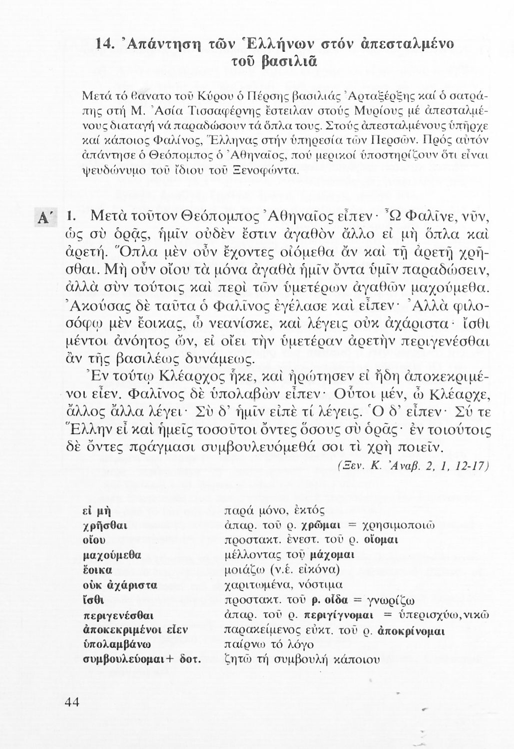 Σχολικό εγχειρίδιο Αρχαίων ελληνικών Α΄ Λυκείου που περιλαμβάνει αποσπάσματα από τα Ελληνικά του Ξενοφώντα, εισαγωγή στη ζωή και το έργο του, ερμηνευτικές σημειώσεις, τοπογραφικούς πίνακες και σχεδιαγράμματα ...