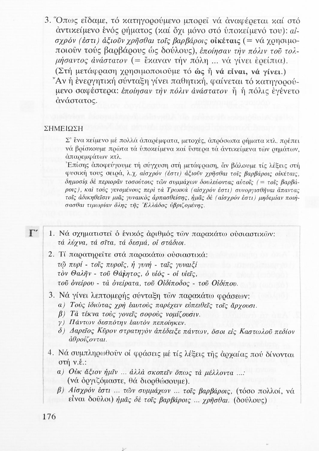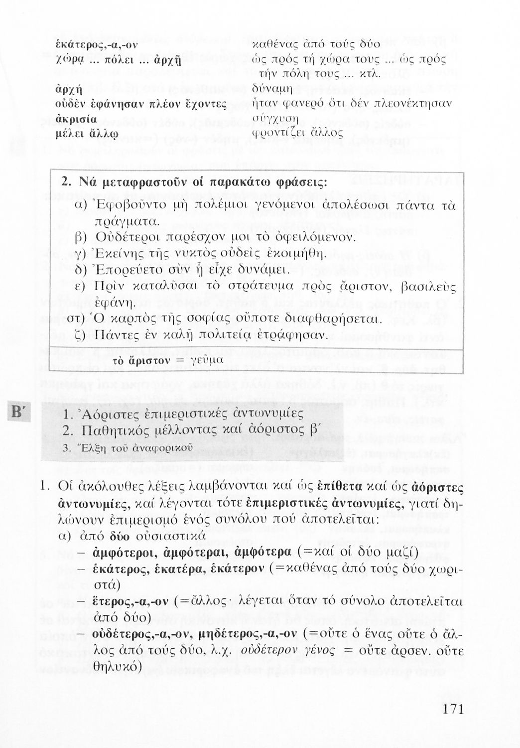Σχολικό εγχειρίδιο Αρχαίων Ελληνικών για τις Α΄, Β΄ και Γ΄ Λυκείου που εξετάζει τα μέρη του λόγου και την σύνταξή τους.