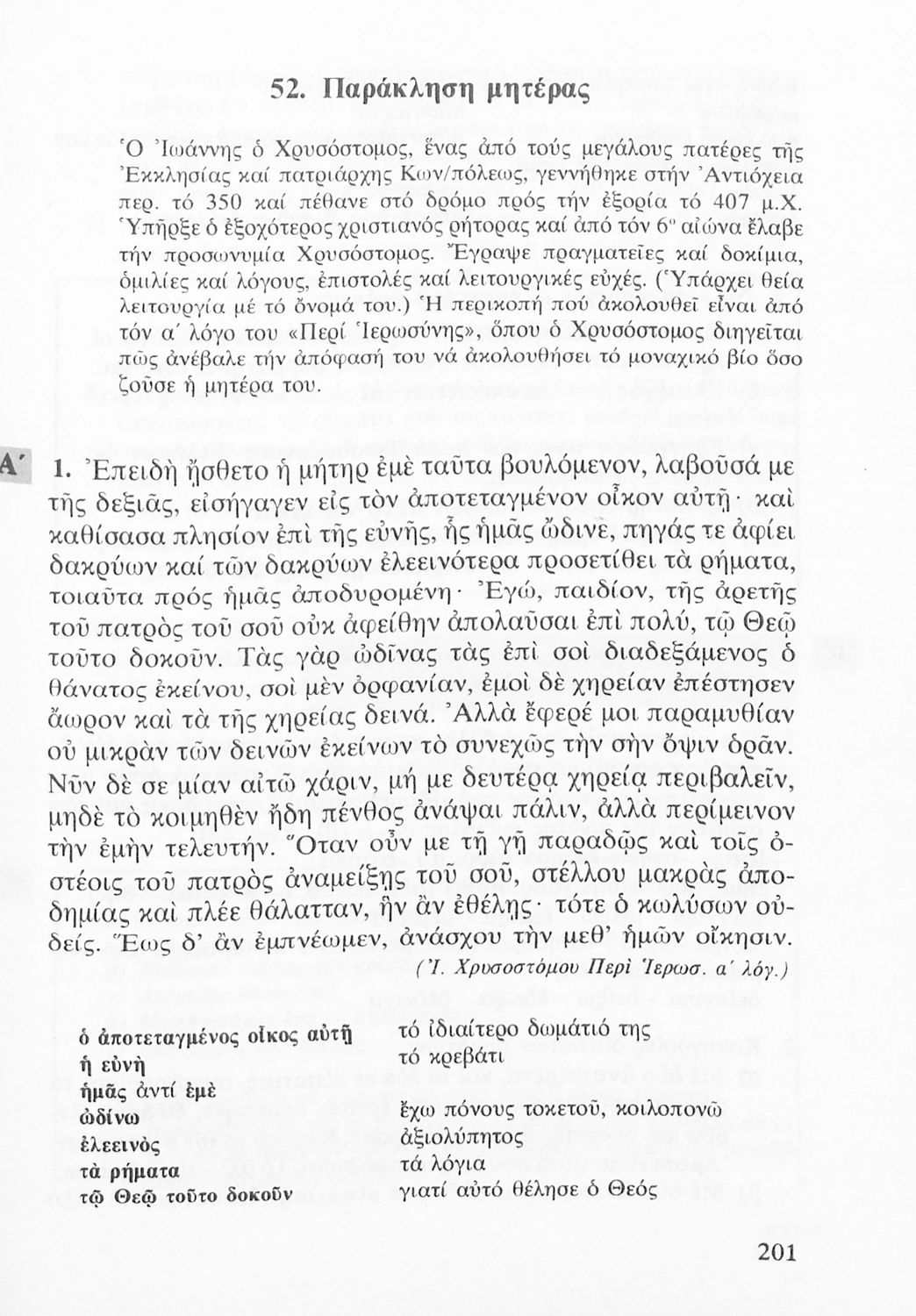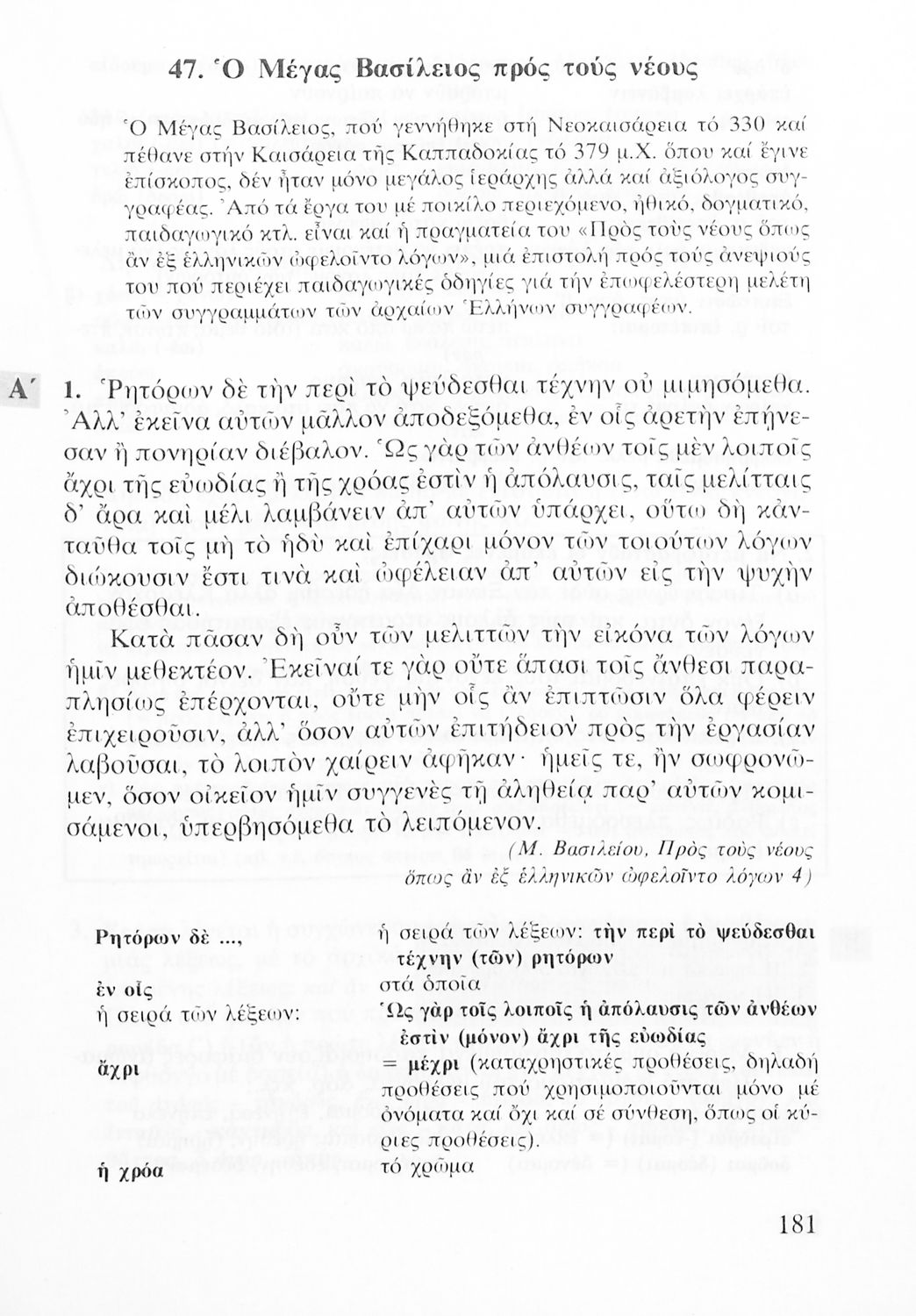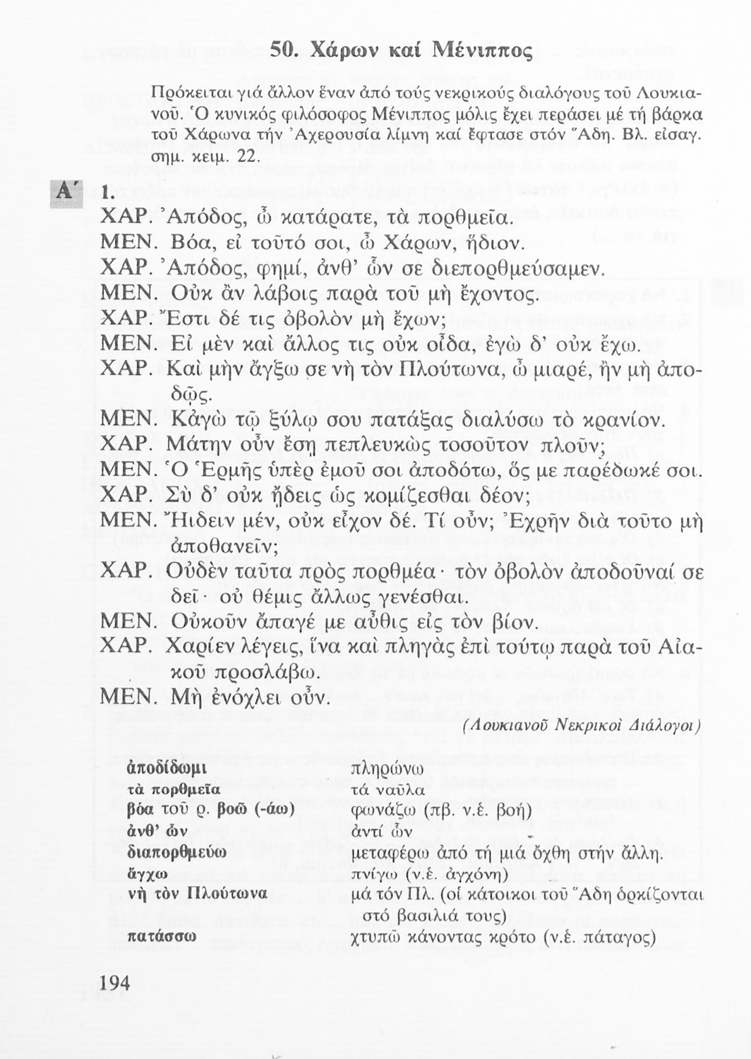 Σχολικό εγχειρίδιο Αρχαίων Ελληνικών Α' Λυκείου που περιλαμβάνει αποσπάσματα από κείμενα αρχαίων Ελλήνων συγγραφέων και γραμματικές, συντακτικές και ερμηνευτικές σημειώσεις. Περιέχει και ασκήσεις γραμματικής.