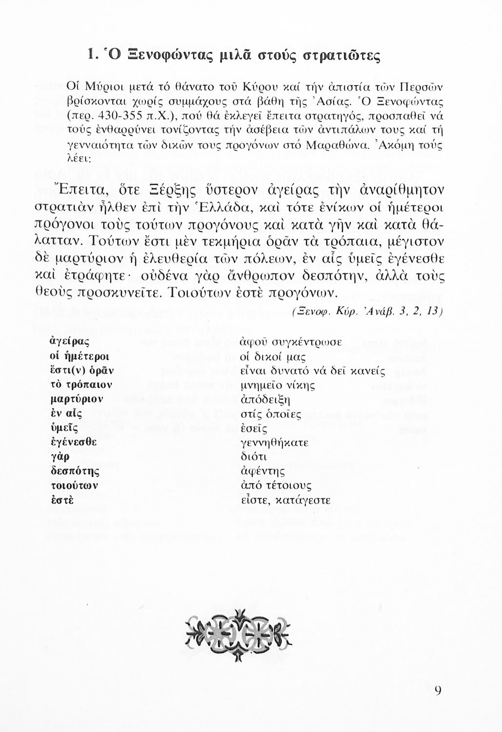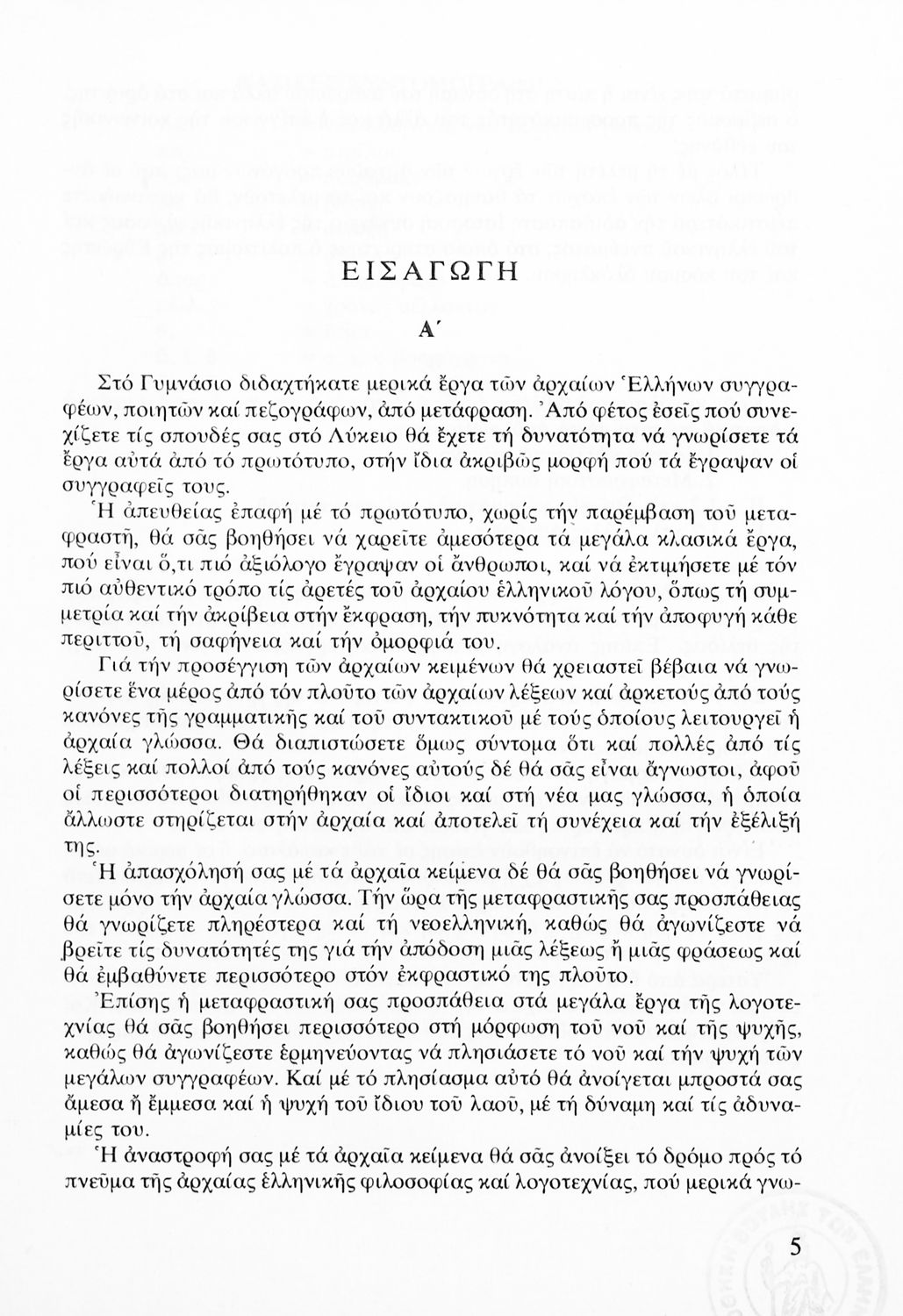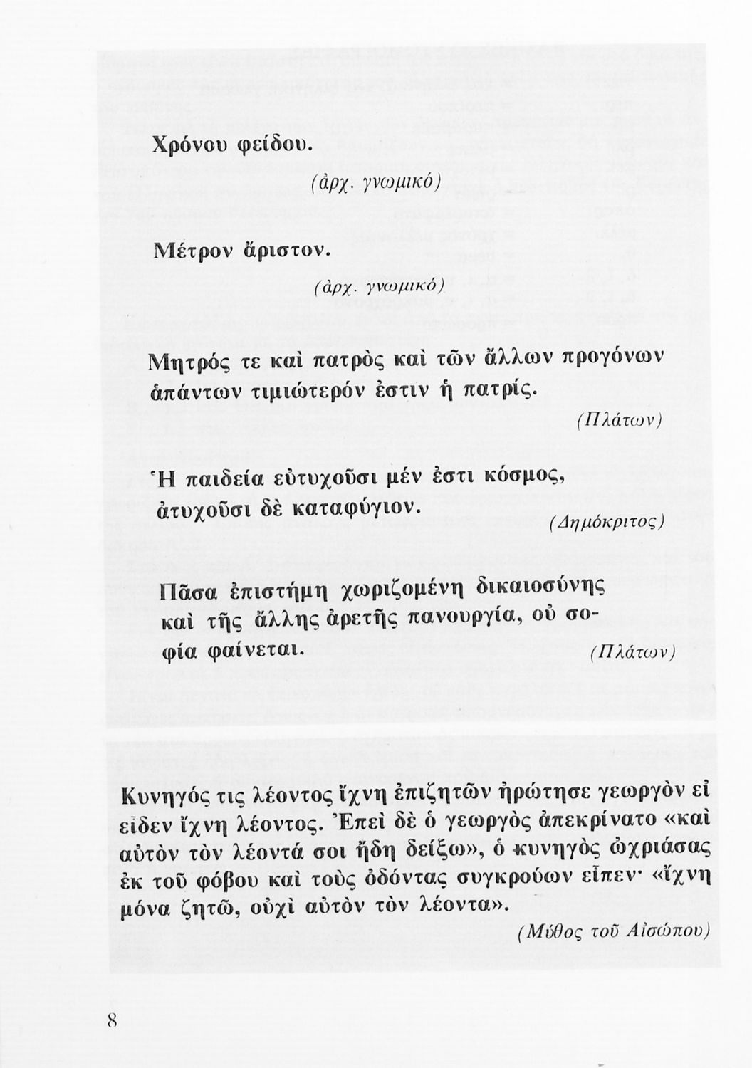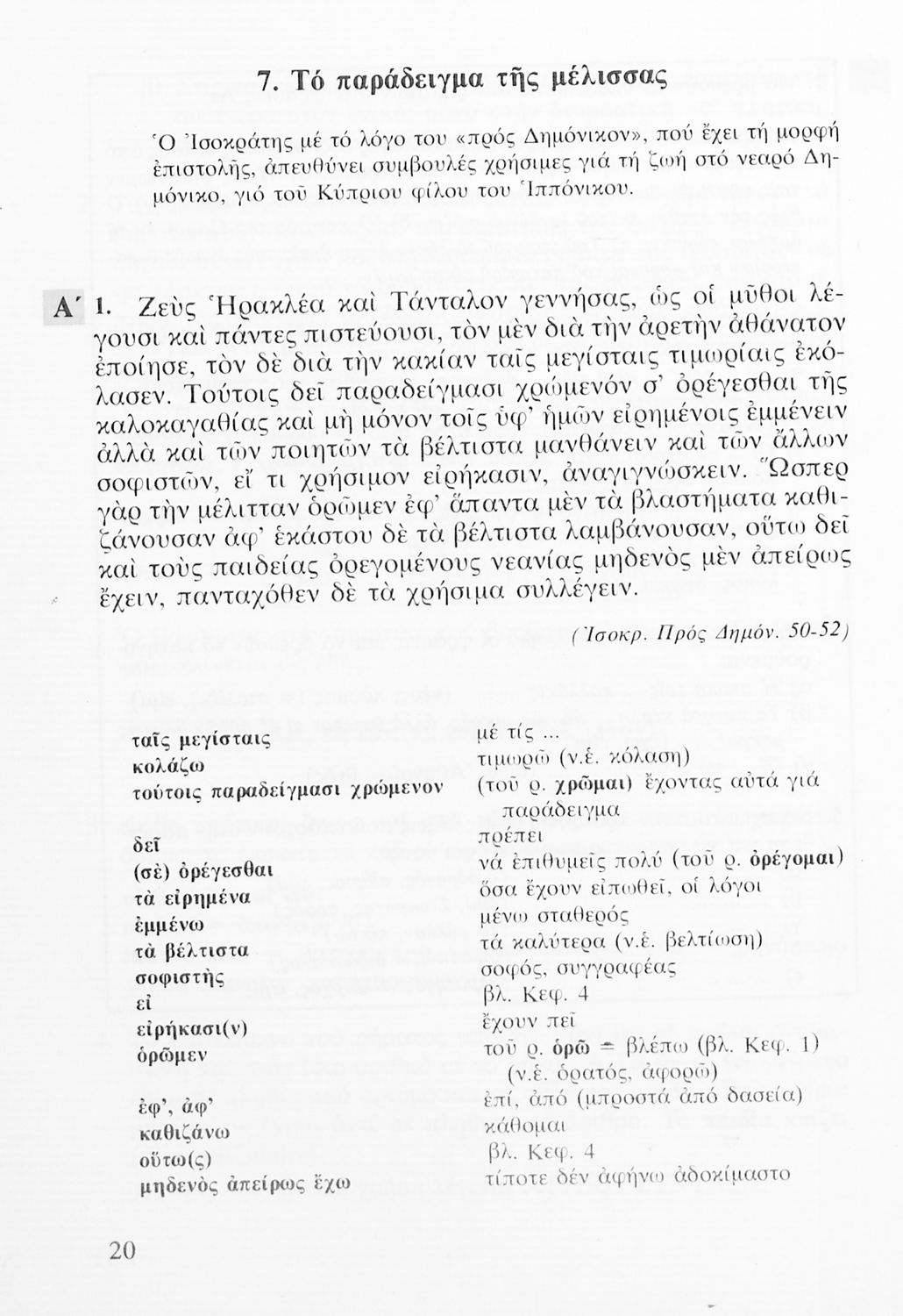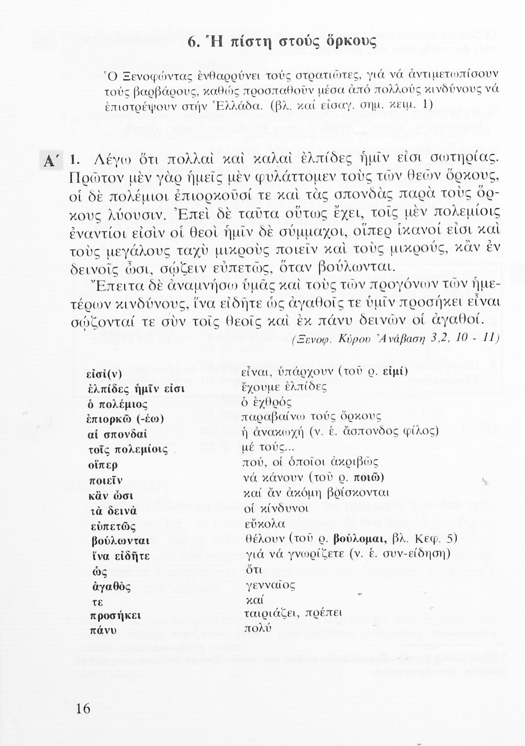 Σχολικό εγχειρίδιο Αρχαίων Ελληνικών Α' Λυκείου που περιλαμβάνει αποσπάσματα από κείμενα αρχαίων Ελλήνων συγγραφέων και γραμματικές, συντακτικές και ερμηνευτικές σημειώσεις. Περιέχει και ασκήσεις γραμματικής.