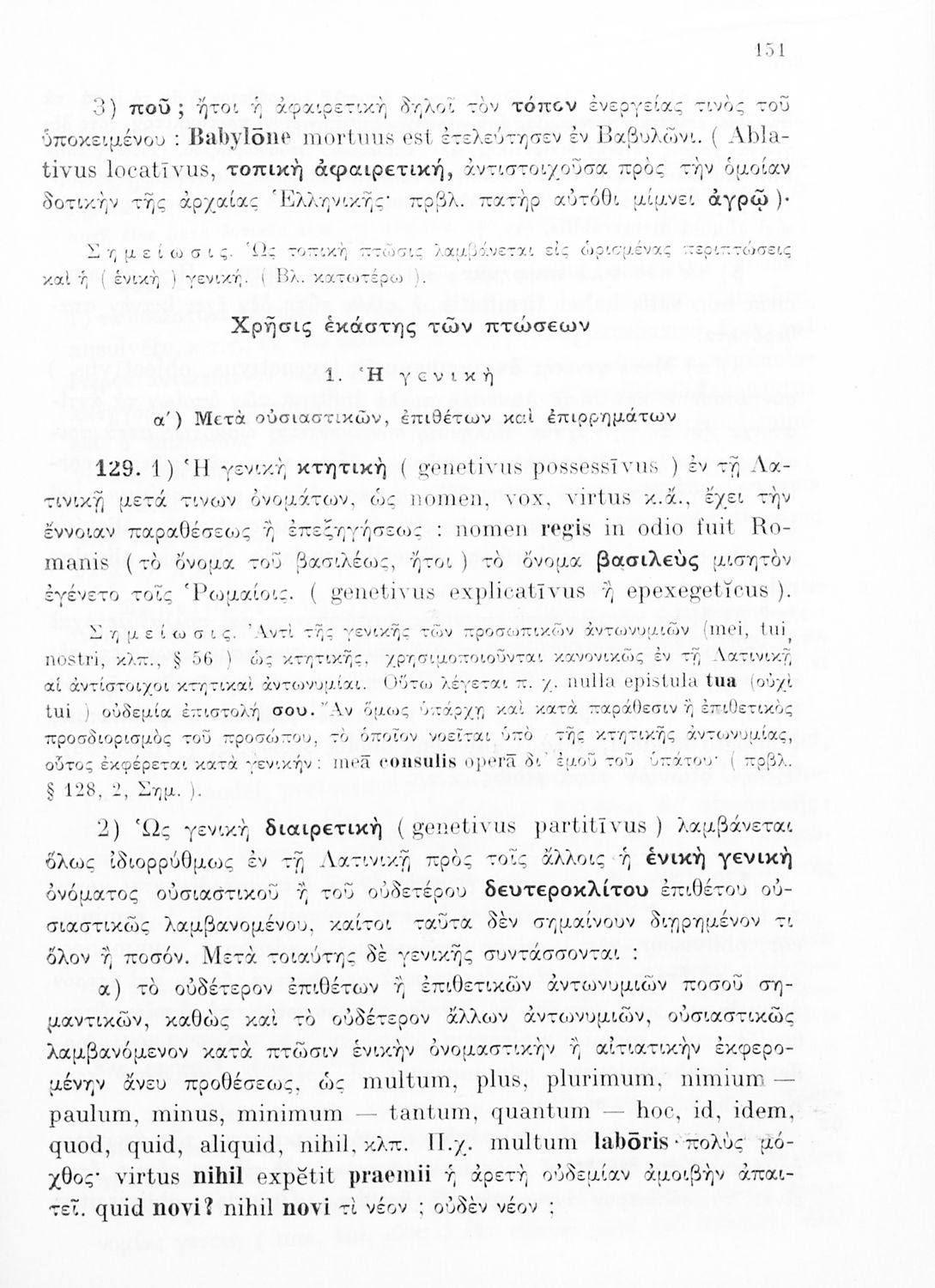 Γραμματικής της λατινικής γλώσσας για τα Ελληνικά Σχολεία και Γυμνάσια που περιέχει δύο τμήματα: το τεχνολογικό που εστιάζει στα μέρη του λόγου και το συντακτικό που ασχολείται με τις πτώσεις, τις εγκλίσεις, ...