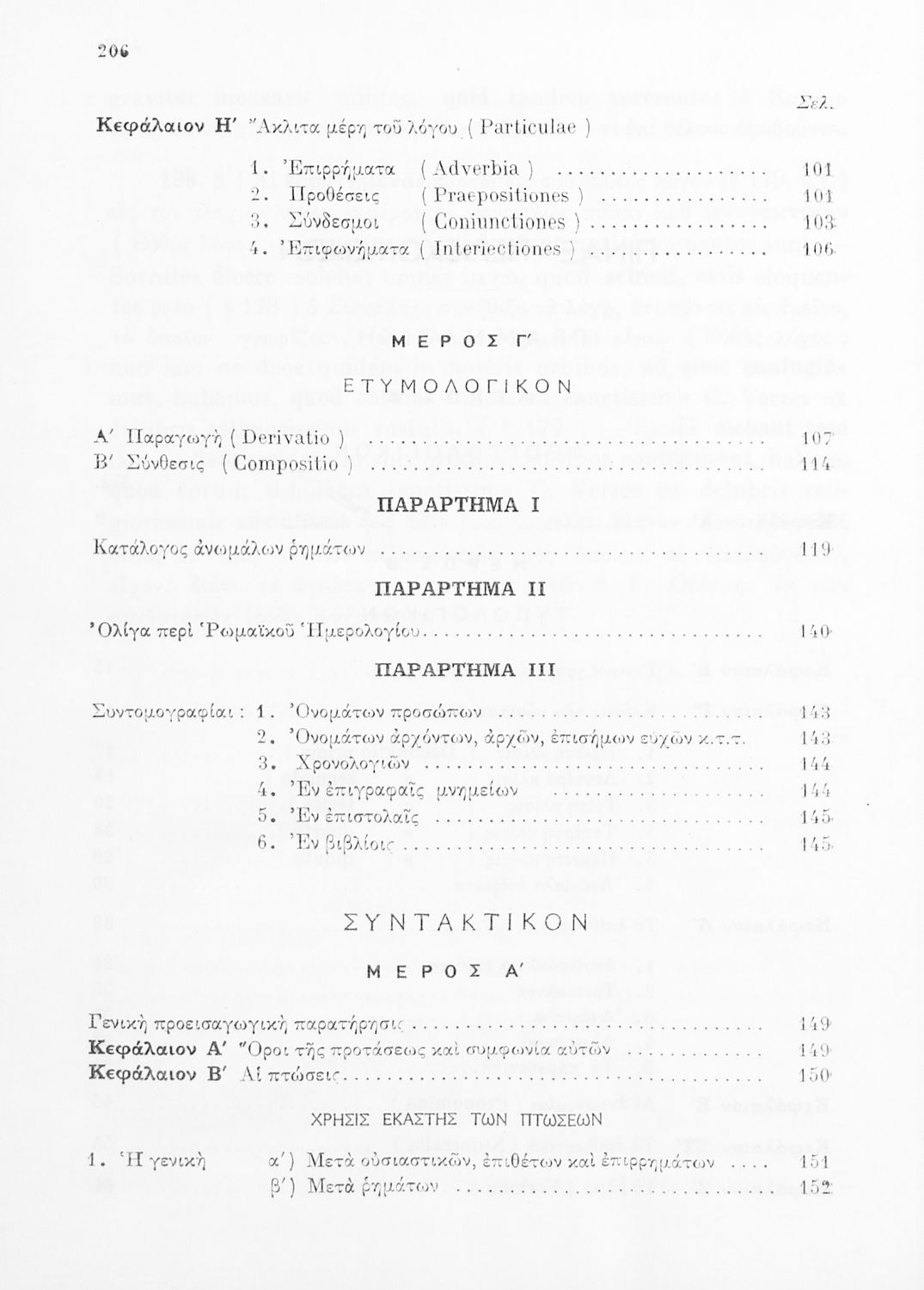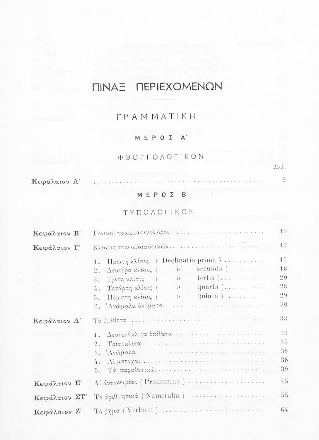 Σχολικό εγχειρίδιο Λατινικών Γυμνασίου που περιλαμβάνει γραμματική και συντακτικό και είναι χωρισμένο σε φθογγολογικό, τυπολογικό και ετυμολογικό μέρος.