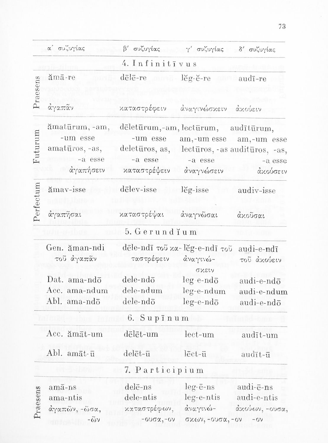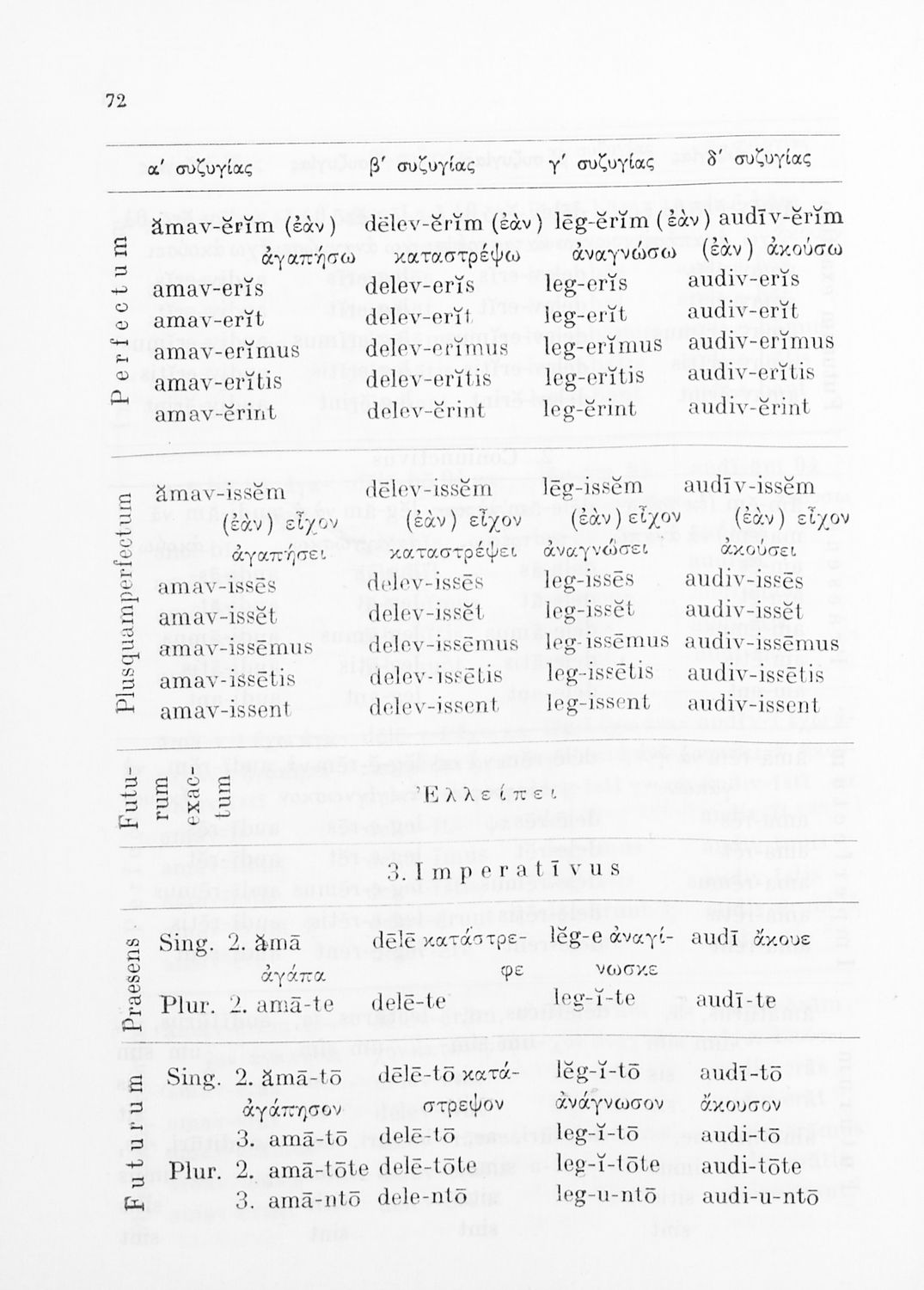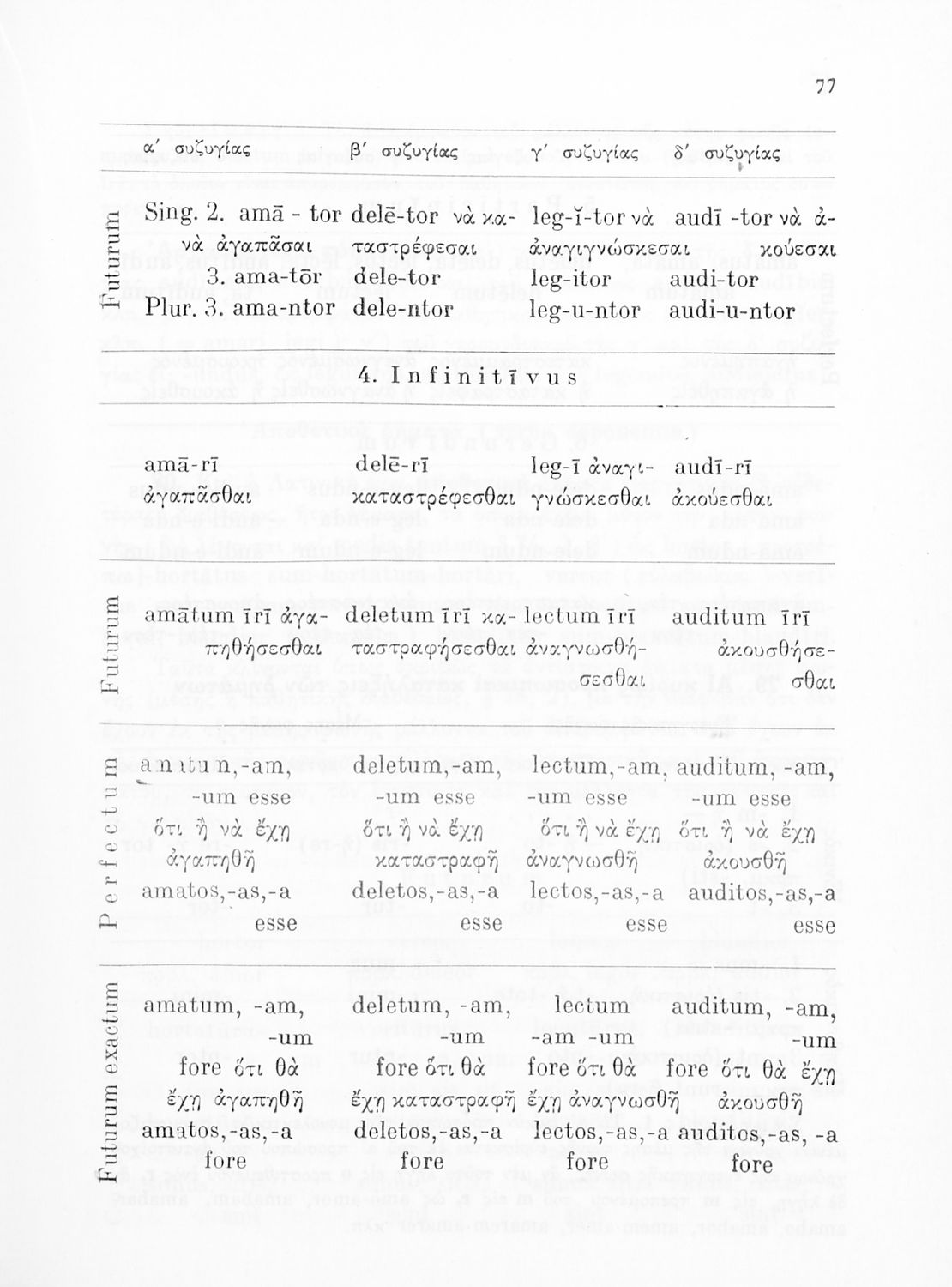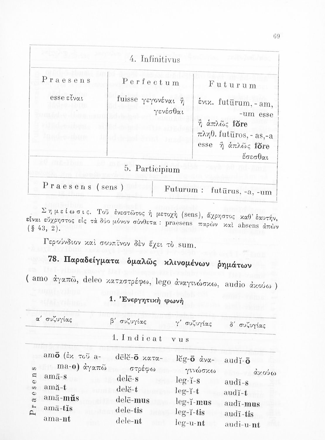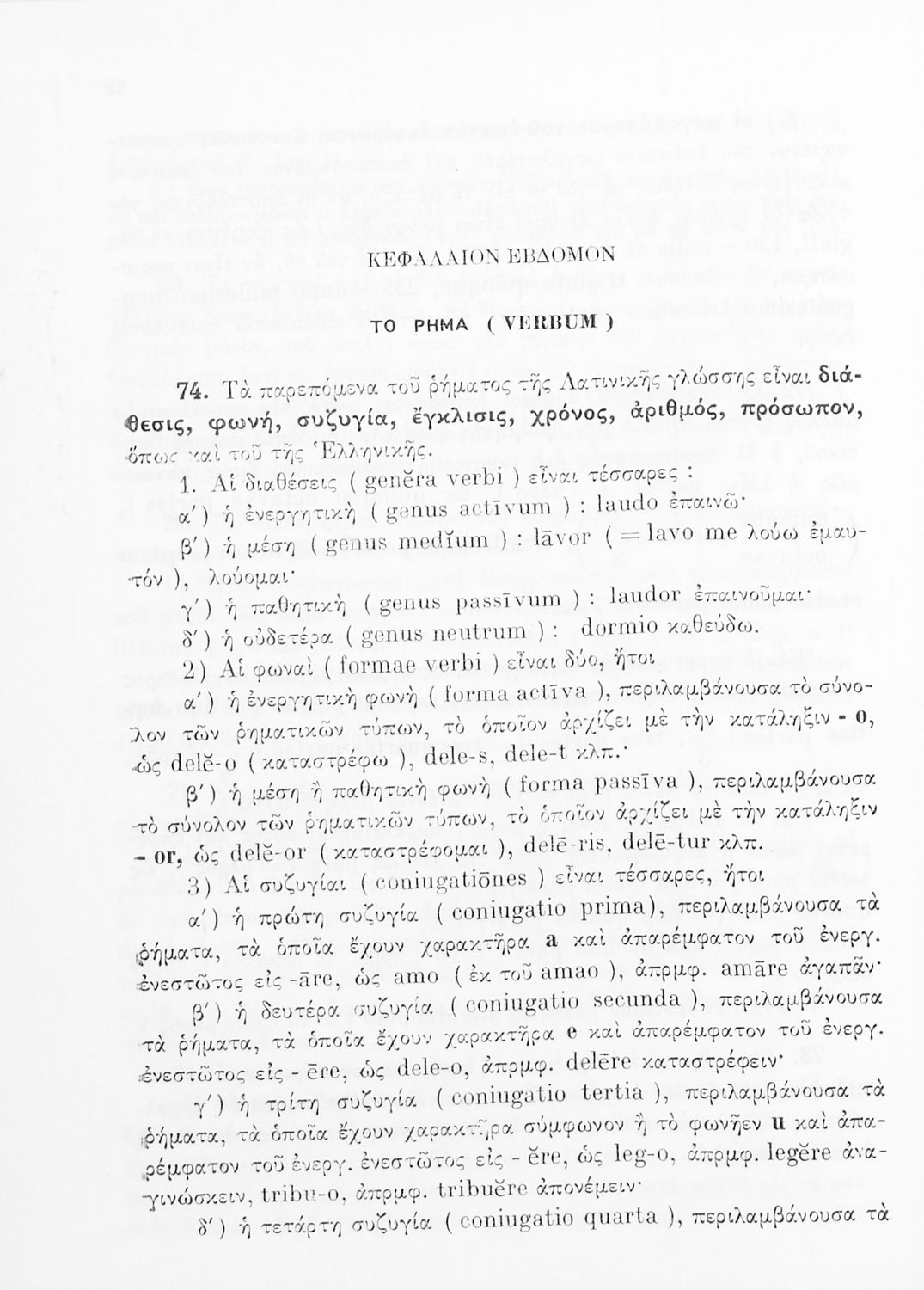 Σχολικό εγχειρίδιο Λατινικών Γυμνασίου που περιλαμβάνει γραμματική και συντακτικό και είναι χωρισμένο σε φθογγολογικό, τυπολογικό και ετυμολογικό μέρος.