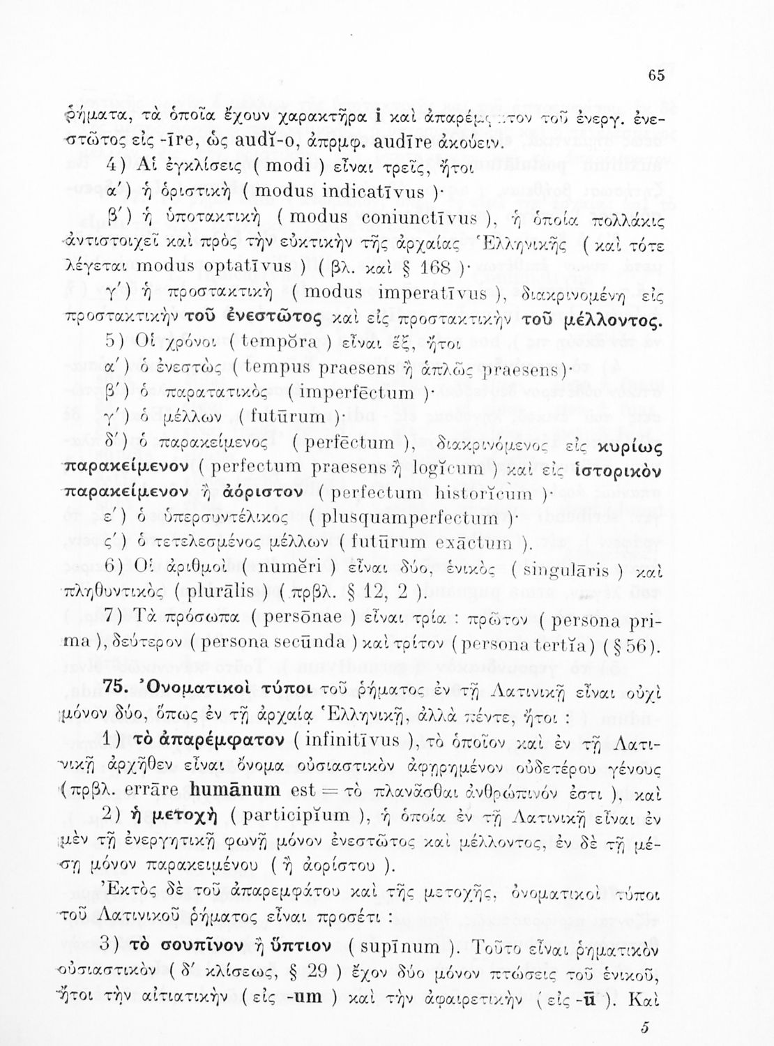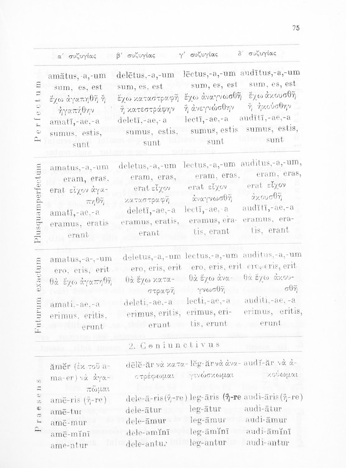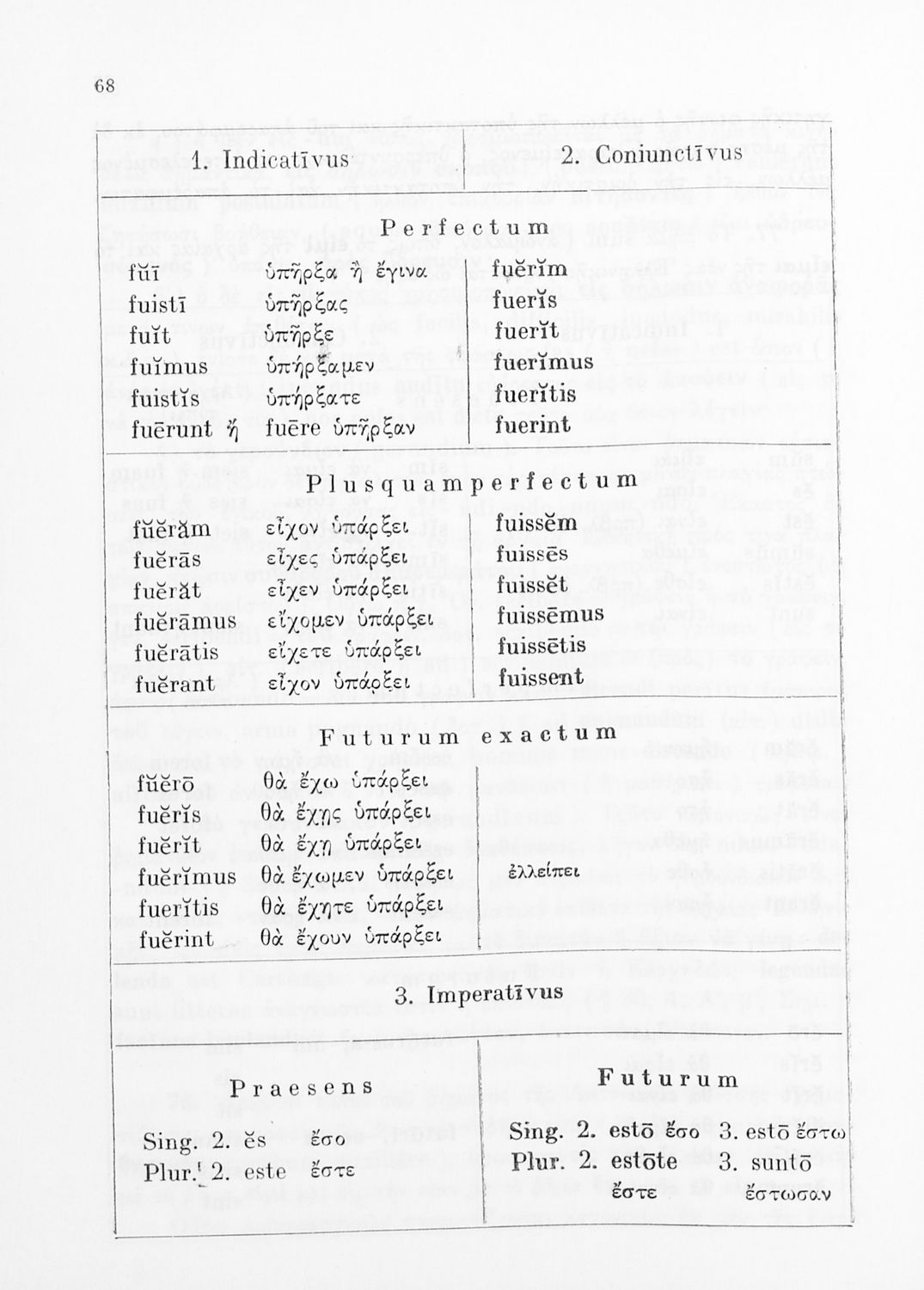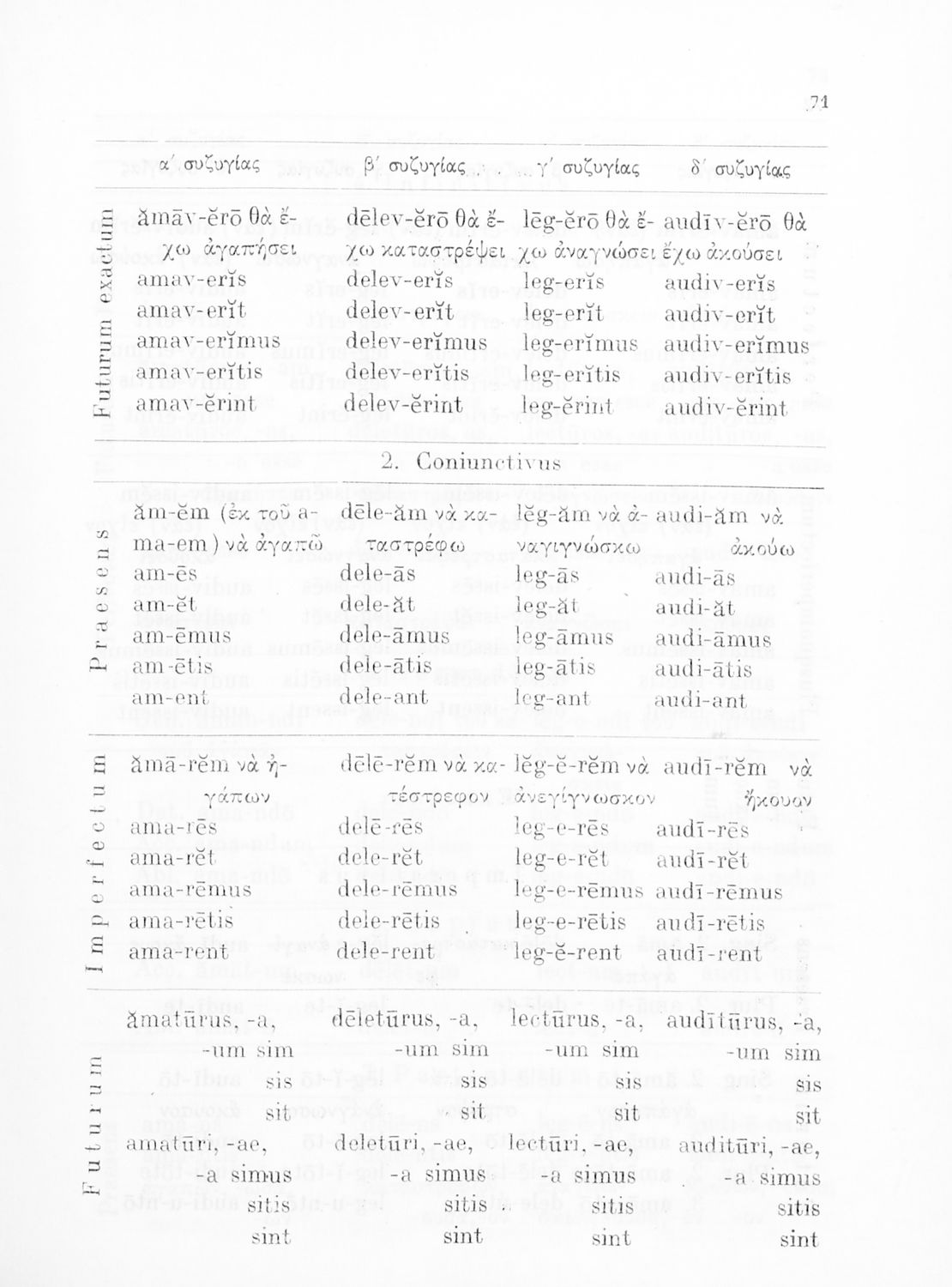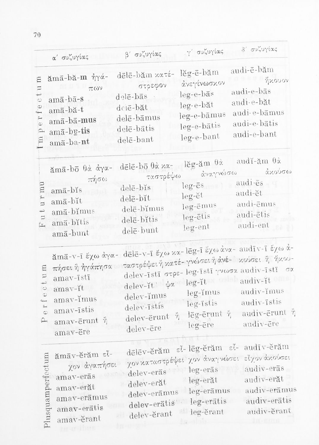Σχολικό εγχειρίδιο Λατινικών Γυμνασίου που περιλαμβάνει γραμματική και συντακτικό και είναι χωρισμένο σε φθογγολογικό, τυπολογικό και ετυμολογικό μέρος.