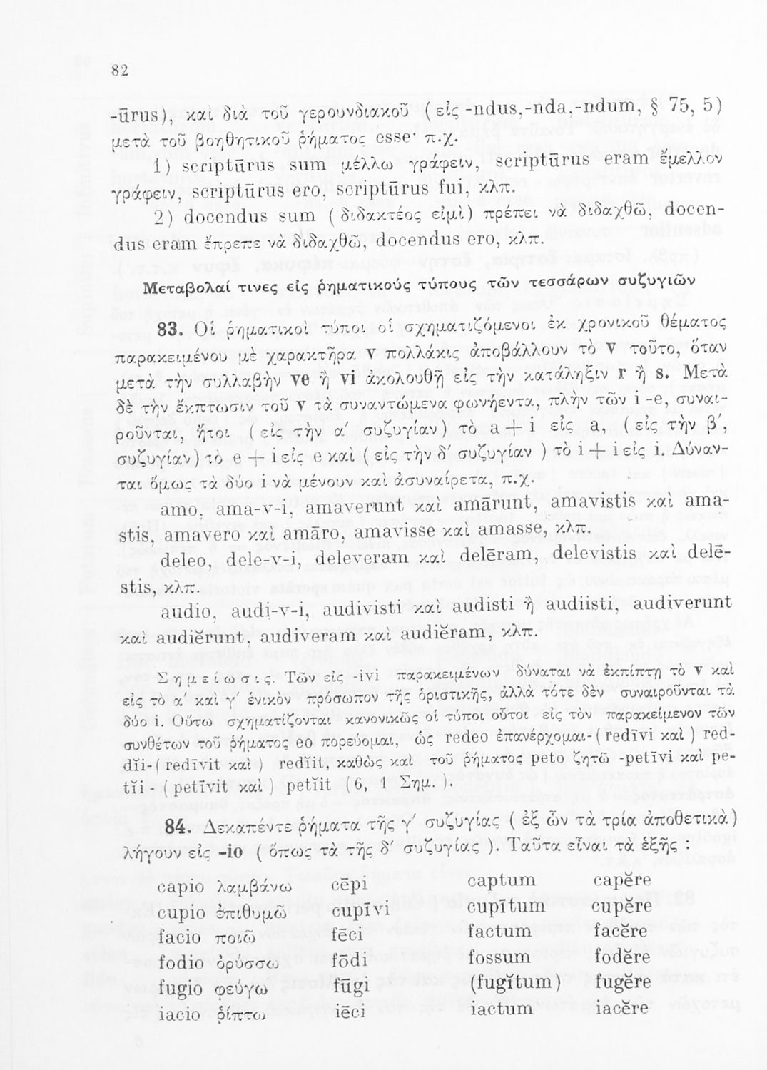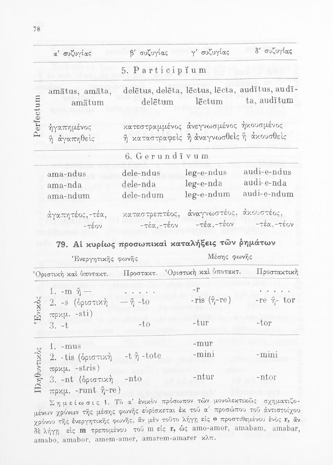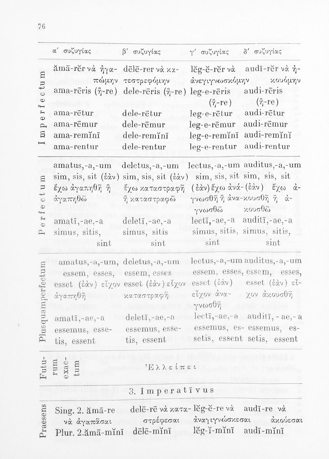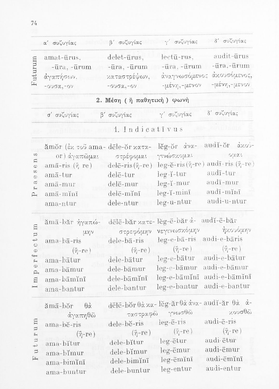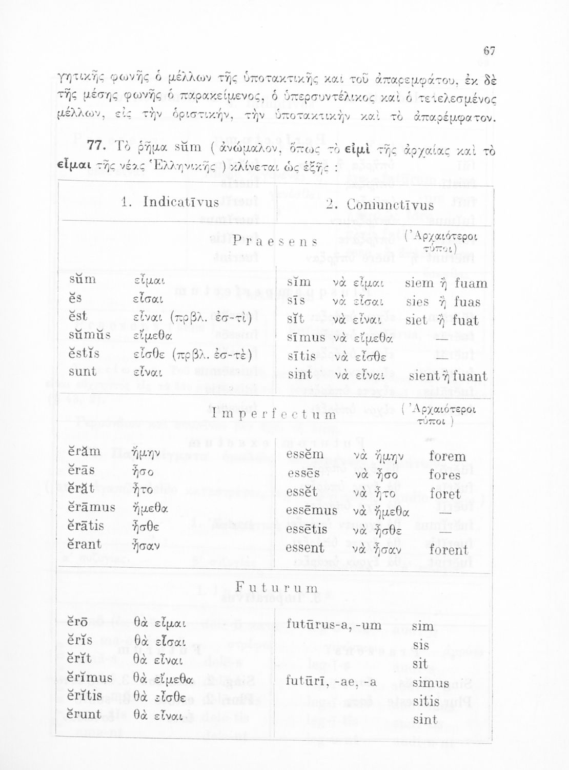 Σχολικό εγχειρίδιο Λατινικών Γυμνασίου που περιλαμβάνει γραμματική και συντακτικό και είναι χωρισμένο σε φθογγολογικό, τυπολογικό και ετυμολογικό μέρος.