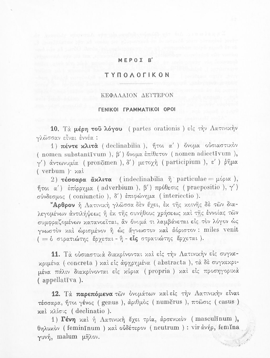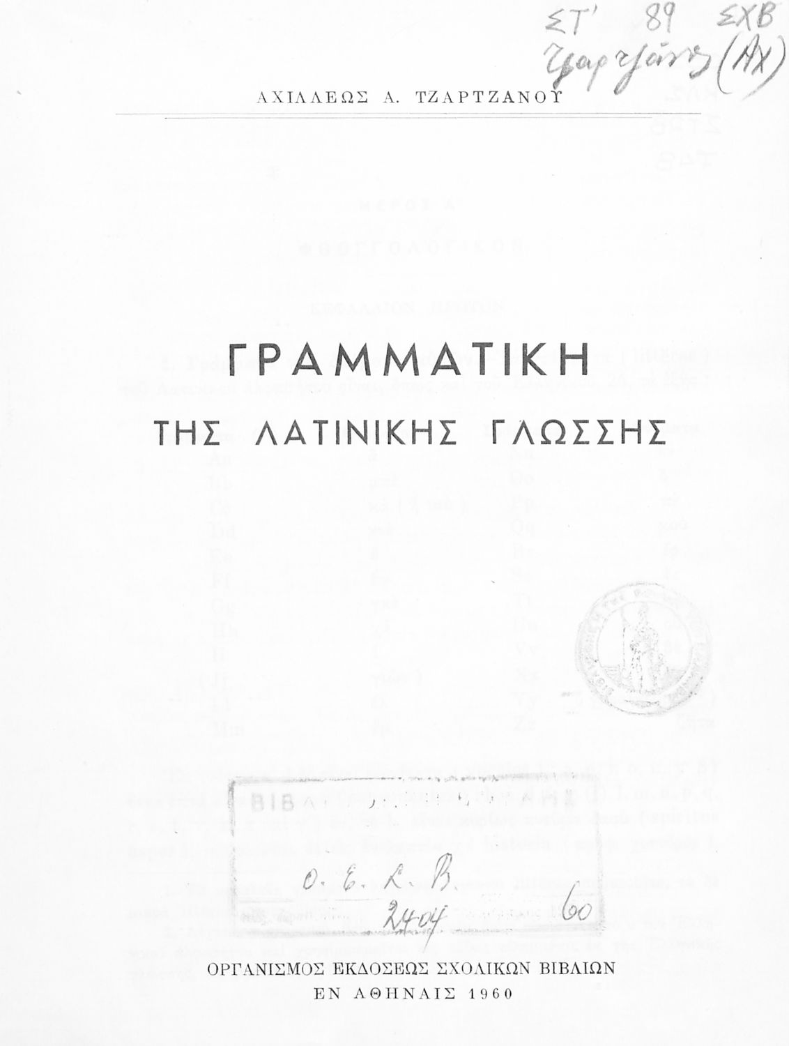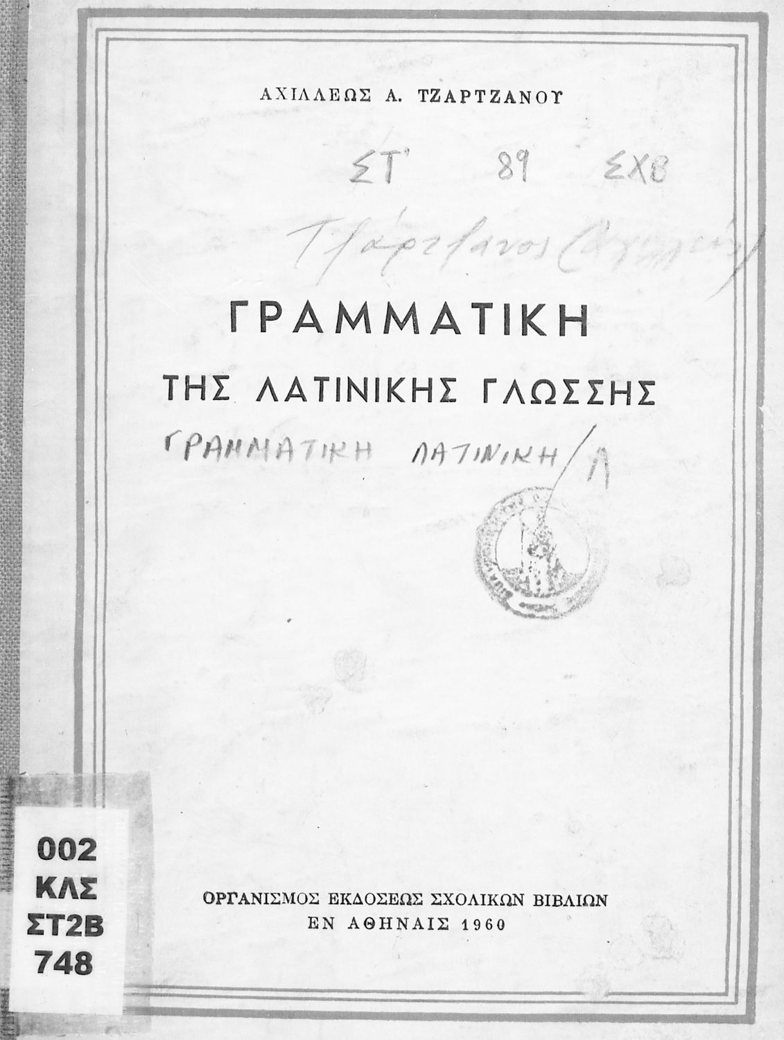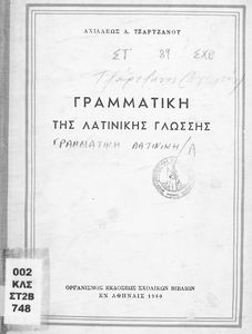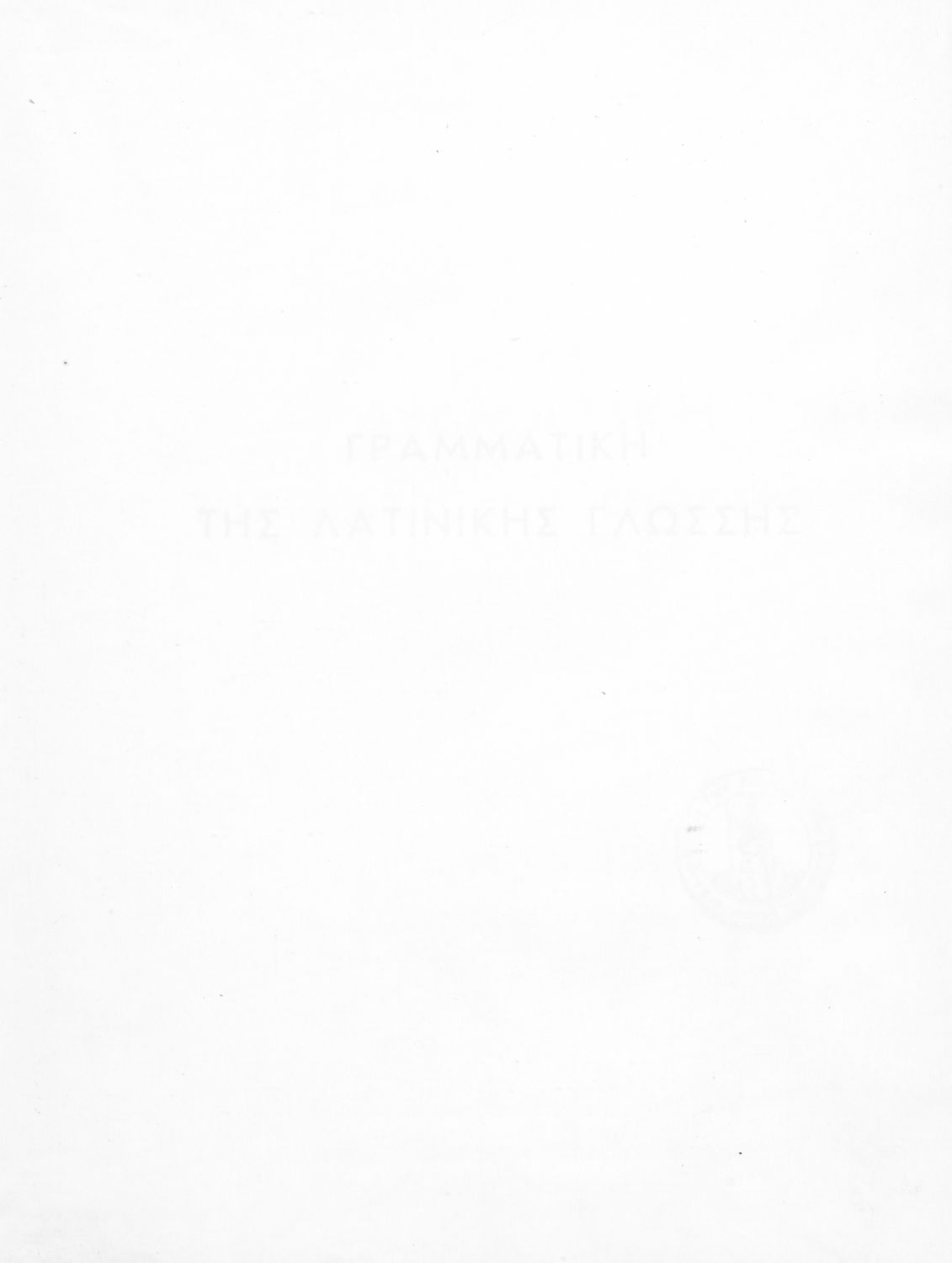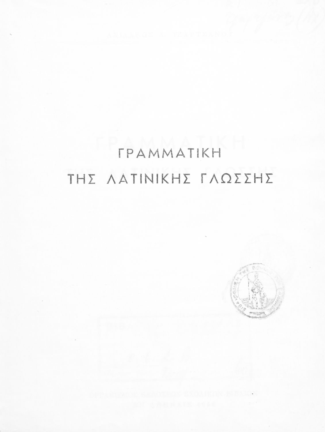 Σχολικό εγχειρίδιο Λατινικών Γυμνασίου που περιλαμβάνει γραμματική και συντακτικό και είναι χωρισμένο σε φθογγολογικό, τυπολογικό και ετυμολογικό μέρος.