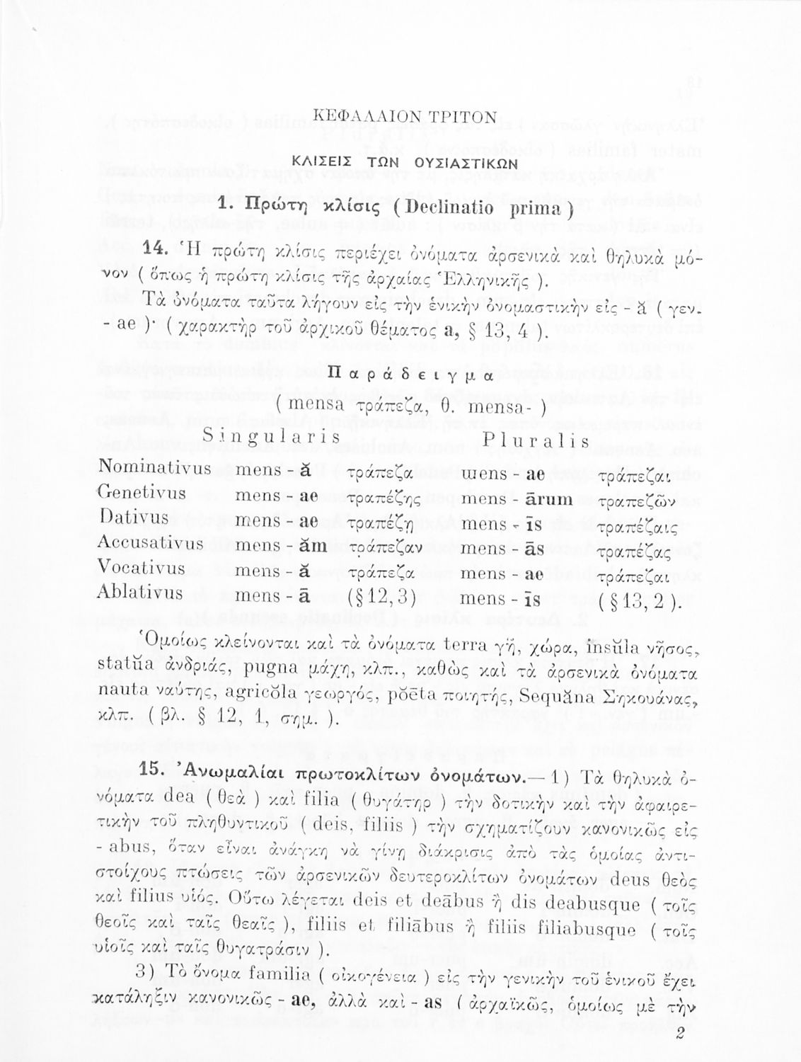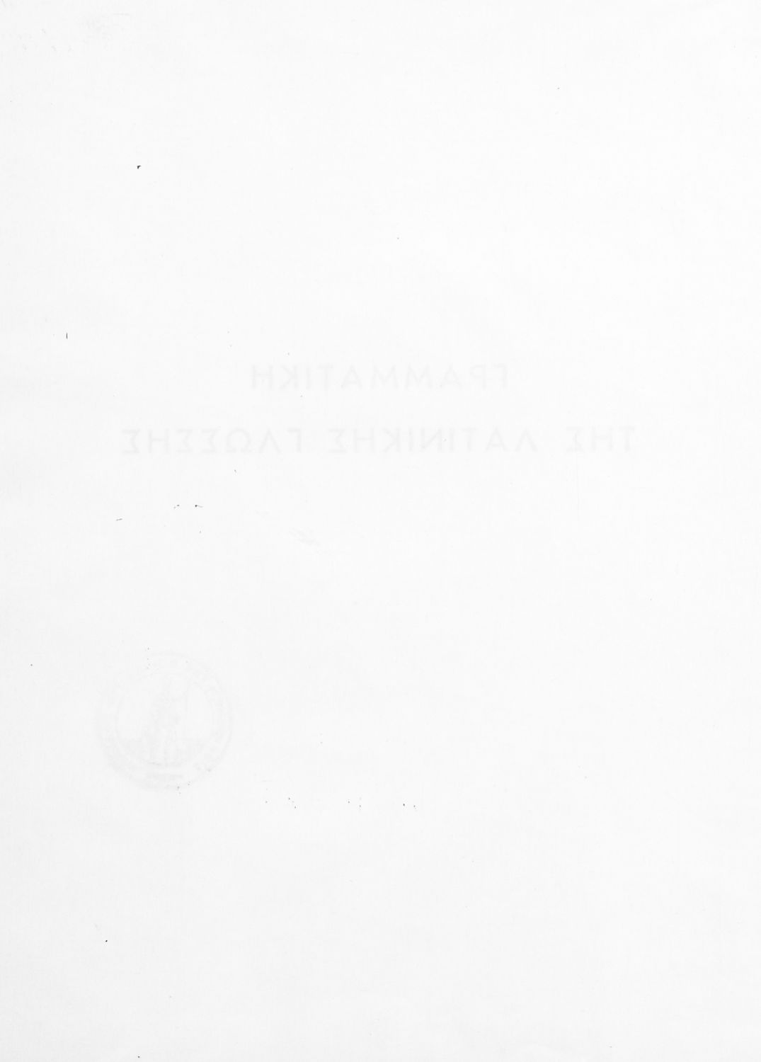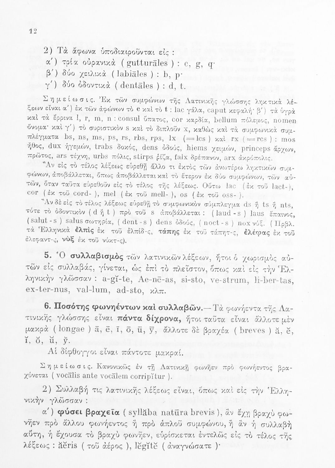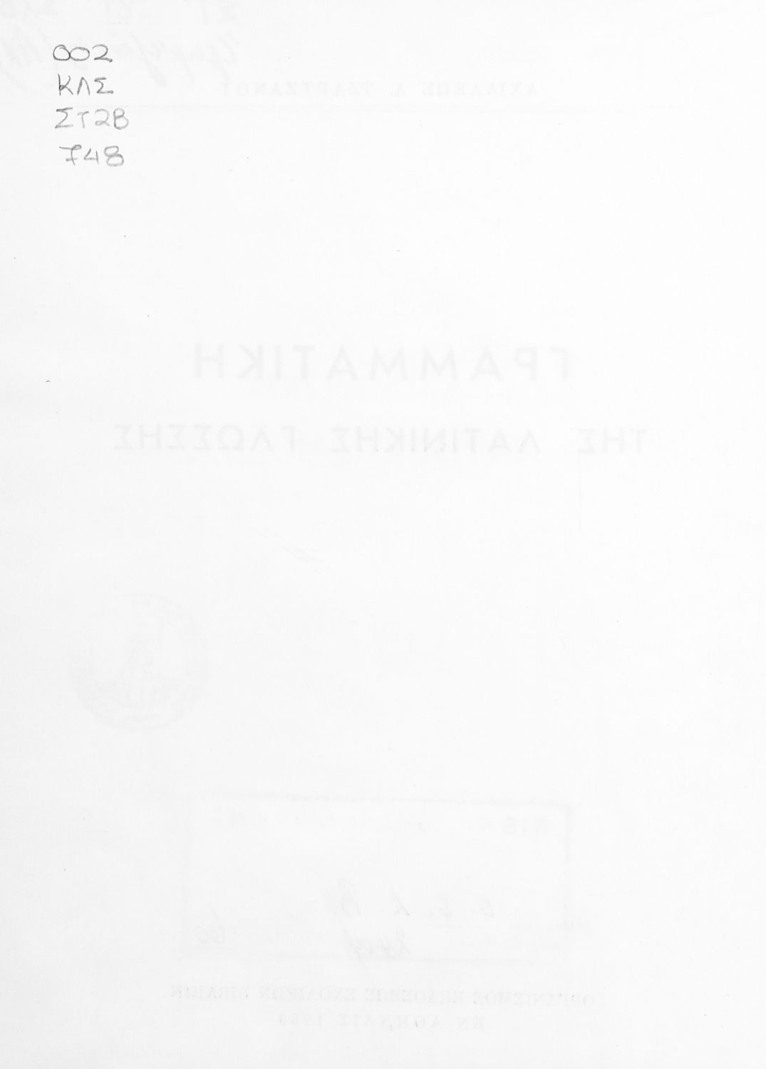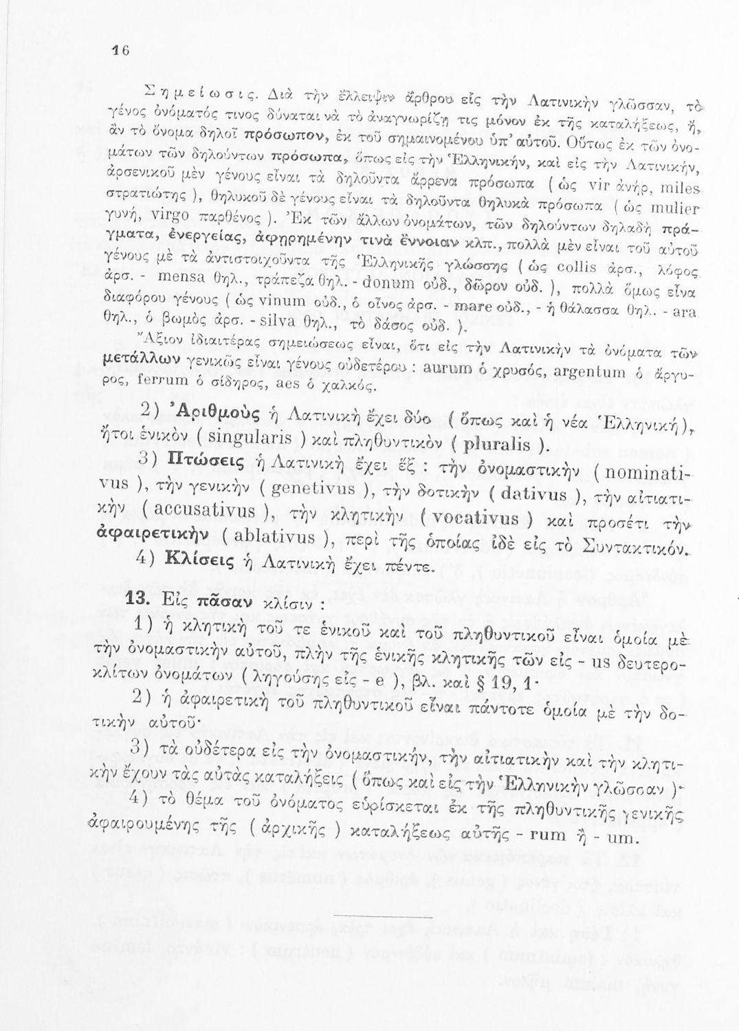 Σχολικό εγχειρίδιο Λατινικών Γυμνασίου που περιλαμβάνει γραμματική και συντακτικό και είναι χωρισμένο σε φθογγολογικό, τυπολογικό και ετυμολογικό μέρος.