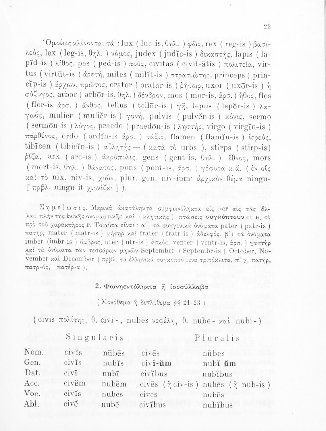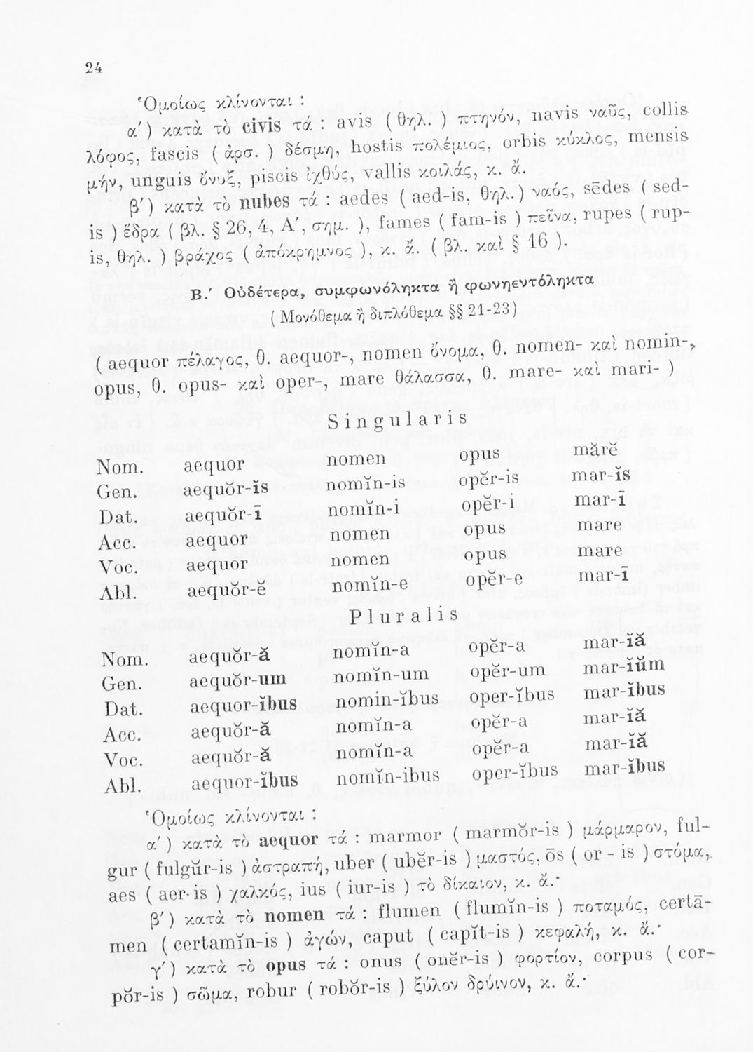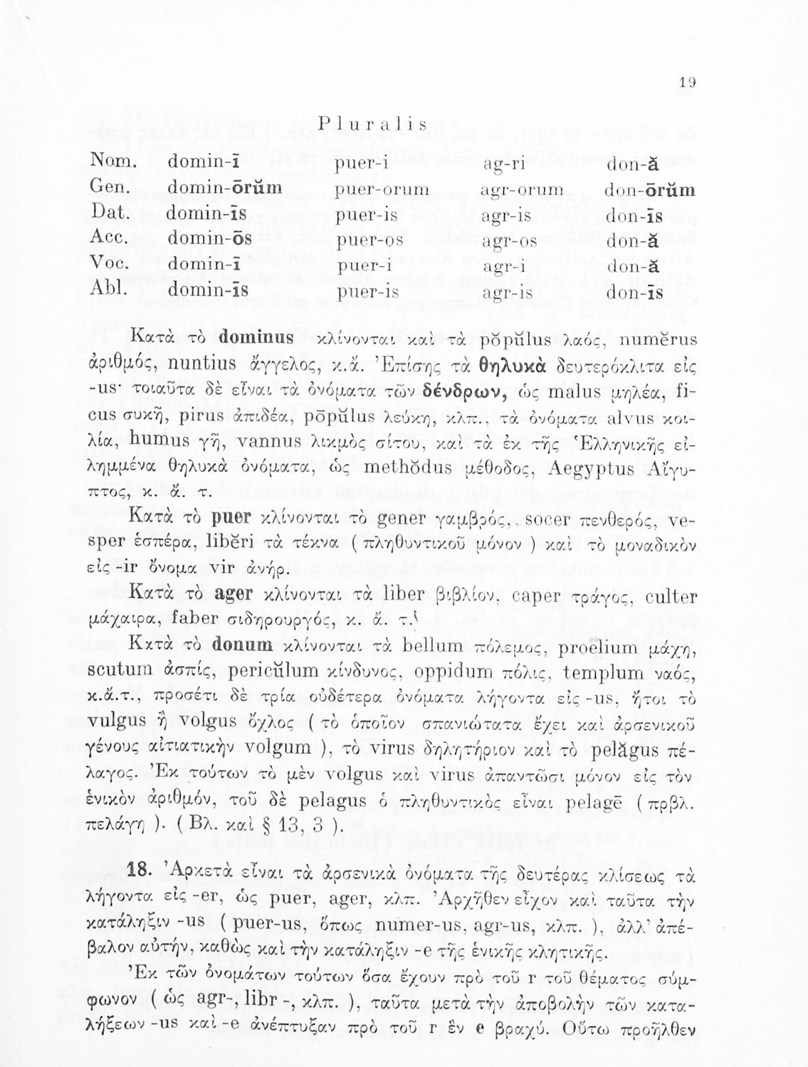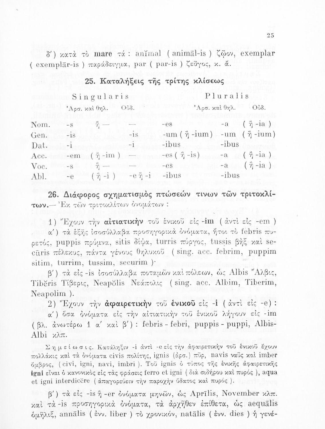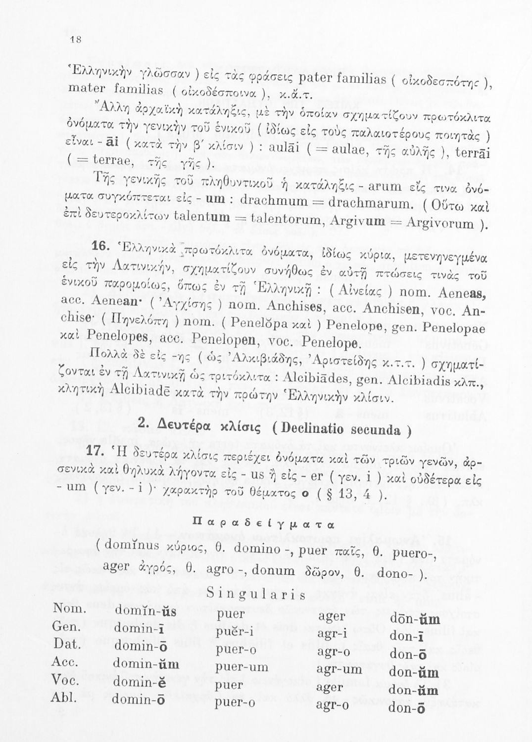 Σχολικό εγχειρίδιο Λατινικών Γυμνασίου που περιλαμβάνει γραμματική και συντακτικό και είναι χωρισμένο σε φθογγολογικό, τυπολογικό και ετυμολογικό μέρος.