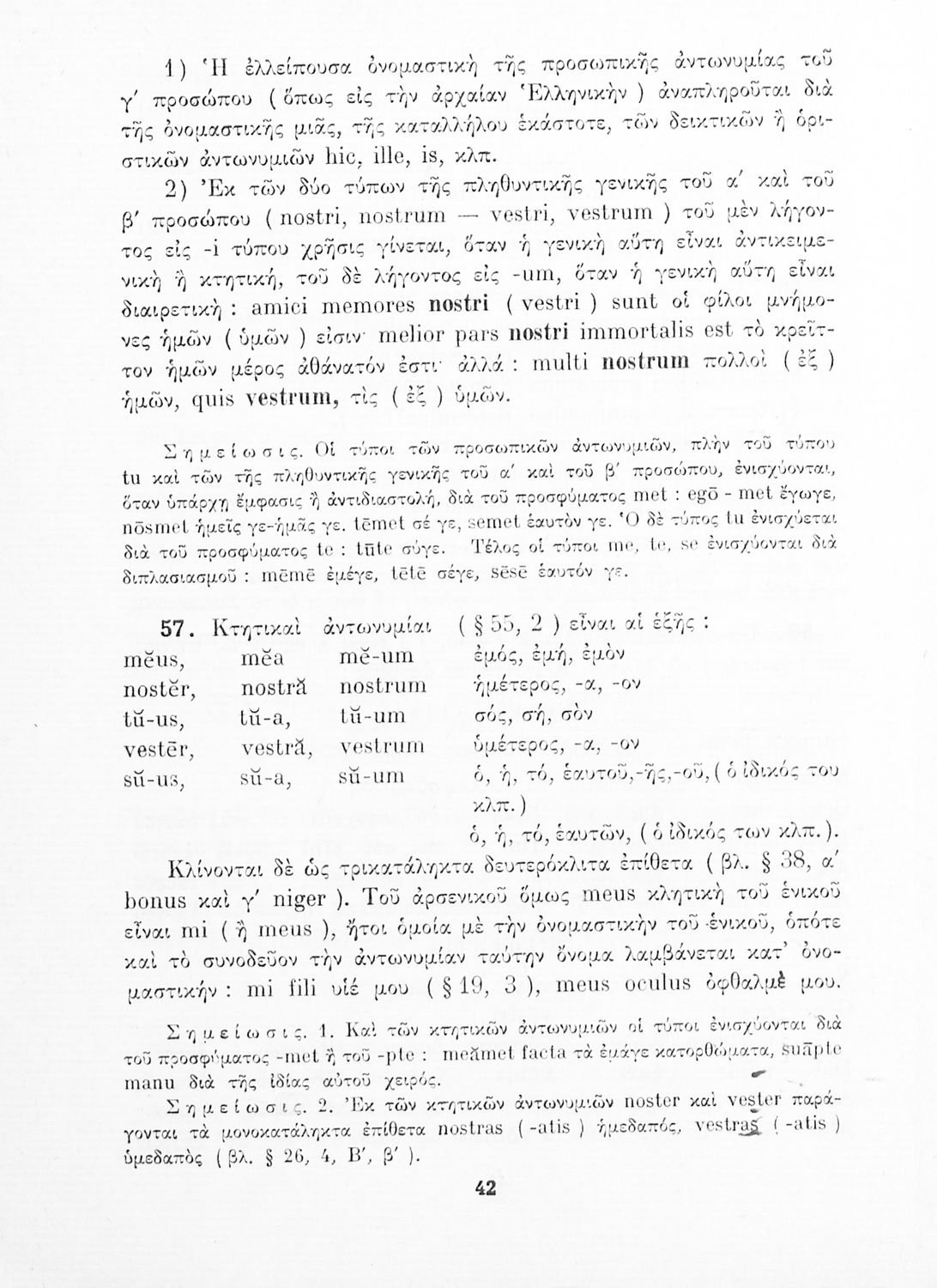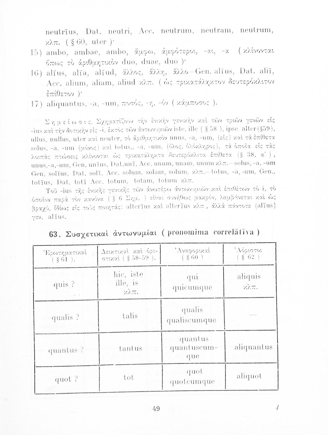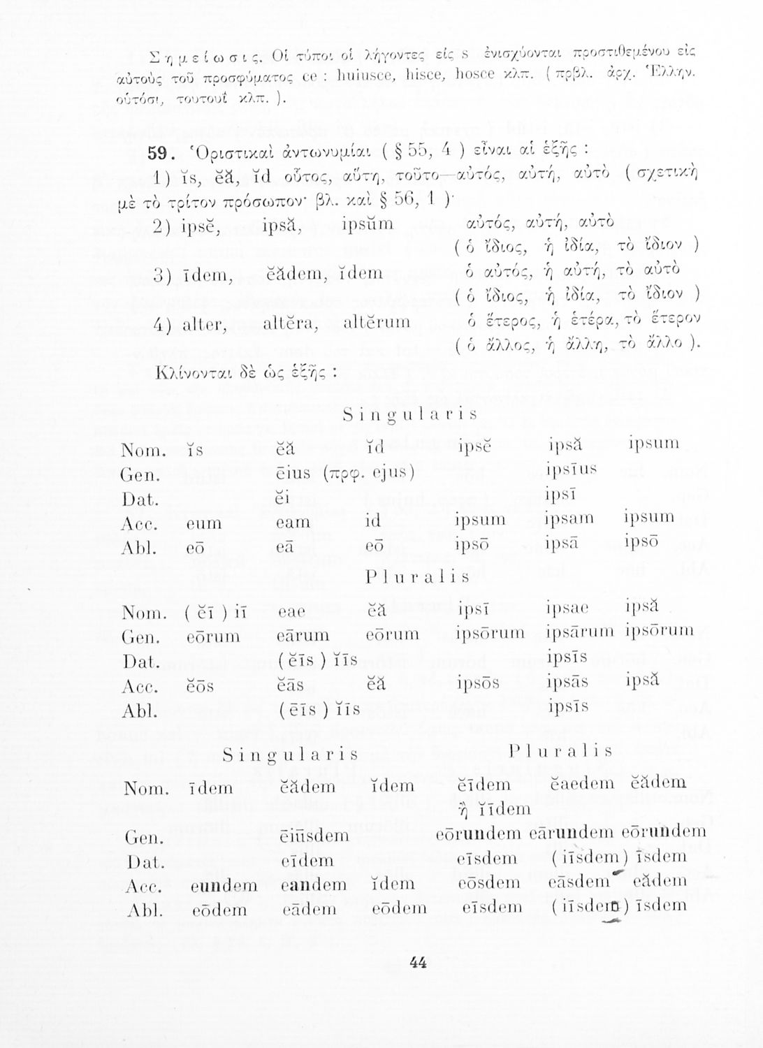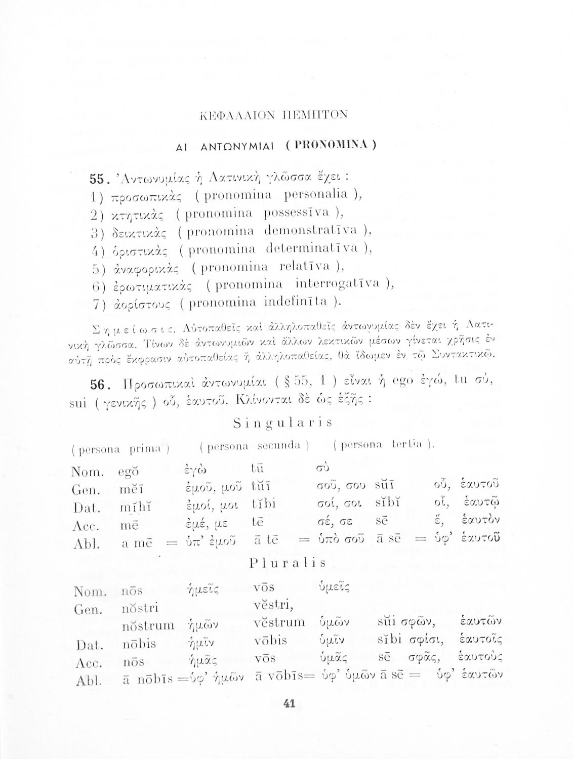 Σχολικό εγχειρίδιο Λατινικών Γυμνασίου που περιλαμβάνει γραμματική και συντακτικό και είναι χωρισμένο σε φθογγολογικό, τυπολογικό και ετυμολογικό μέρος.