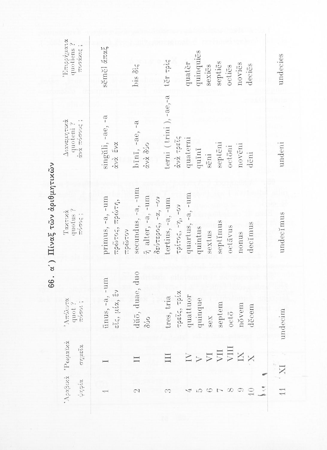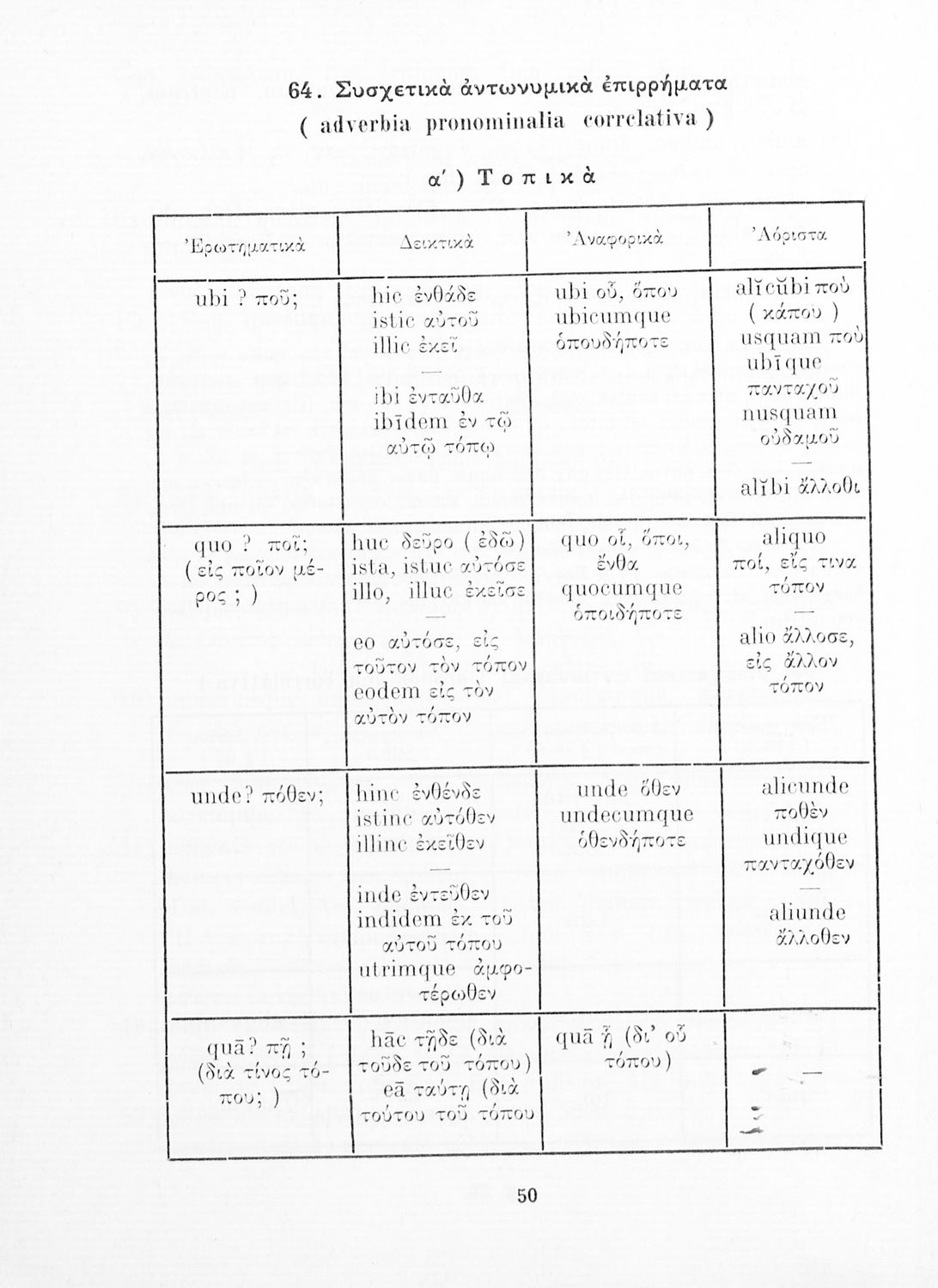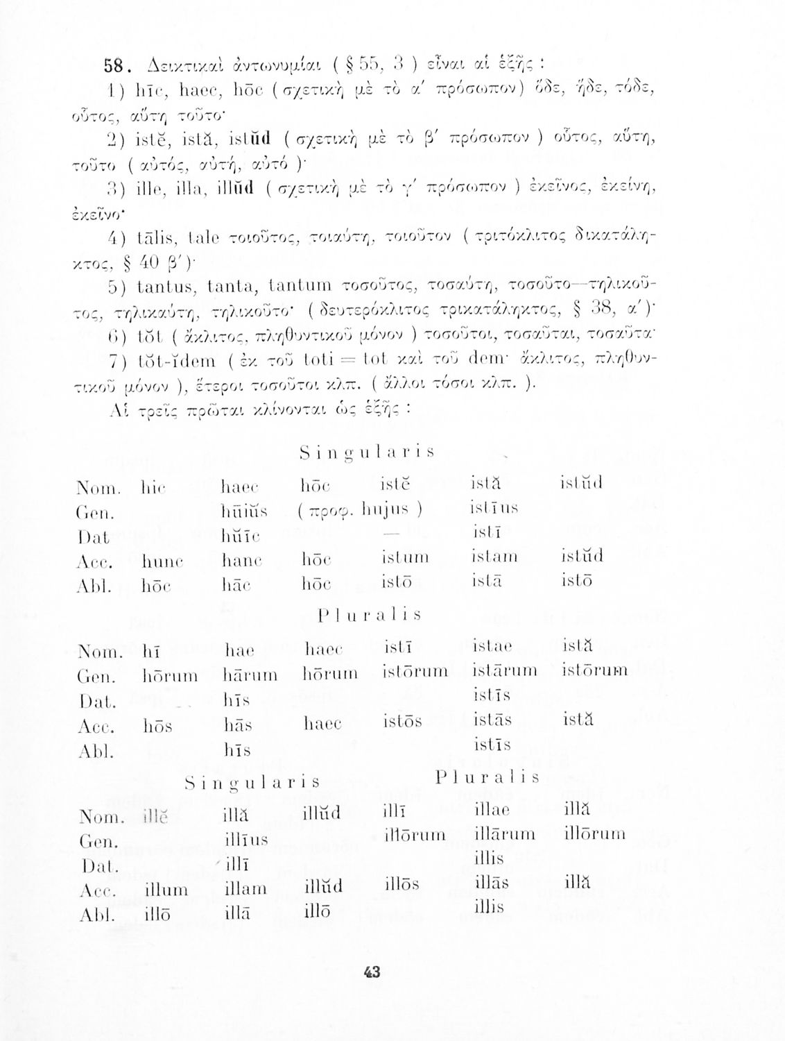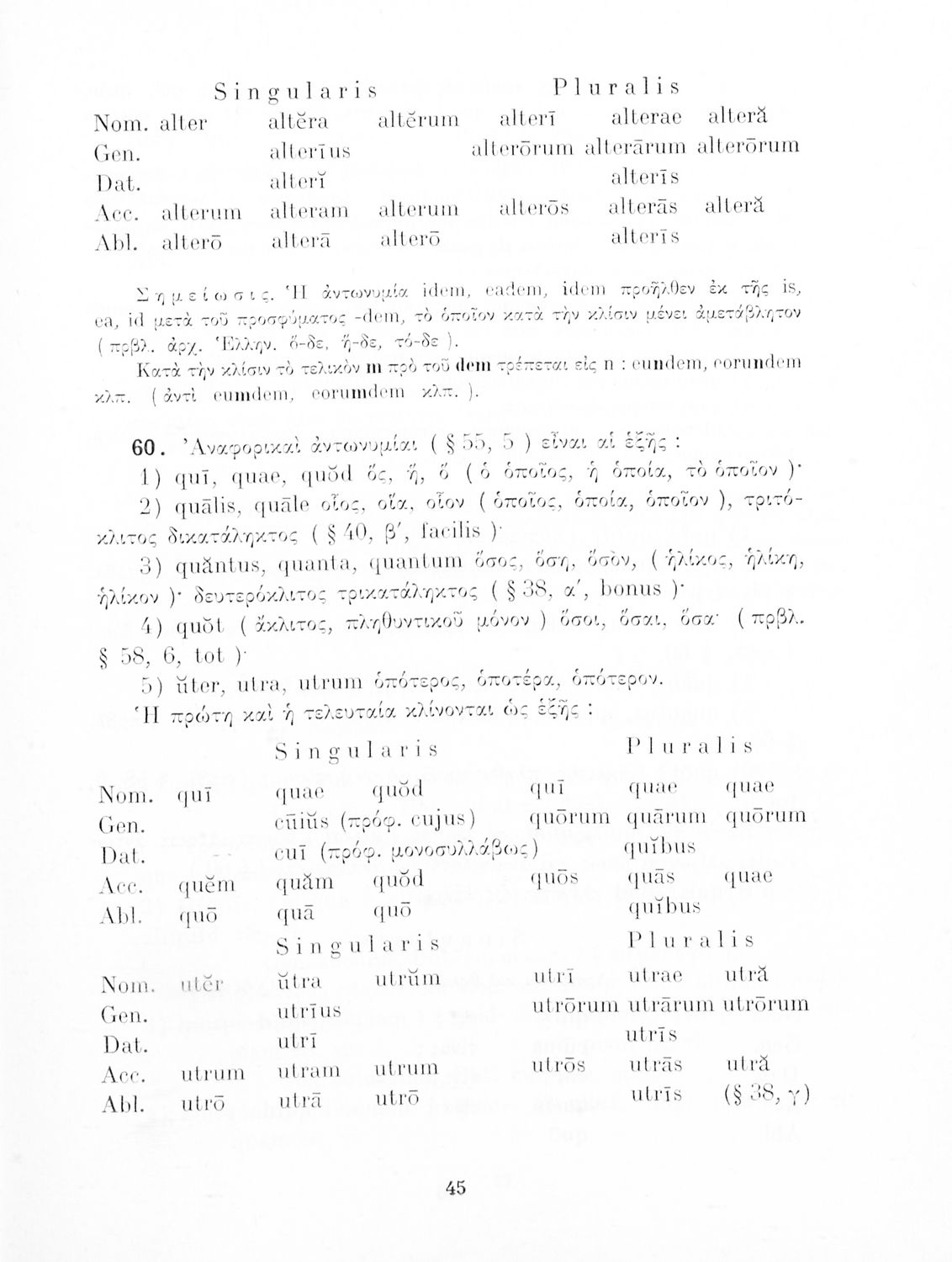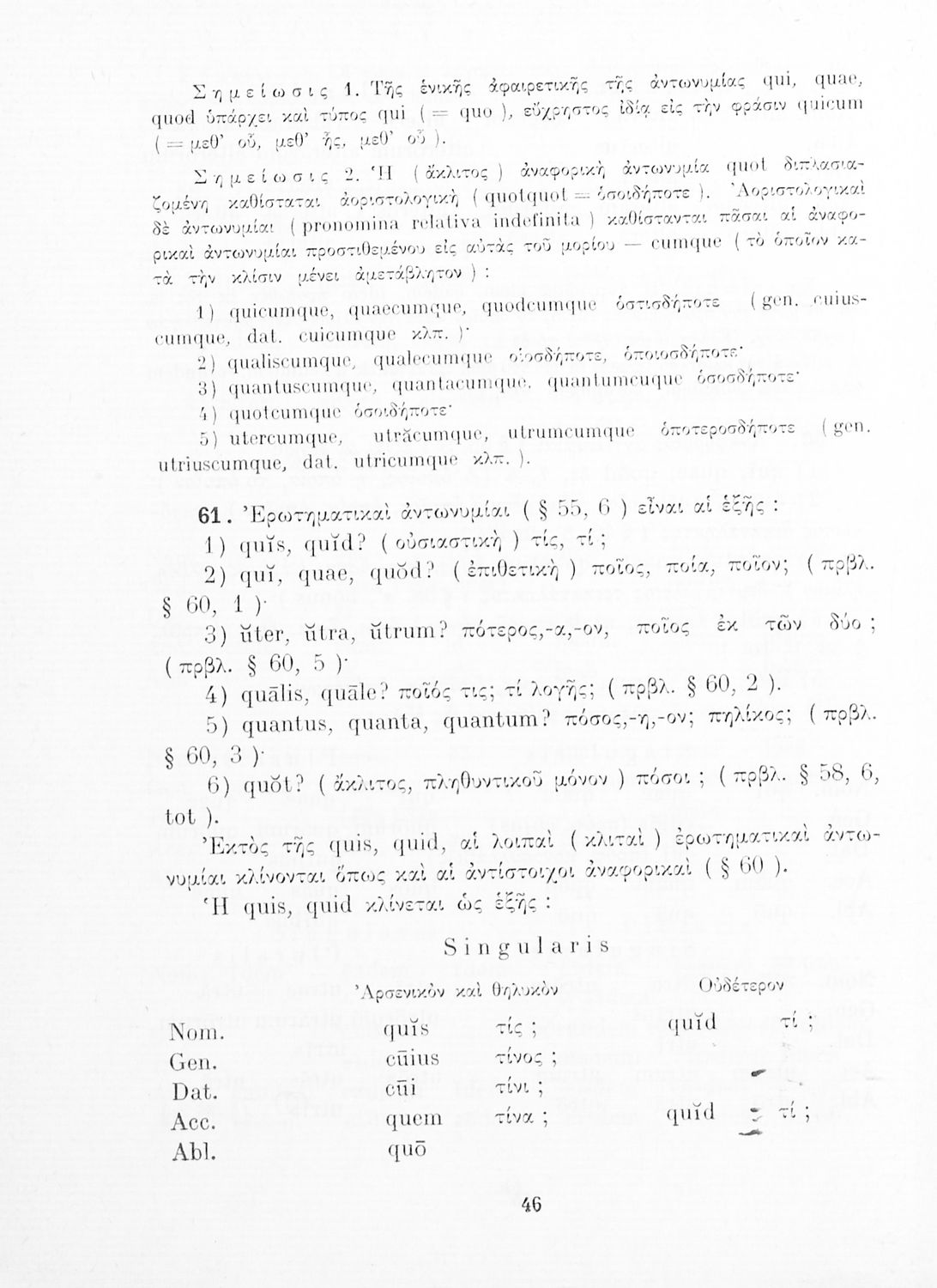 Σχολικό εγχειρίδιο Λατινικών Γυμνασίου που περιλαμβάνει γραμματική και συντακτικό και είναι χωρισμένο σε φθογγολογικό, τυπολογικό και ετυμολογικό μέρος.