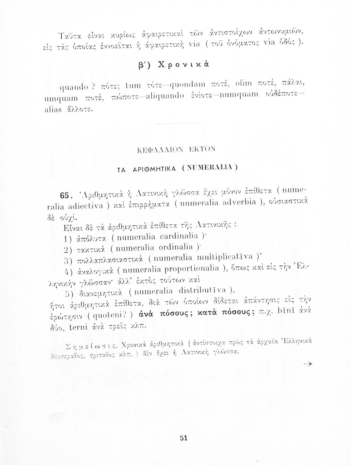 Σχολικό εγχειρίδιο Λατινικών Α΄, Β΄, Γ' Γυμνασίου που περιλαμβάνει γραμματική και συντακτικό και είναι χωρισμένο σε φθογγολογικό, τυπολογικό και ετυμολογικό μέρος.