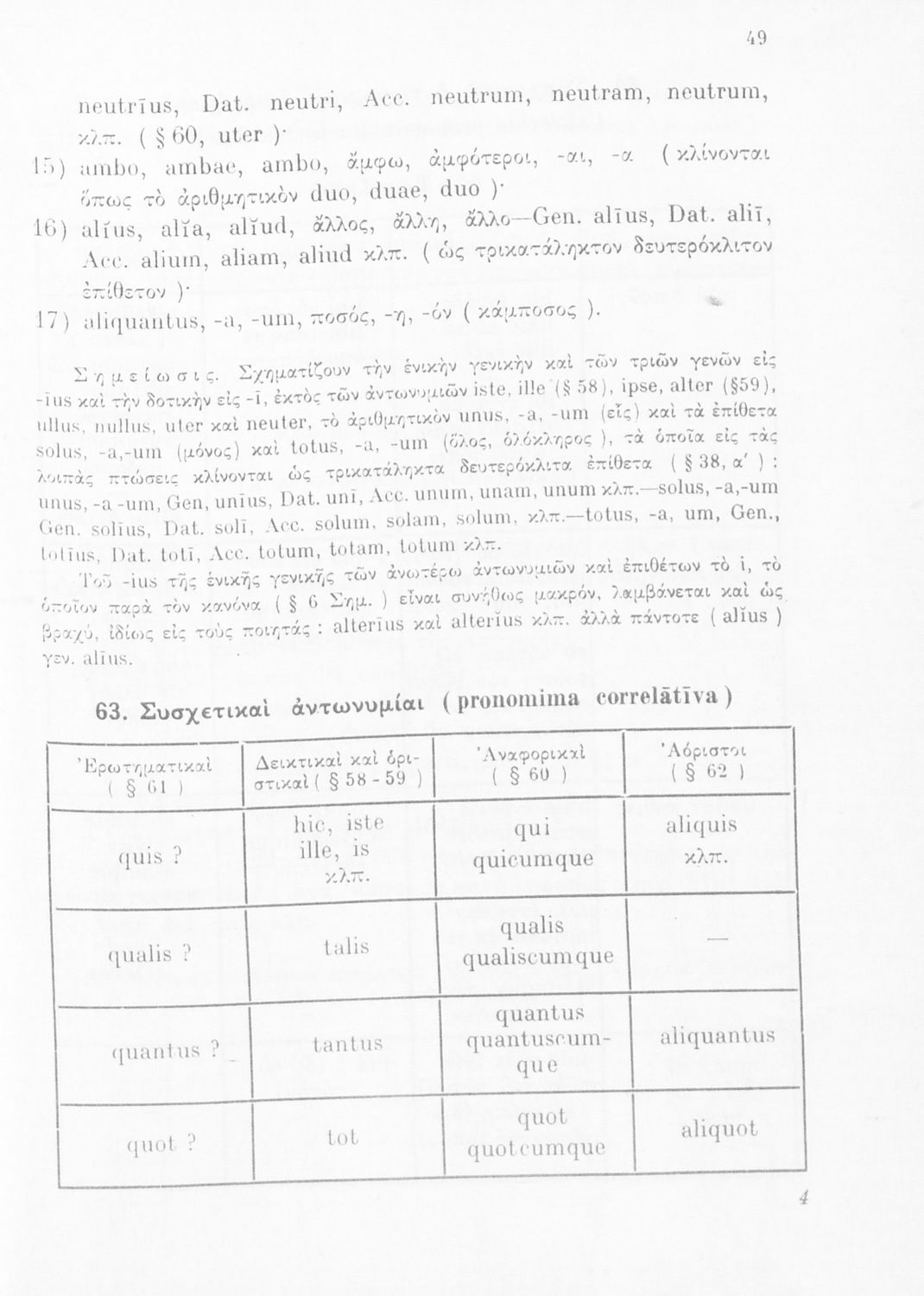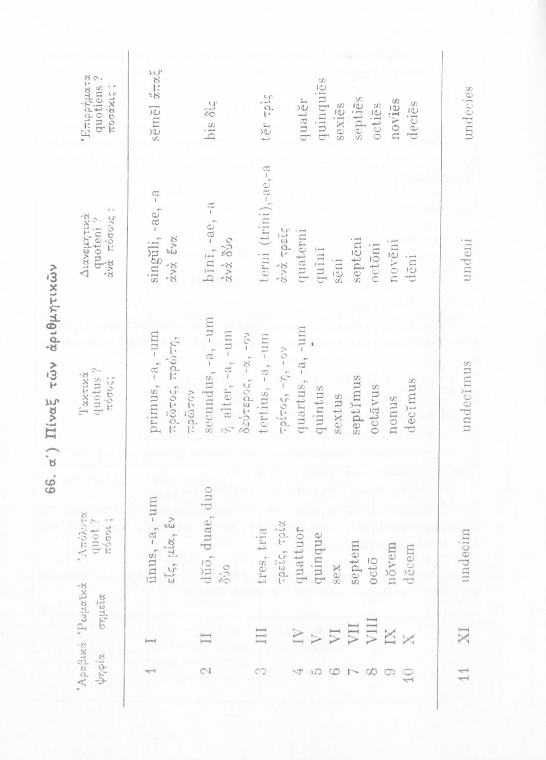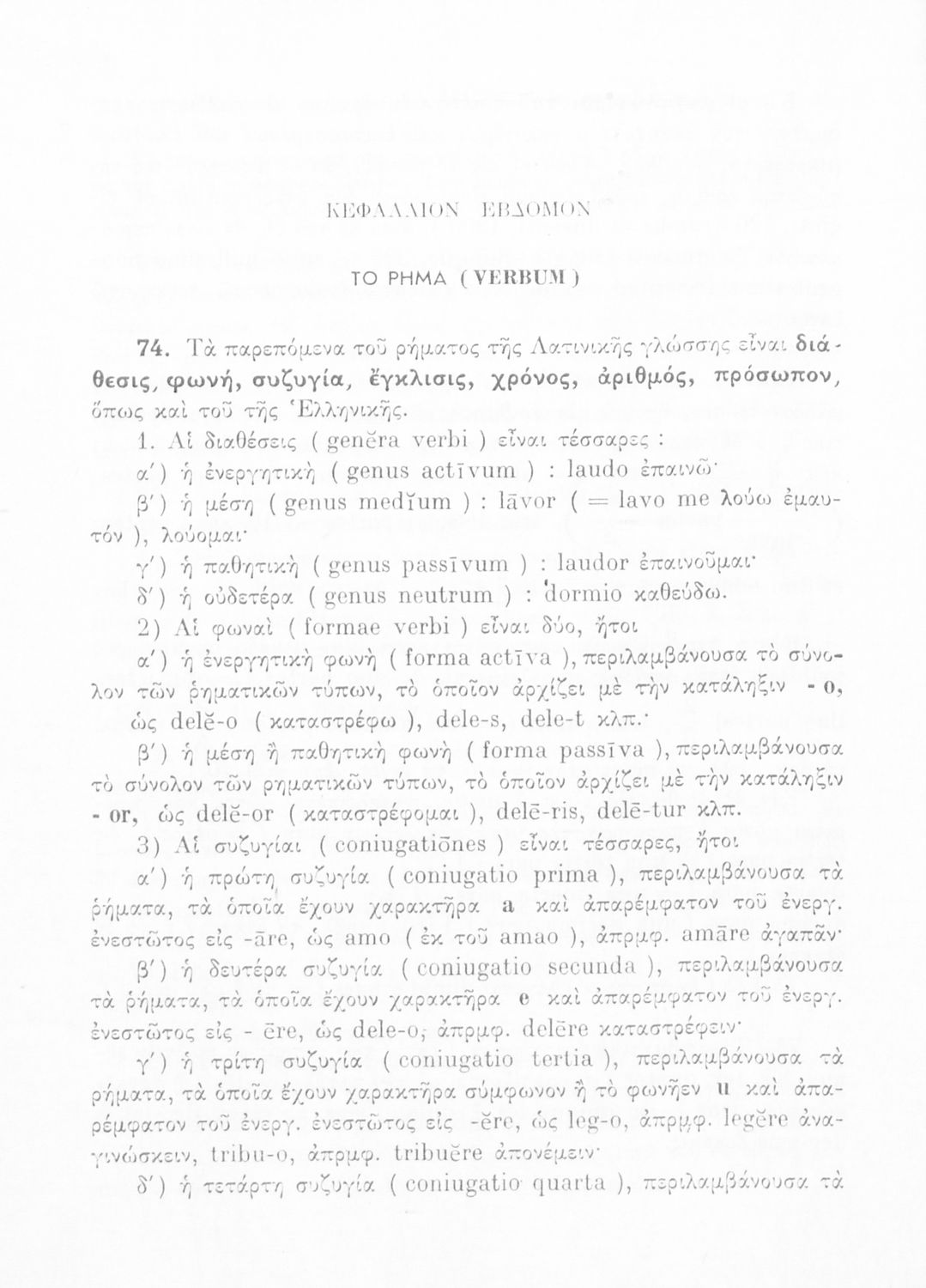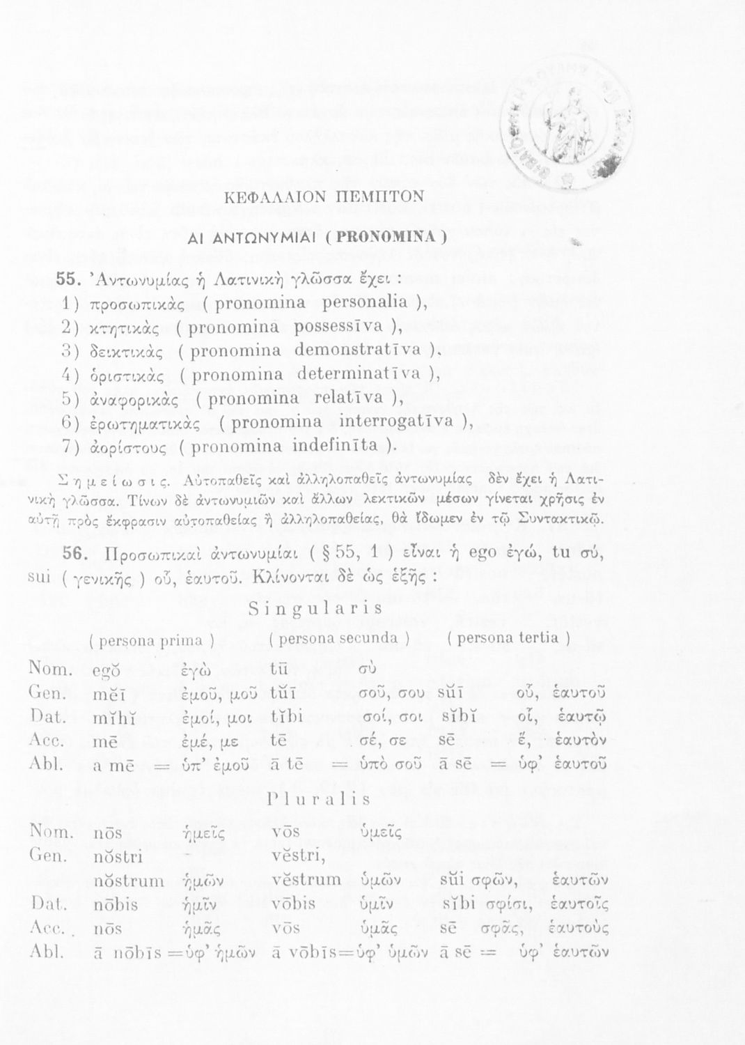 Σχολικό εγχειρίδιο Λατινικών Γυμνασίου που περιλαμβάνει γραμματική και συντακτικό και είναι χωρισμένο σε φθογγολογικό, τυπολογικό και ετυμολογικό μέρος.