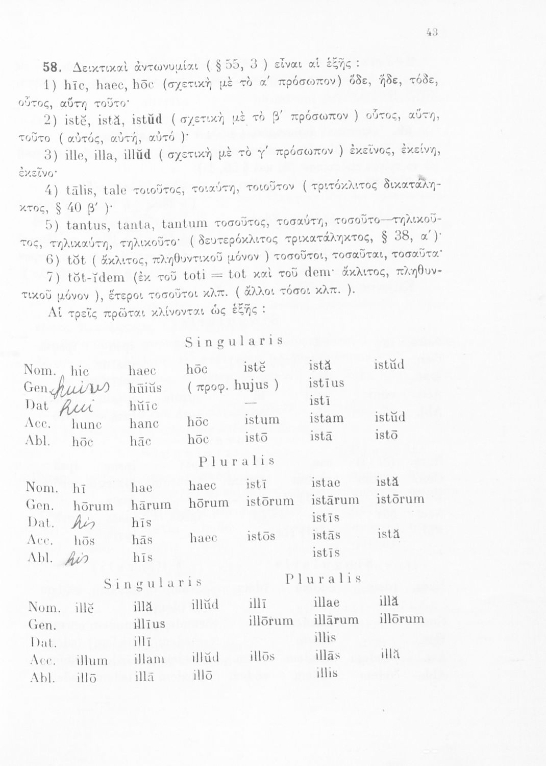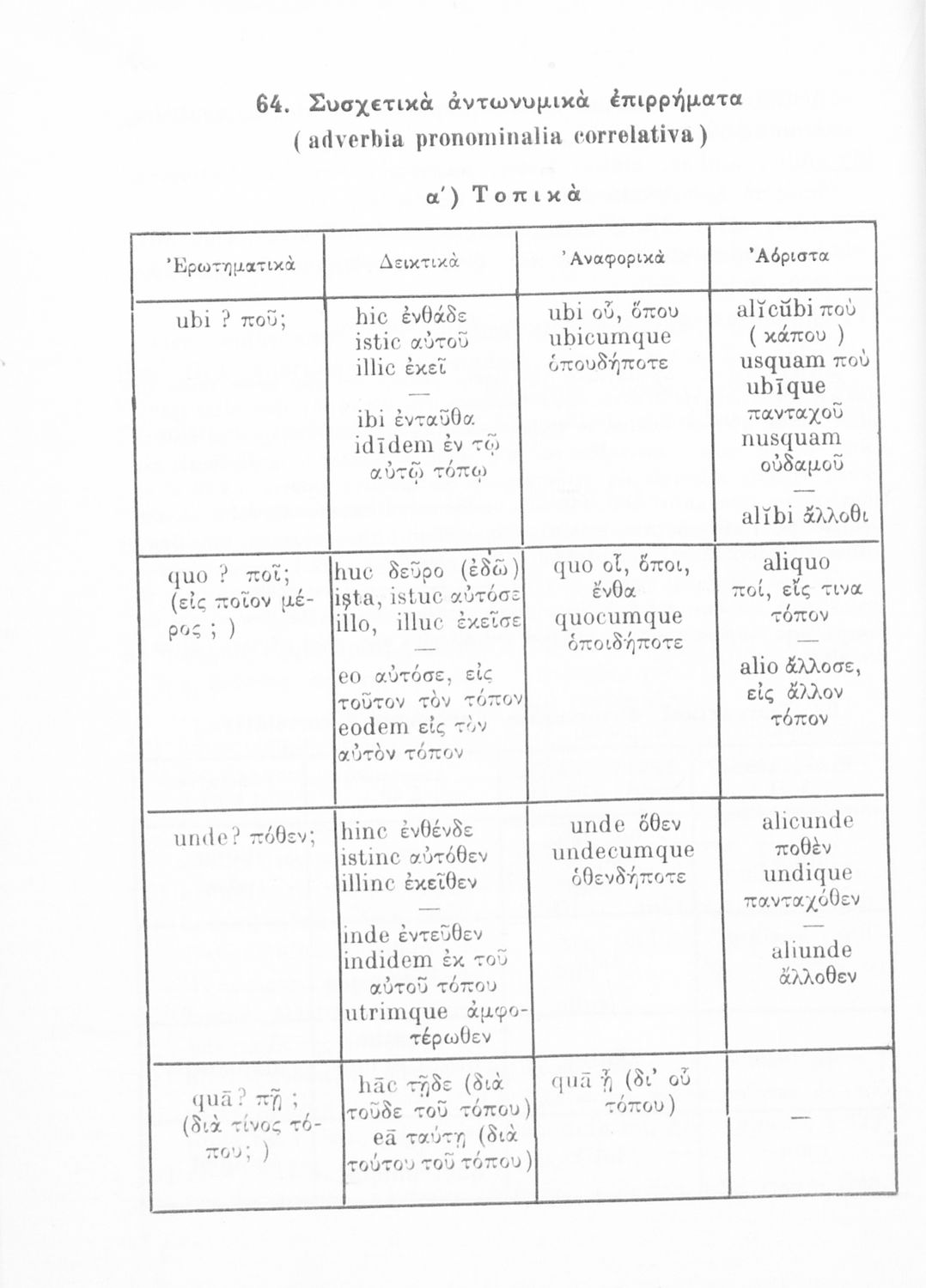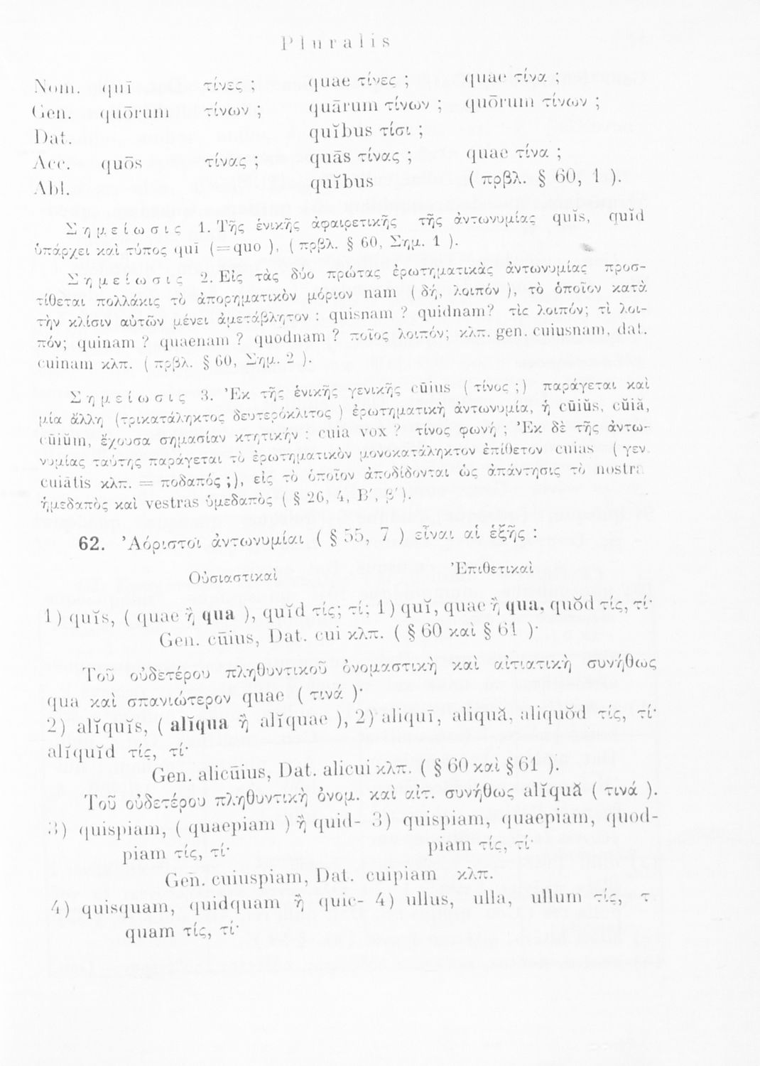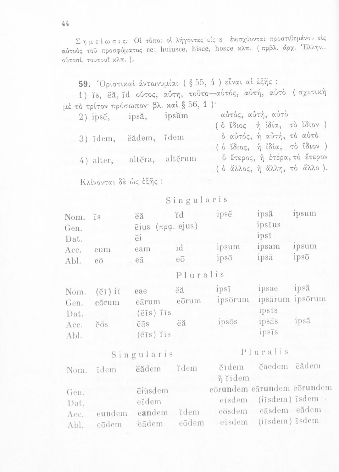 Σχολικό εγχειρίδιο Λατινικών Γυμνασίου που περιλαμβάνει γραμματική και συντακτικό και είναι χωρισμένο σε φθογγολογικό, τυπολογικό και ετυμολογικό μέρος.