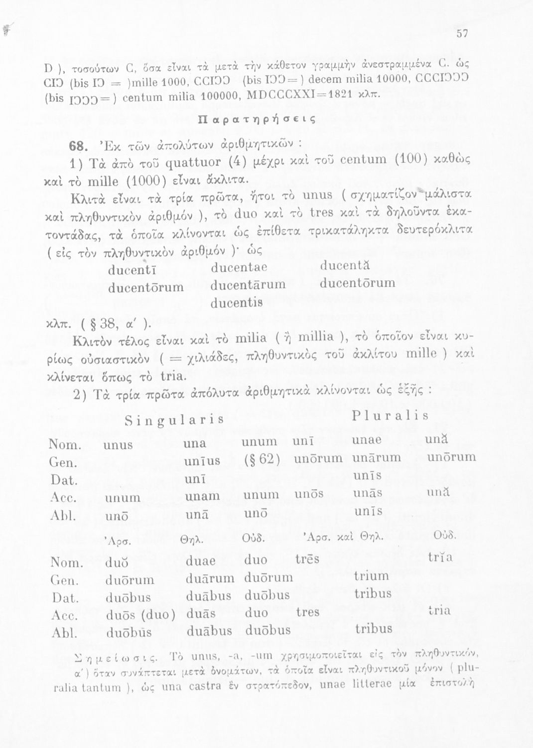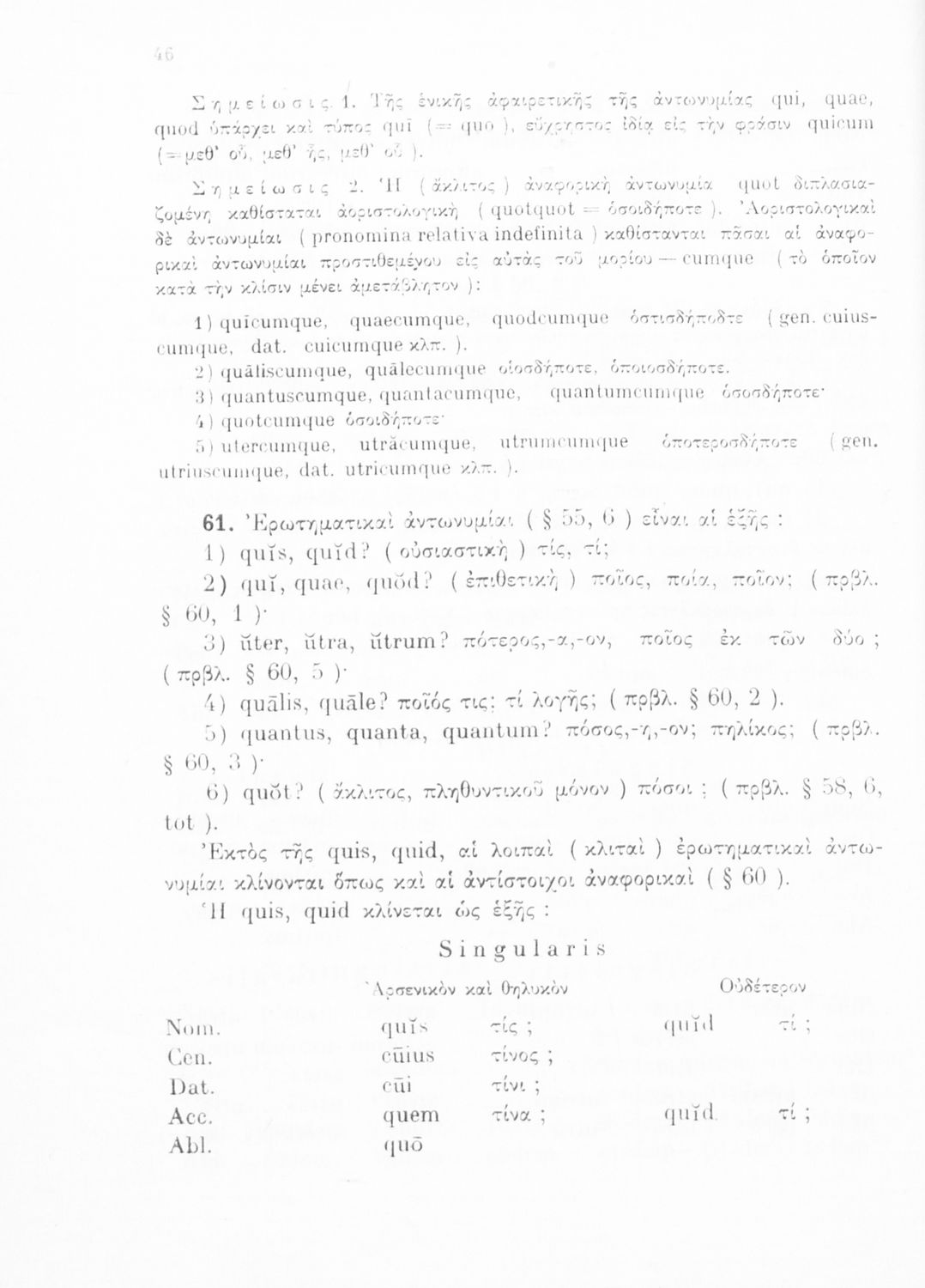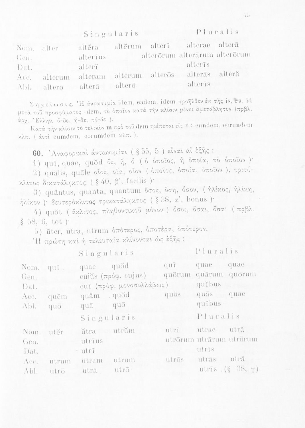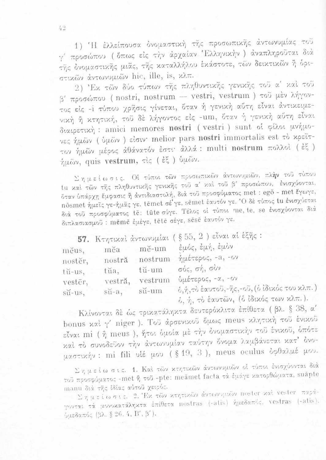Σχολικό εγχειρίδιο Λατινικών Γυμνασίου που περιλαμβάνει γραμματική και συντακτικό και είναι χωρισμένο σε φθογγολογικό, τυπολογικό και ετυμολογικό μέρος.
