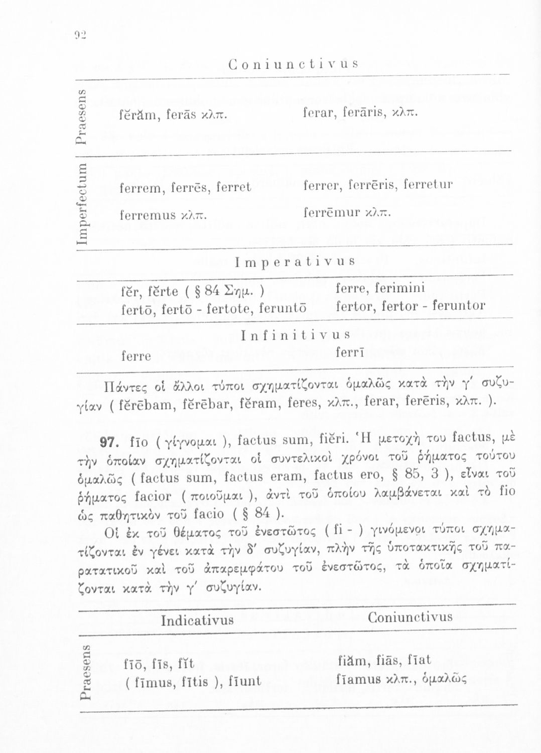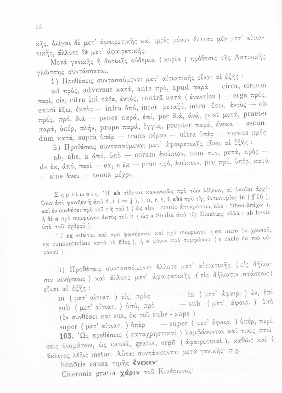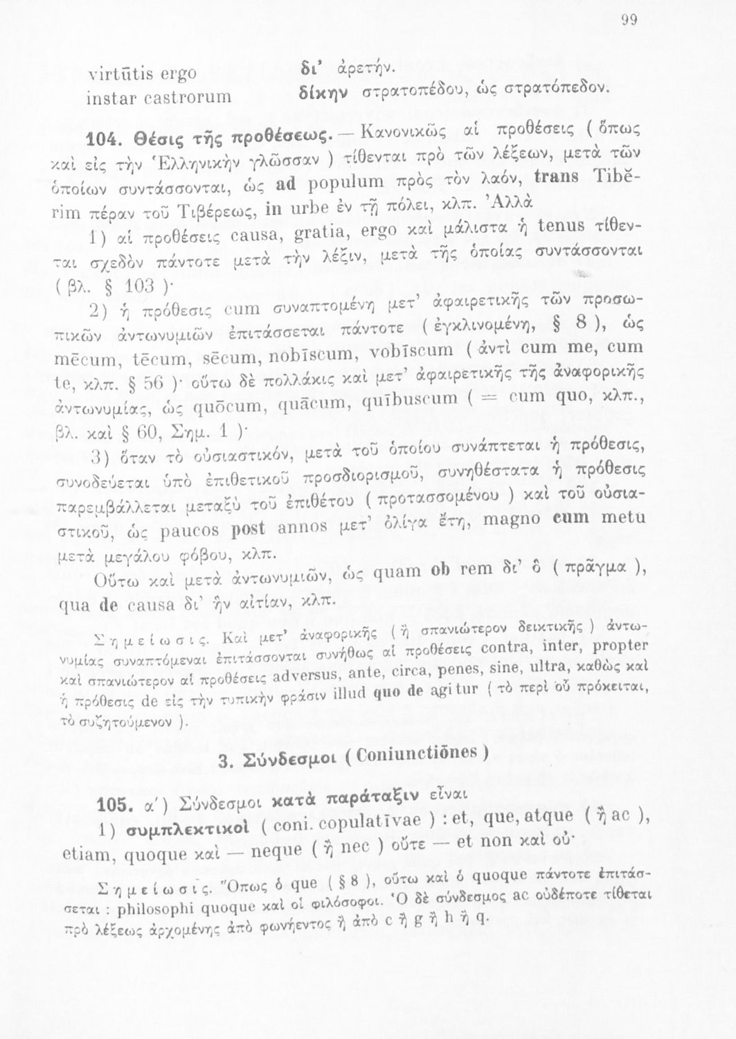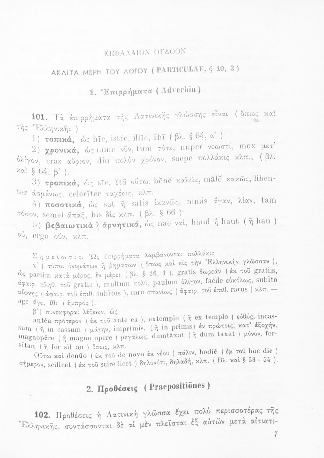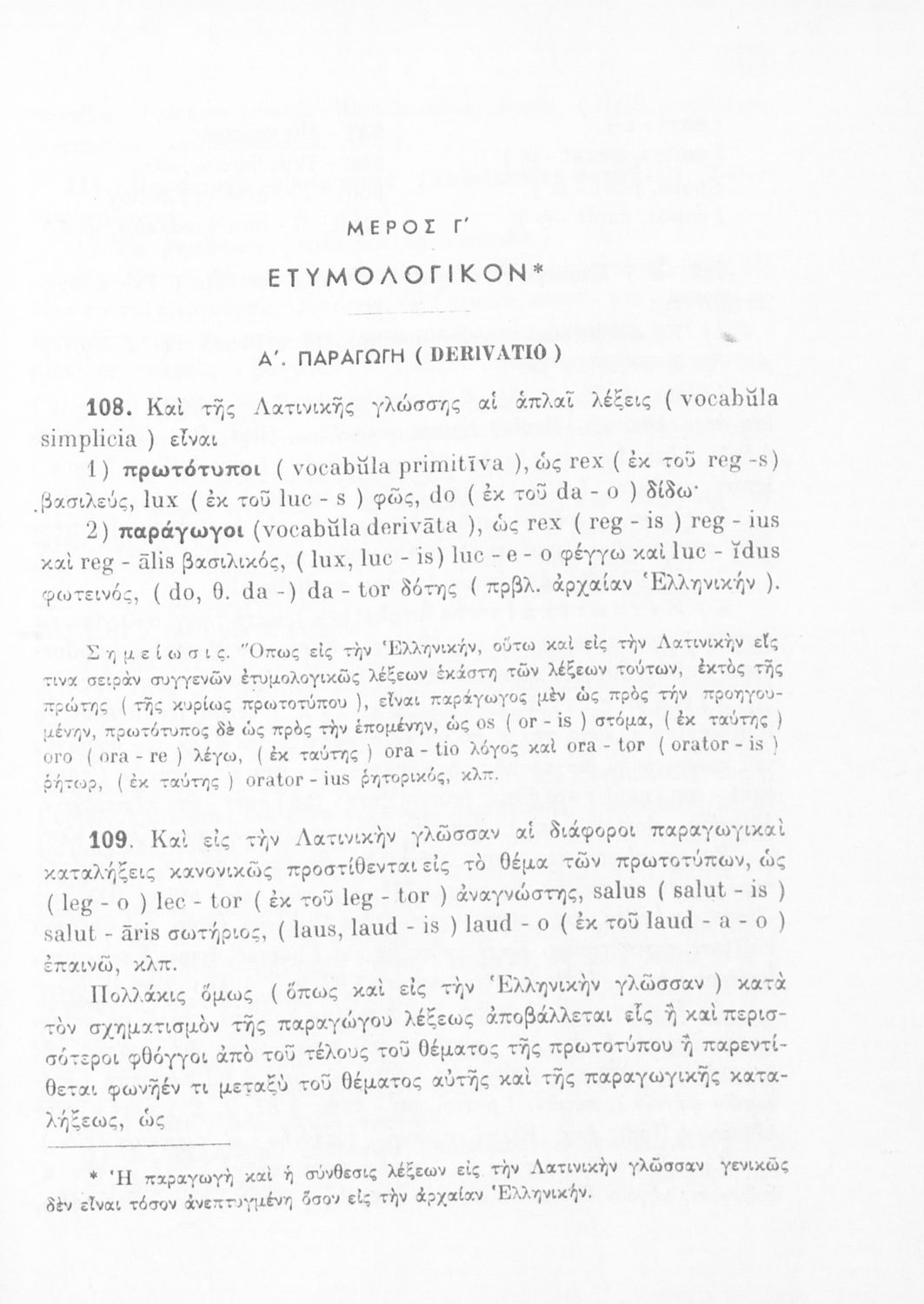 Σχολικό εγχειρίδιο Λατινικών Γυμνασίου που περιλαμβάνει γραμματική και συντακτικό και είναι χωρισμένο σε φθογγολογικό, τυπολογικό και ετυμολογικό μέρος. Φέρει το σύμβολο της δικτατορίας.