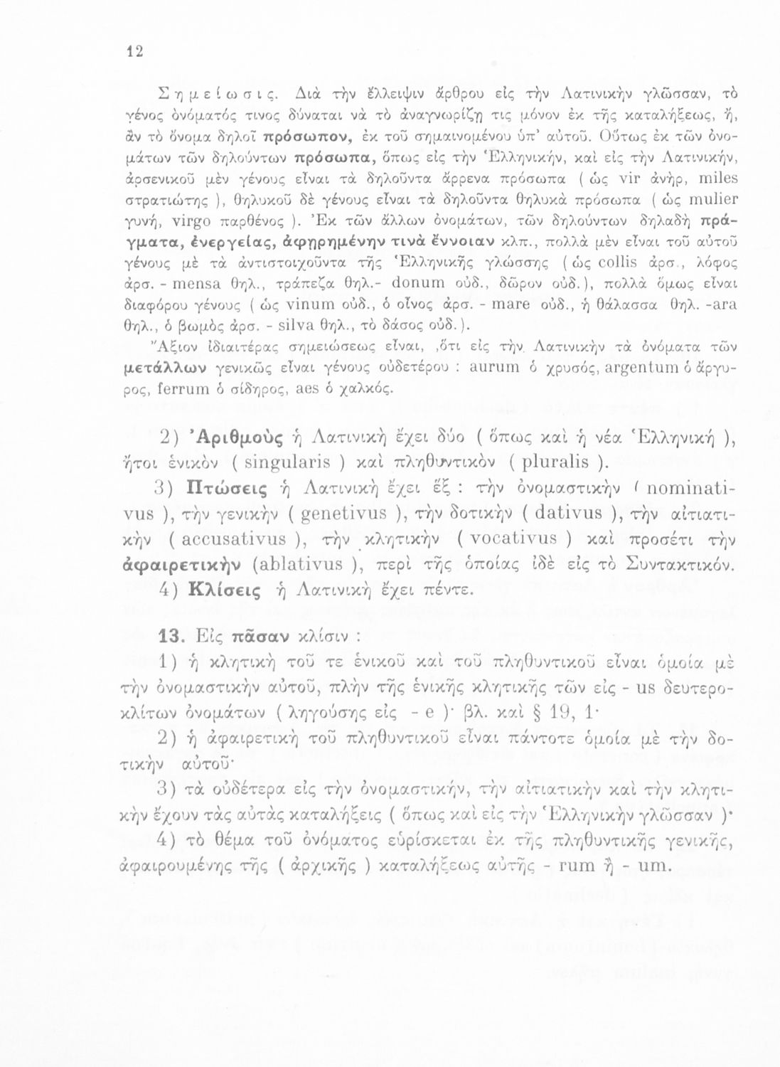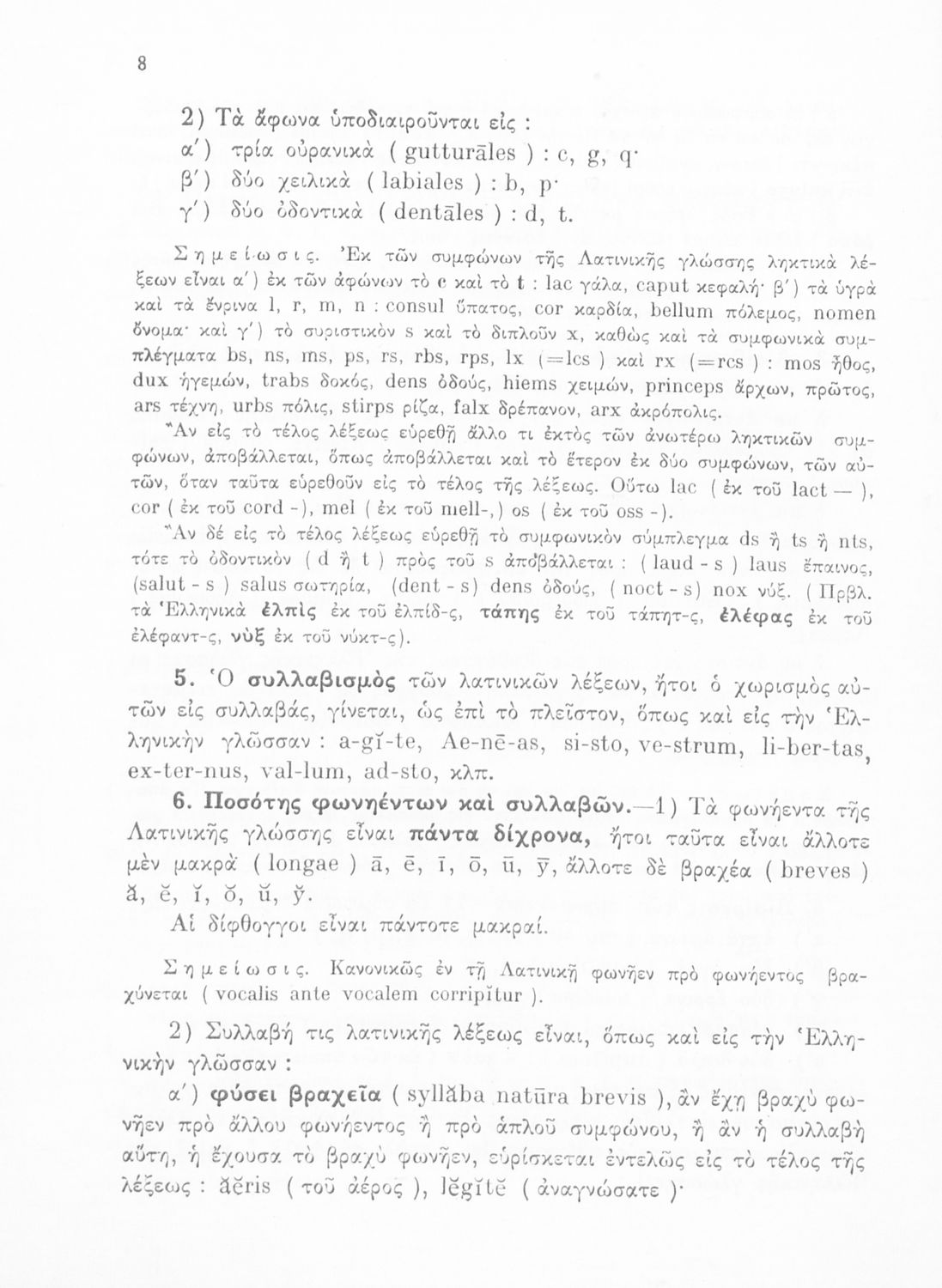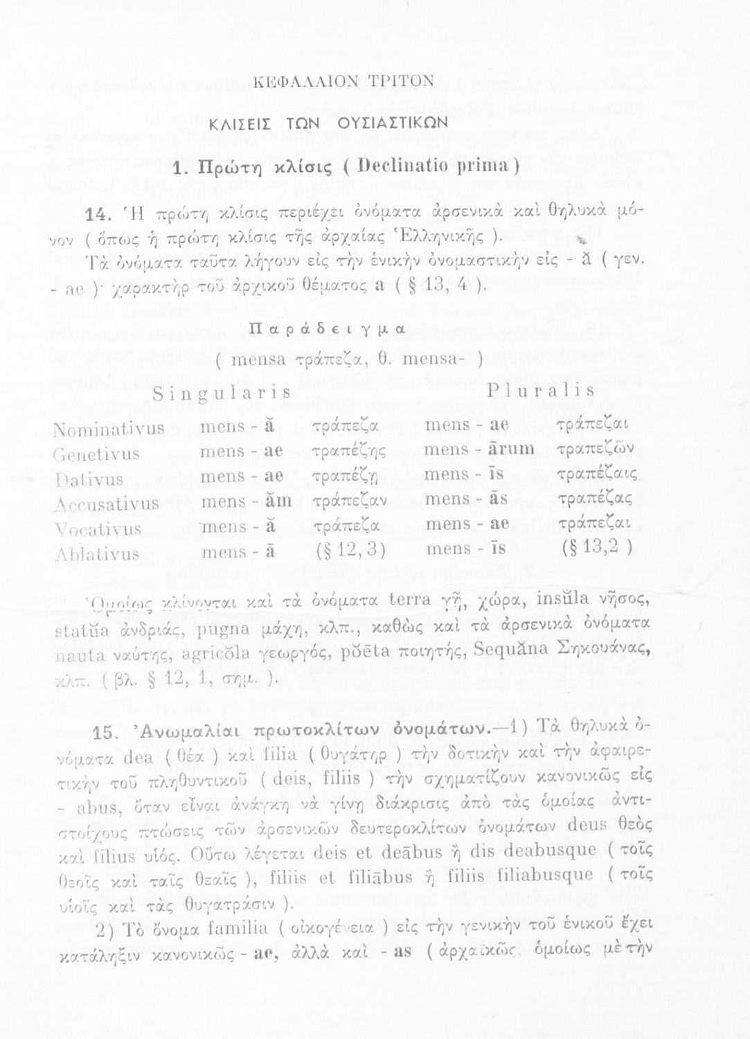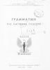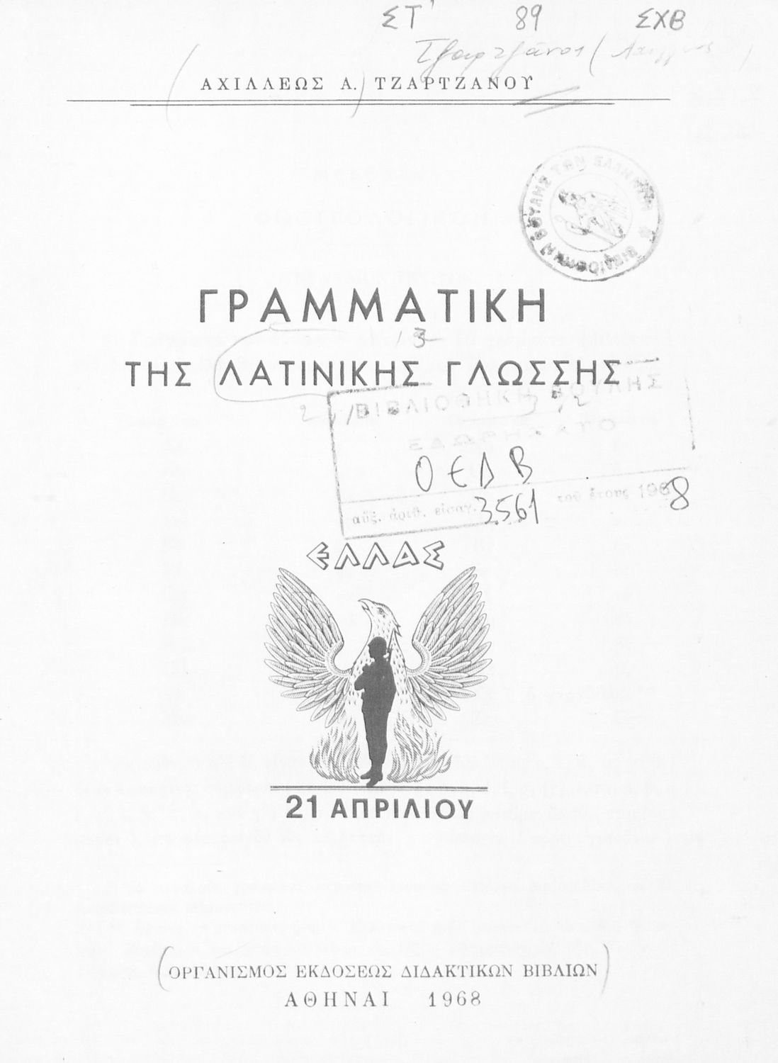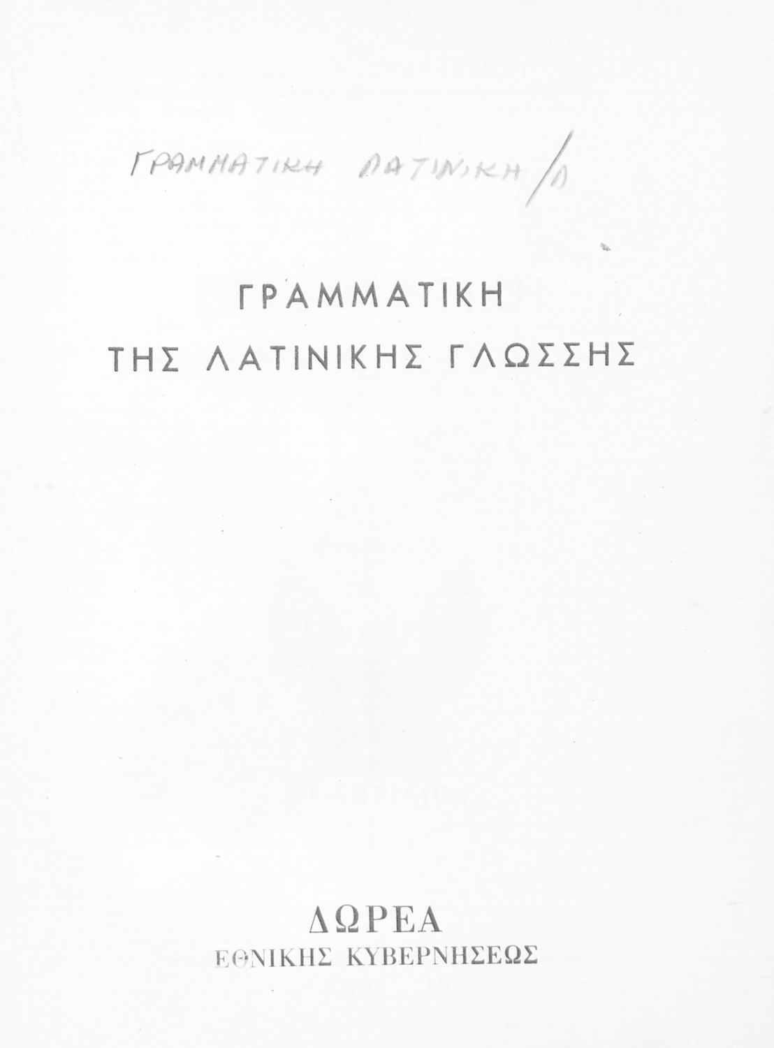 Σχολικό εγχειρίδιο Λατινικών Γυμνασίου που περιλαμβάνει γραμματική και συντακτικό και είναι χωρισμένο σε φθογγολογικό, τυπολογικό και ετυμολογικό μέρος. Φέρει το σύμβολο της δικτατορίας.