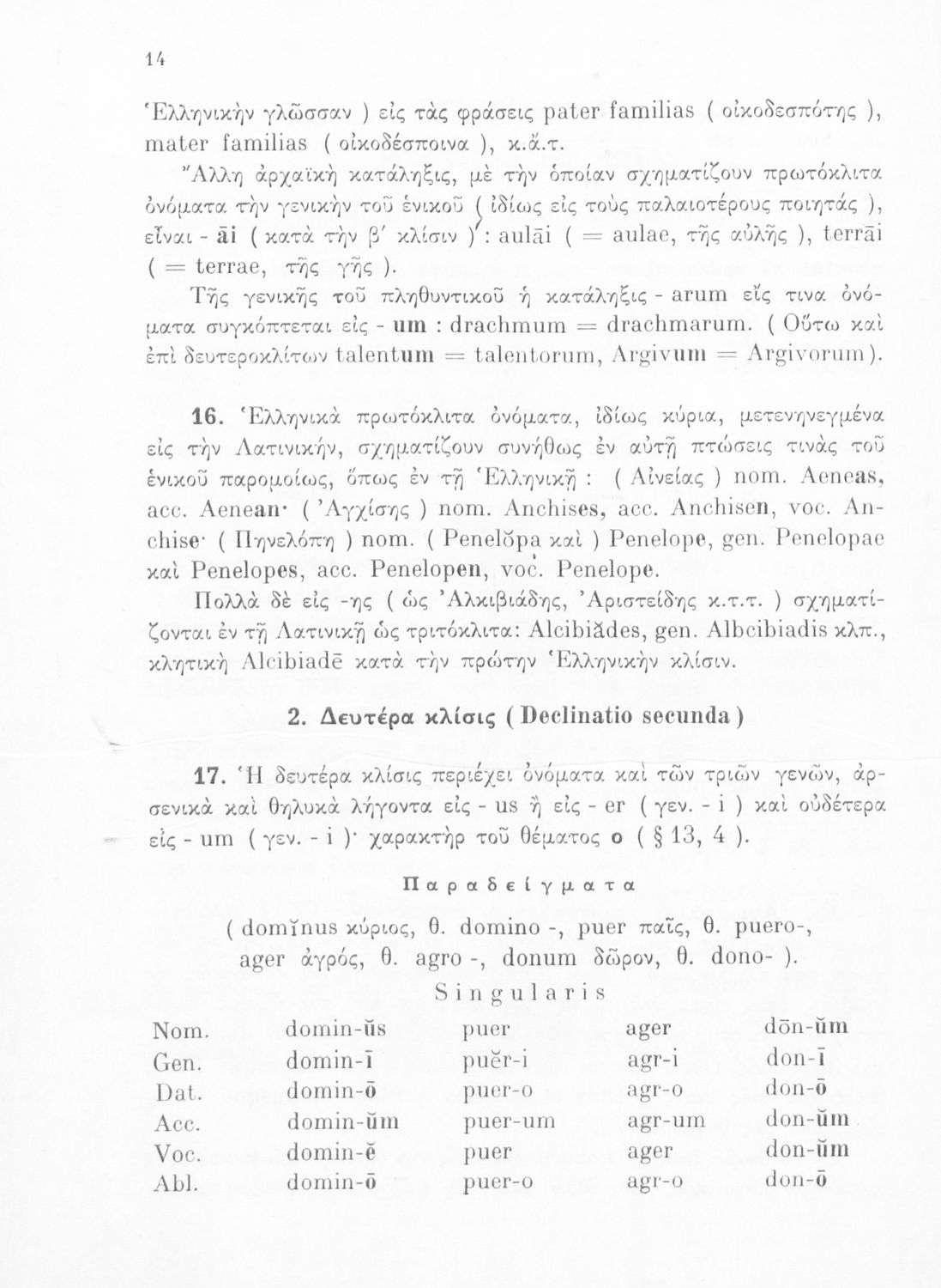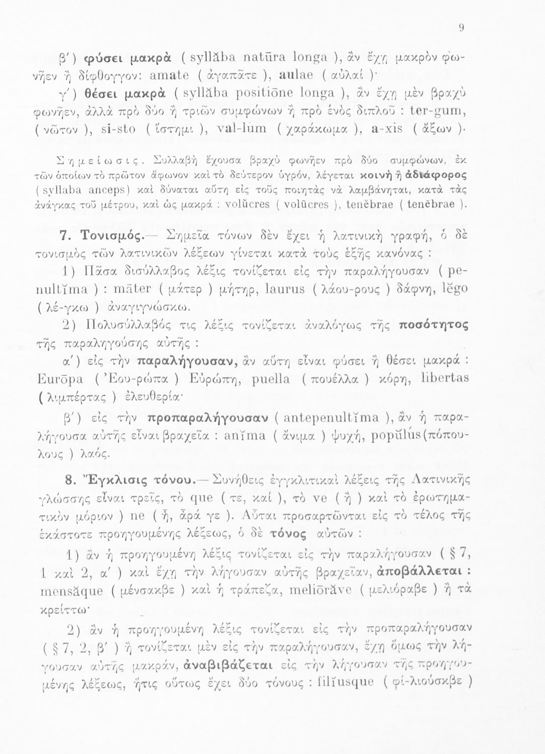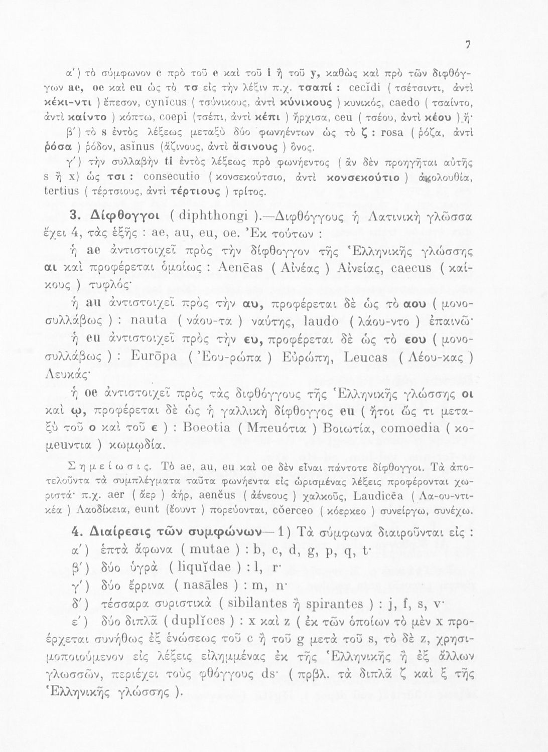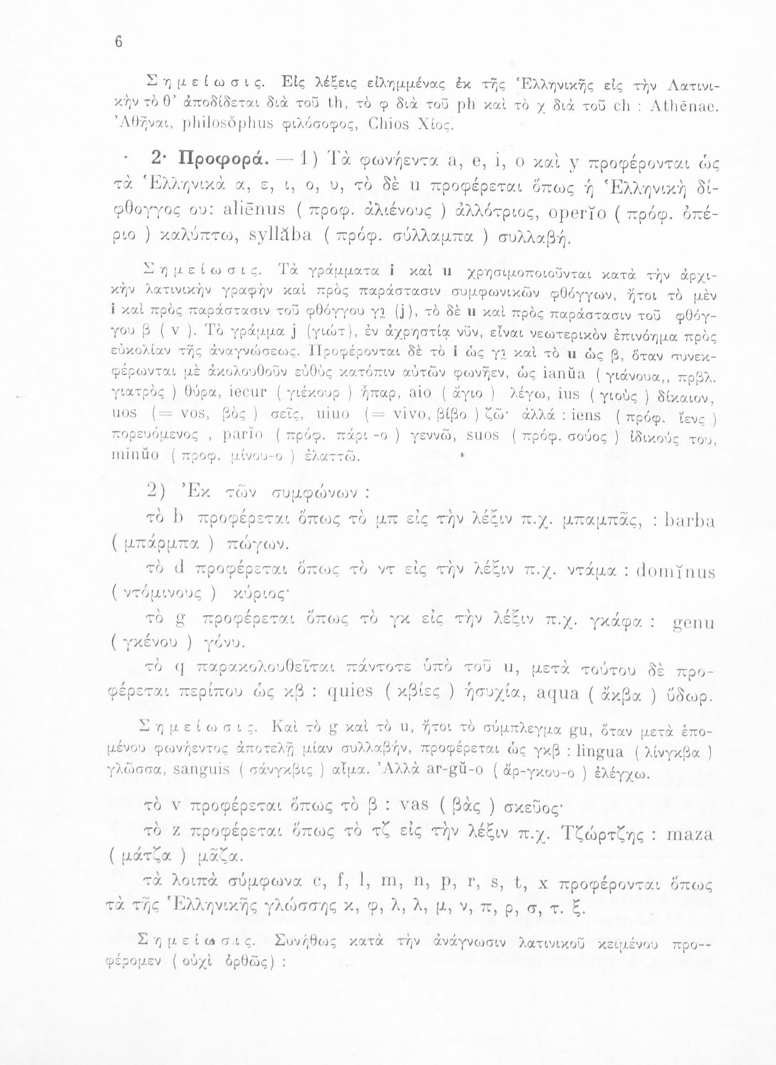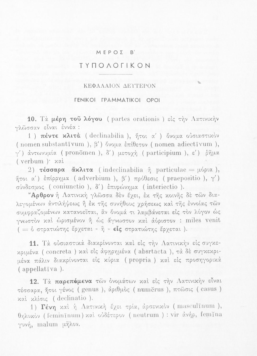 Σχολικό εγχειρίδιο Λατινικών Γυμνασίου που περιλαμβάνει γραμματική και συντακτικό και είναι χωρισμένο σε φθογγολογικό, τυπολογικό και ετυμολογικό μέρος. Φέρει το σύμβολο της δικτατορίας.