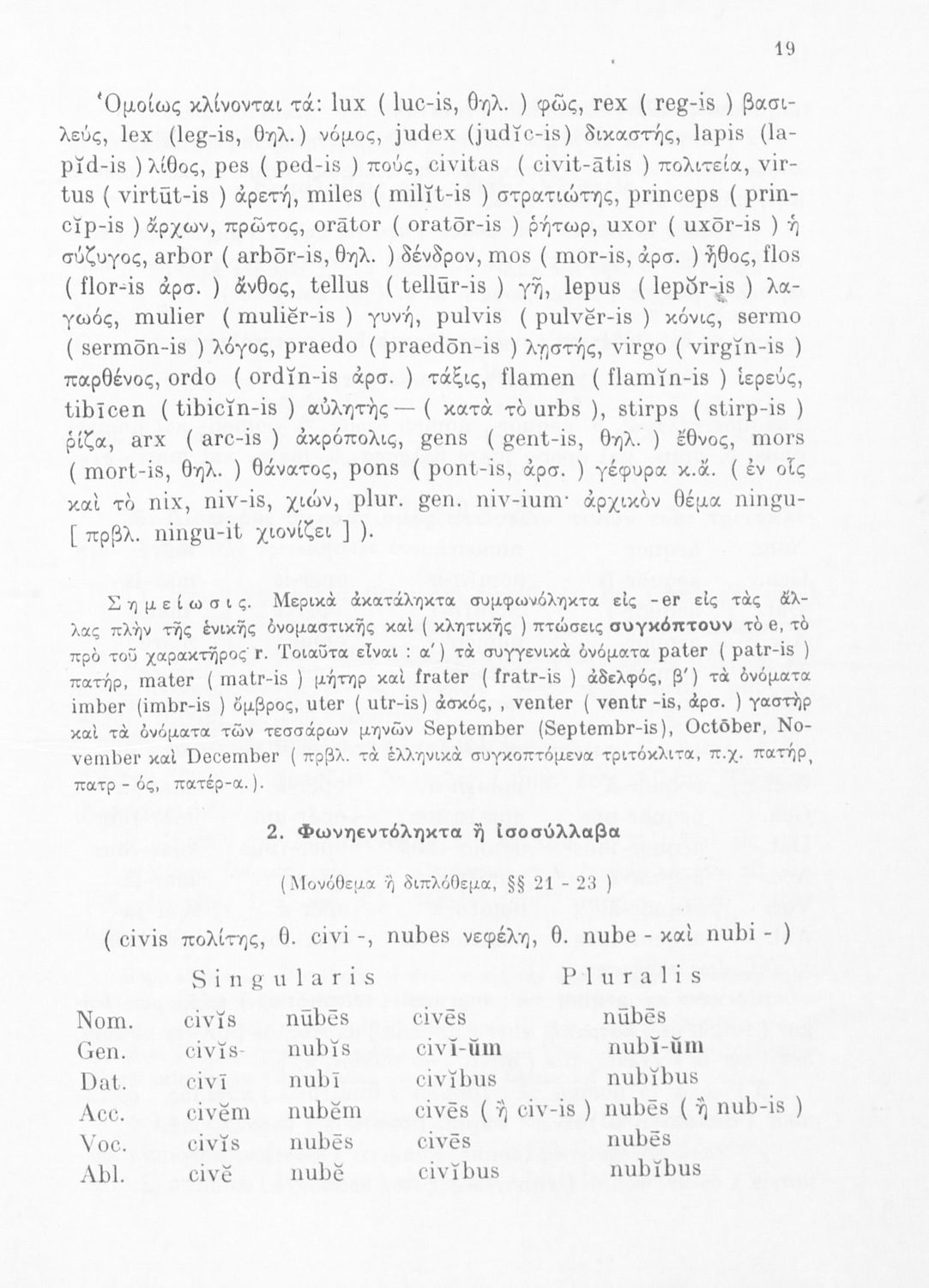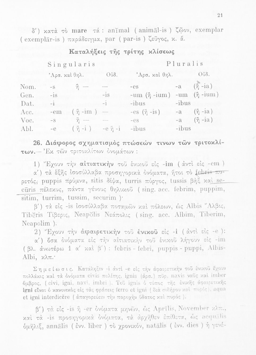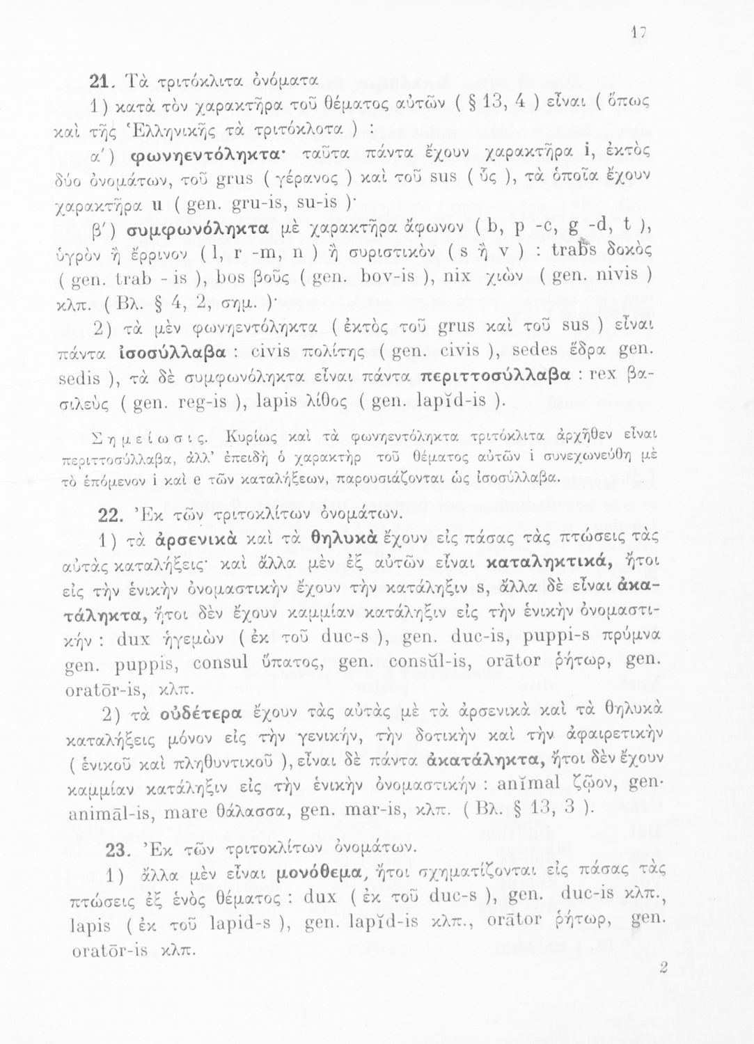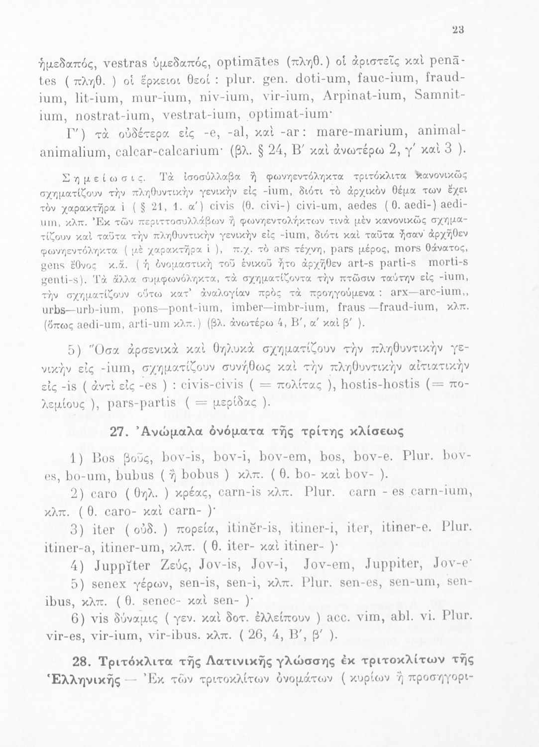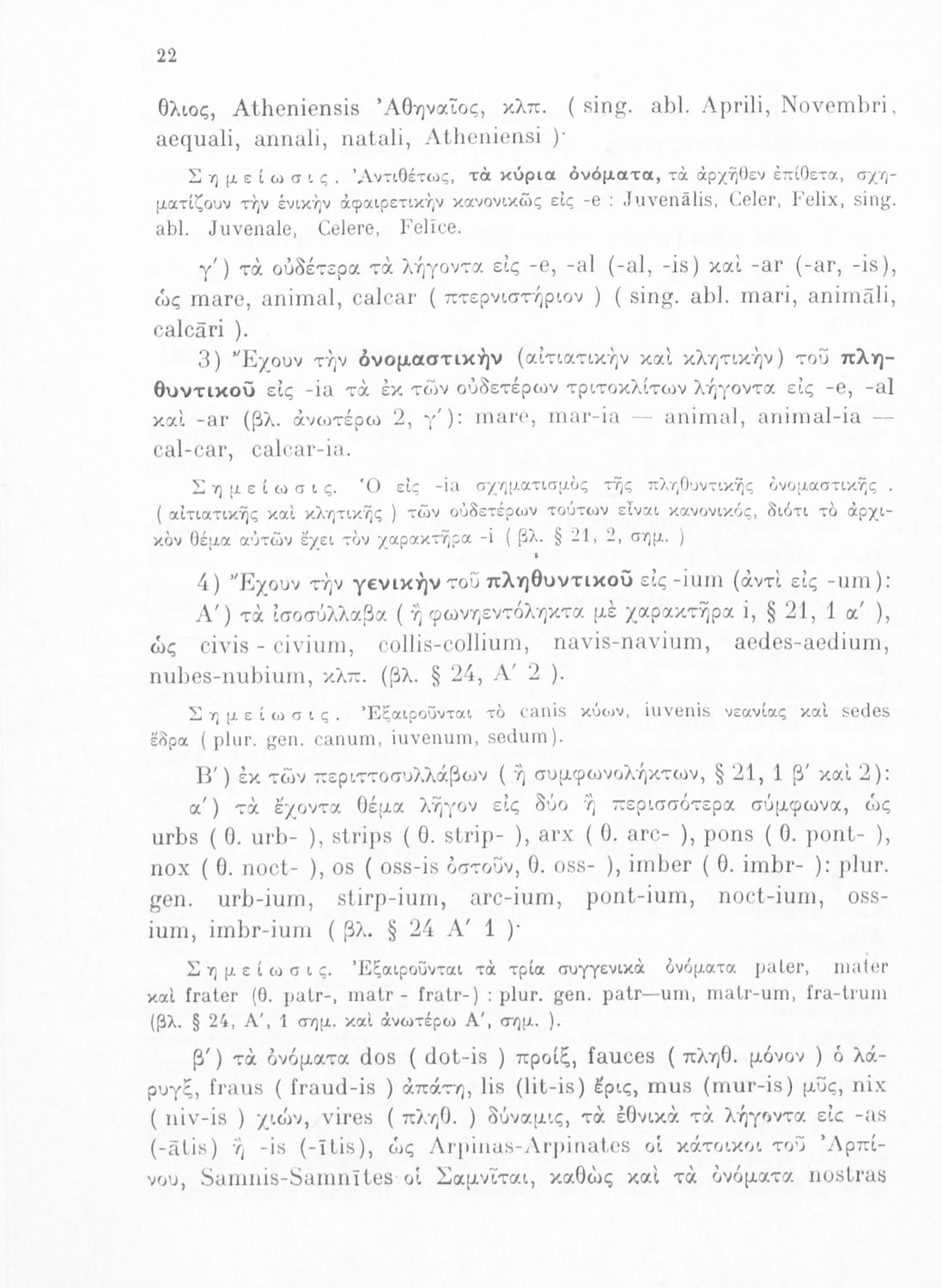 Σχολικό εγχειρίδιο Λατινικών Γυμνασίου που περιλαμβάνει γραμματική και συντακτικό και είναι χωρισμένο σε φθογγολογικό, τυπολογικό και ετυμολογικό μέρος. Φέρει το σύμβολο της δικτατορίας.