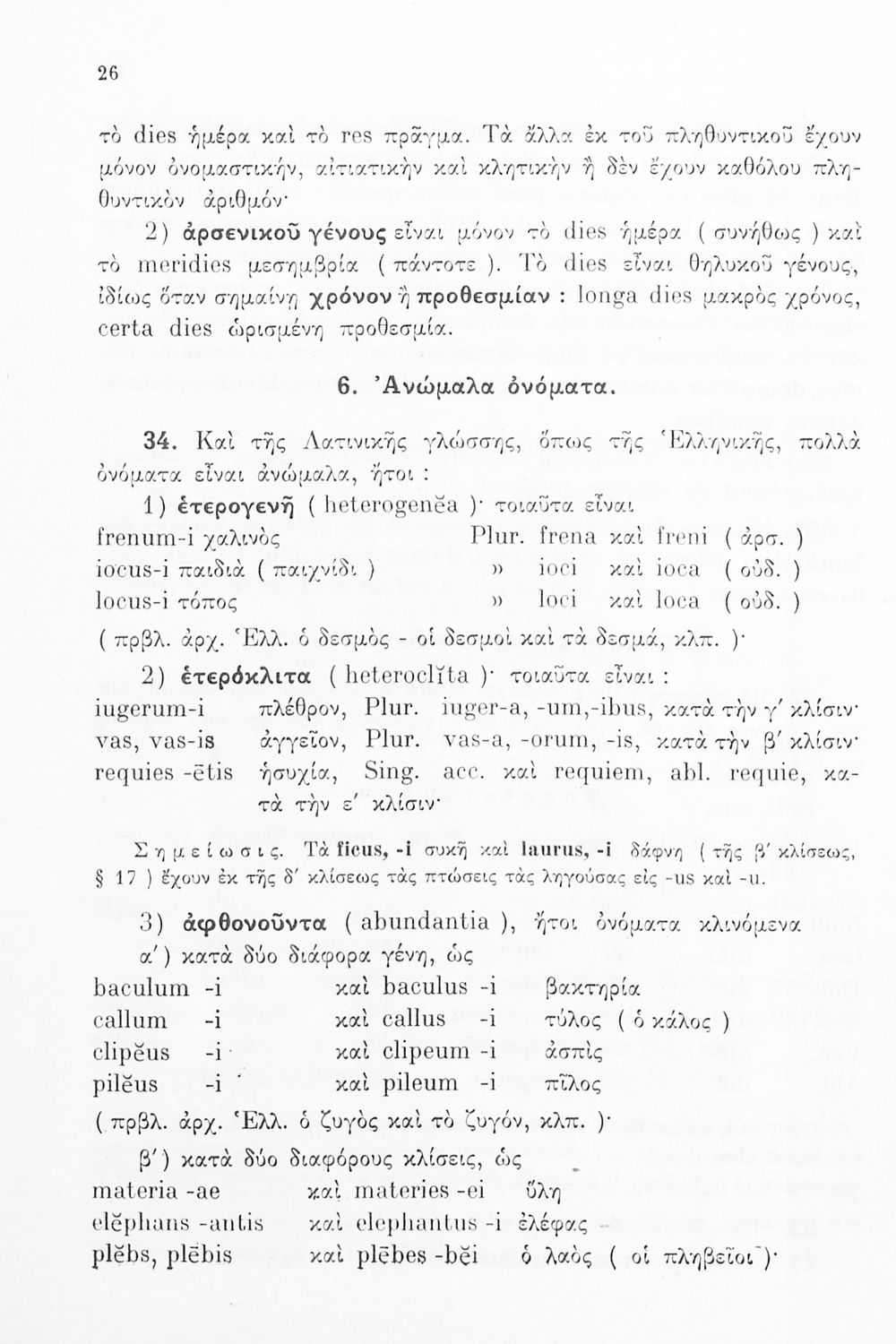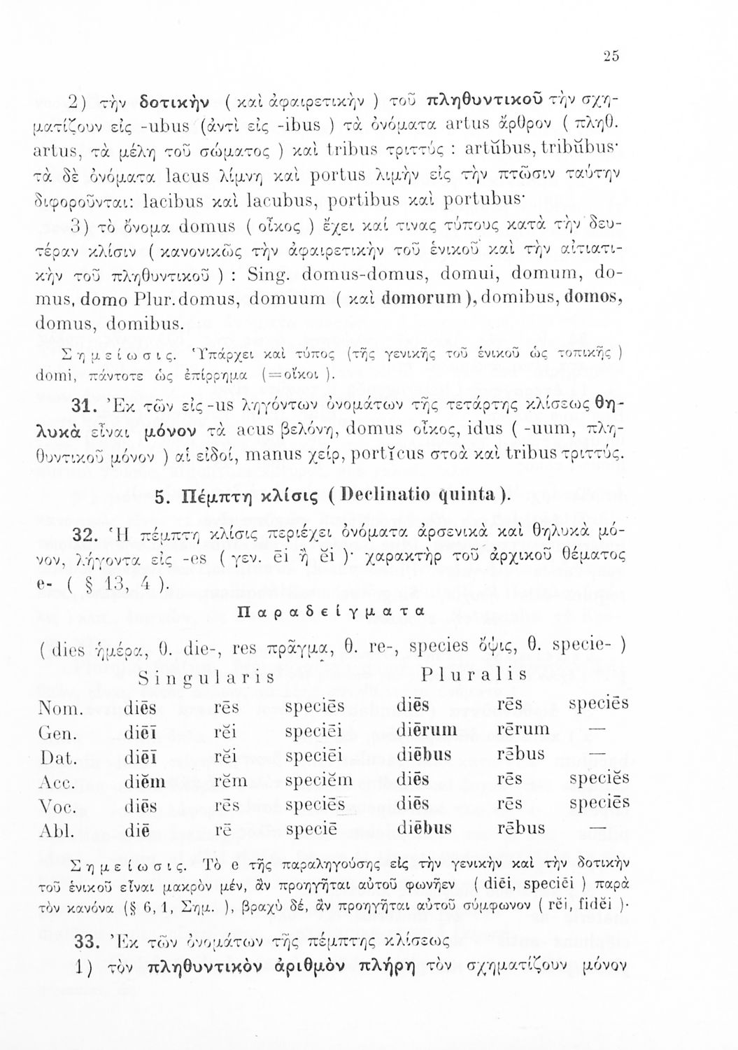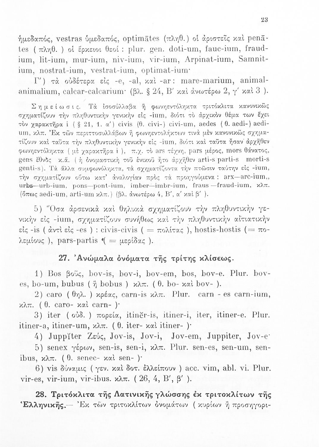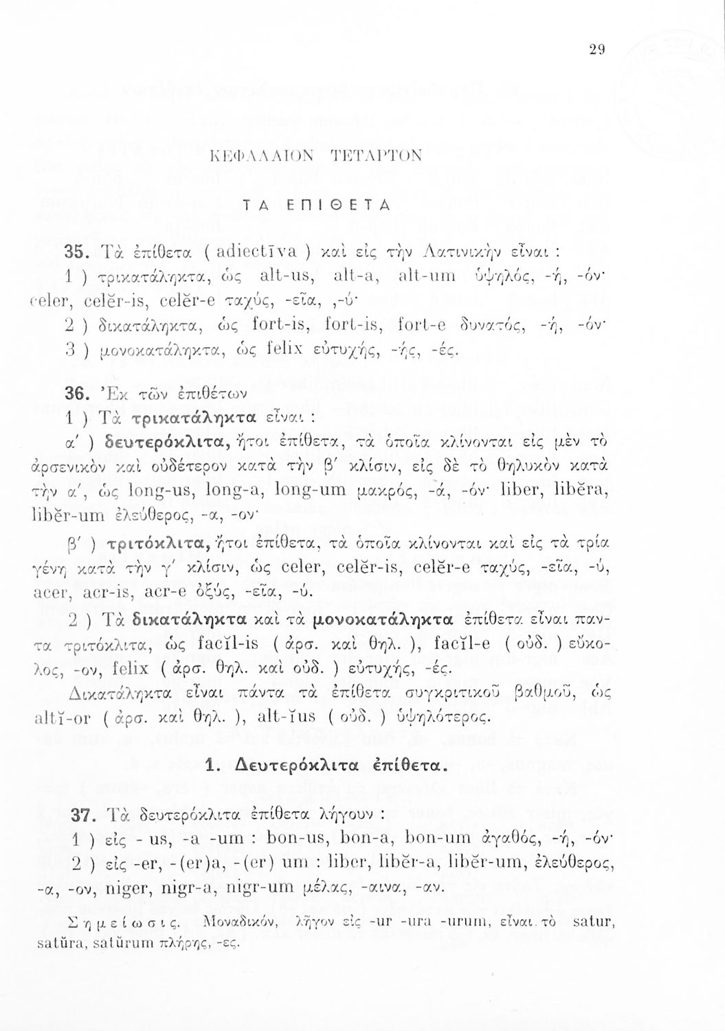Βαθμίδα εκπαίδευσης: Δευτεροβάθμια Τάξη: Δ' Γυμνασίου / Ε' Γυμνασίου / ΣΤ' Γυμνασίου Μάθημα: Νέα Ελληνικά Γλώσσα: Απλή καθαρεύουσα Παρουσίαση περιεχομένου: Σχολικό εγχειρίδιο Λατινικών Δ΄, Ε΄ και ΣΤ΄ Γυμνασίου που περιλαμβάνει γραμματική και συντακτικό και είναι χωρισμένο σε φθογγολογικό, τυπολογικό και ετυμολογικό μέρος. Φέρει το σύμβολο της δικτατορίας. |