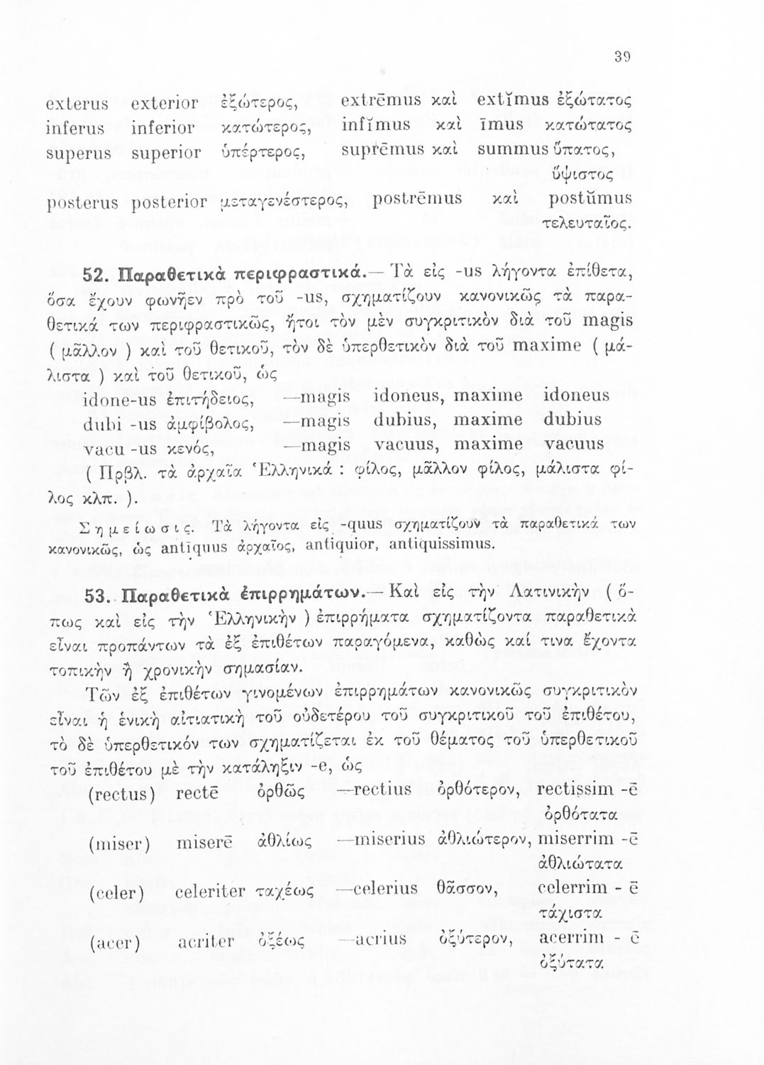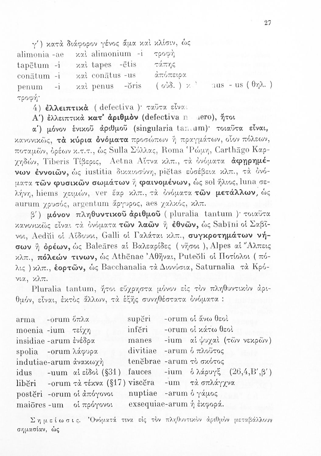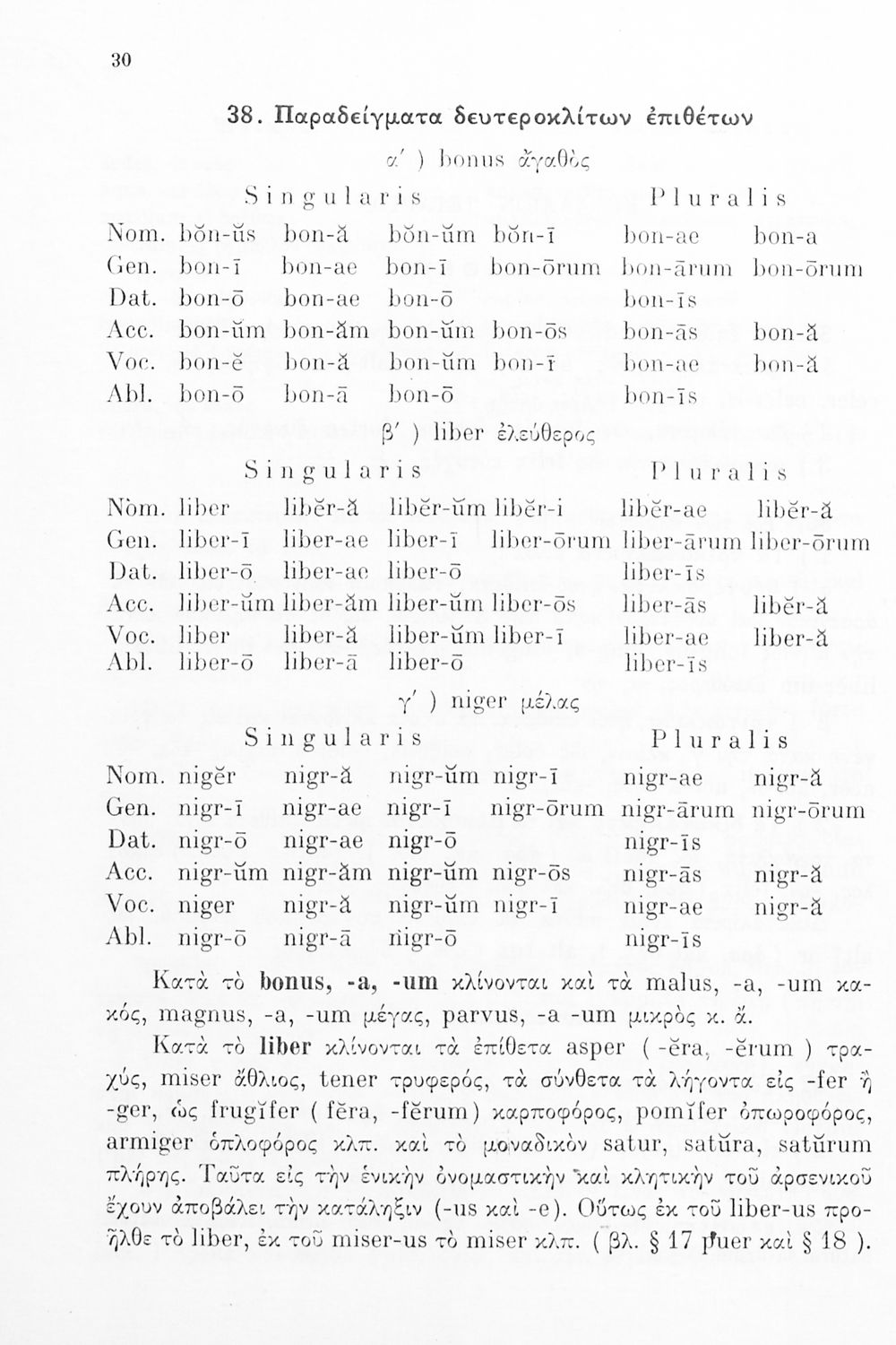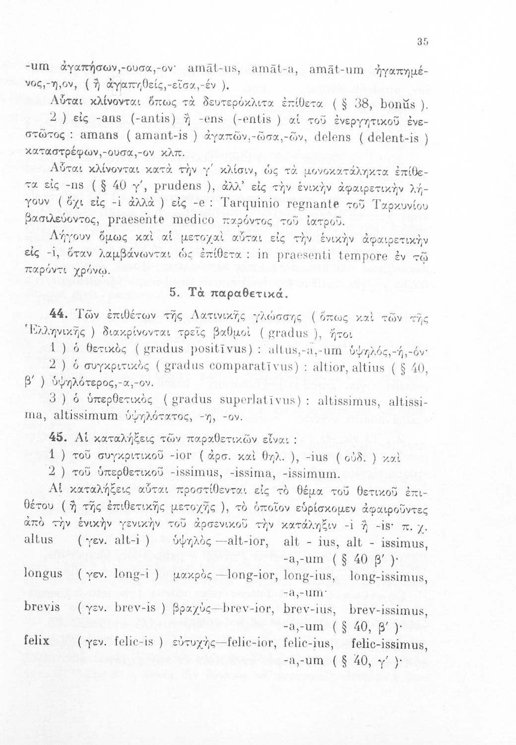 Βαθμίδα εκπαίδευσης: Δευτεροβάθμια Τάξη: Δ' Γυμνασίου / Ε' Γυμνασίου / ΣΤ' Γυμνασίου Μάθημα: Νέα Ελληνικά Γλώσσα: Απλή καθαρεύουσα Παρουσίαση περιεχομένου: Σχολικό εγχειρίδιο Λατινικών Δ΄, Ε΄ και ΣΤ΄ Γυμνασίου που περιλαμβάνει γραμματική και συντακτικό και είναι χωρισμένο σε φθογγολογικό, τυπολογικό και ετυμολογικό μέρος. Φέρει το σύμβολο της δικτατορίας. |