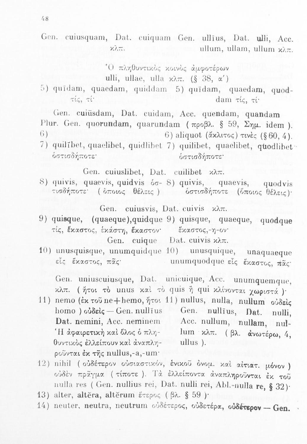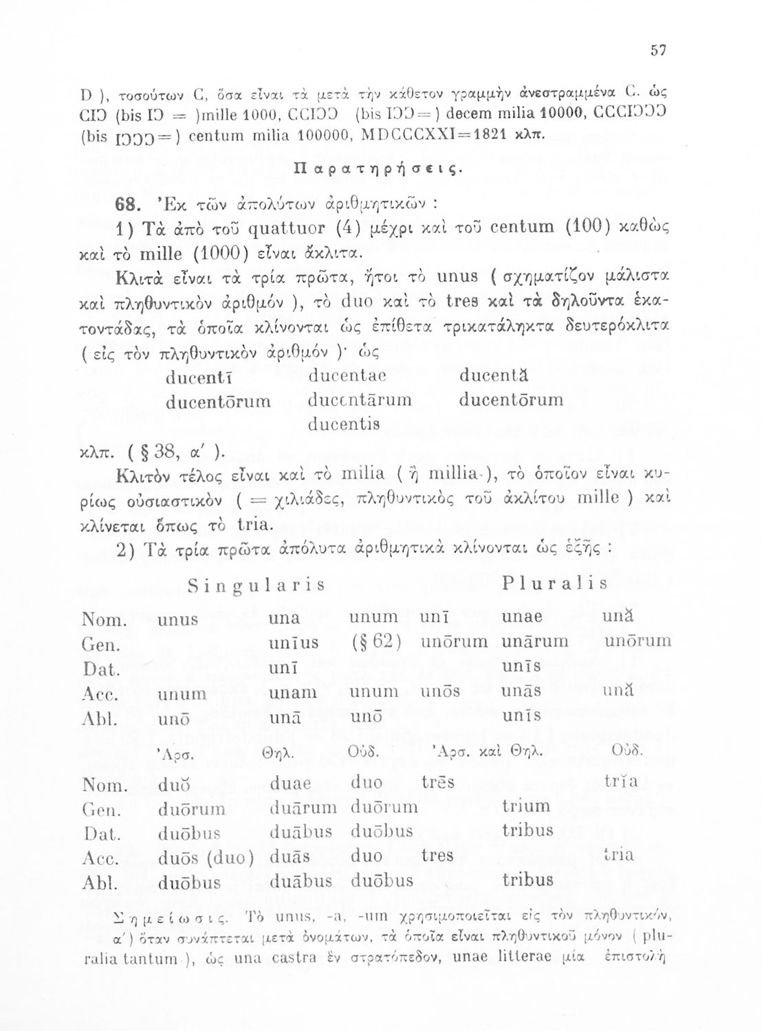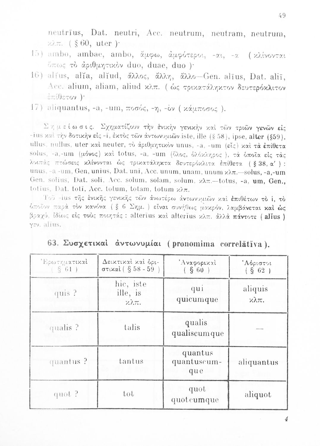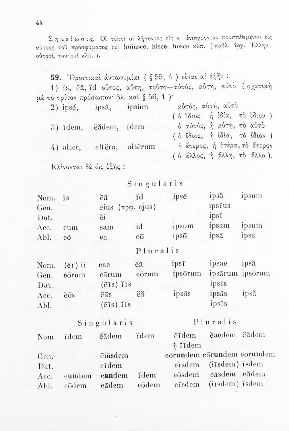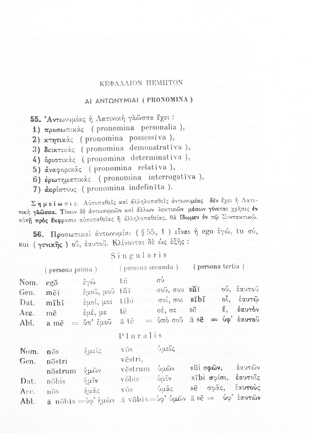 Σχολικό εγχειρίδιο Λατινικών Δ΄, Ε΄ και ΣΤ΄ Γυμνασίου που περιλαμβάνει γραμματική και συντακτικό και είναι χωρισμένο σε φθογγολογικό, τυπολογικό και ετυμολογικό μέρος. Φέρει το σύμβολο της δικτατορίας.
