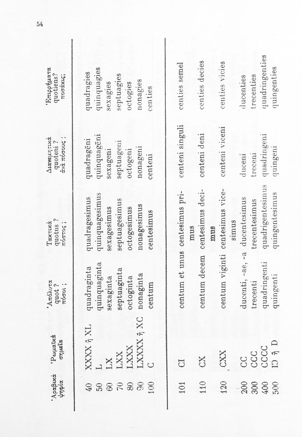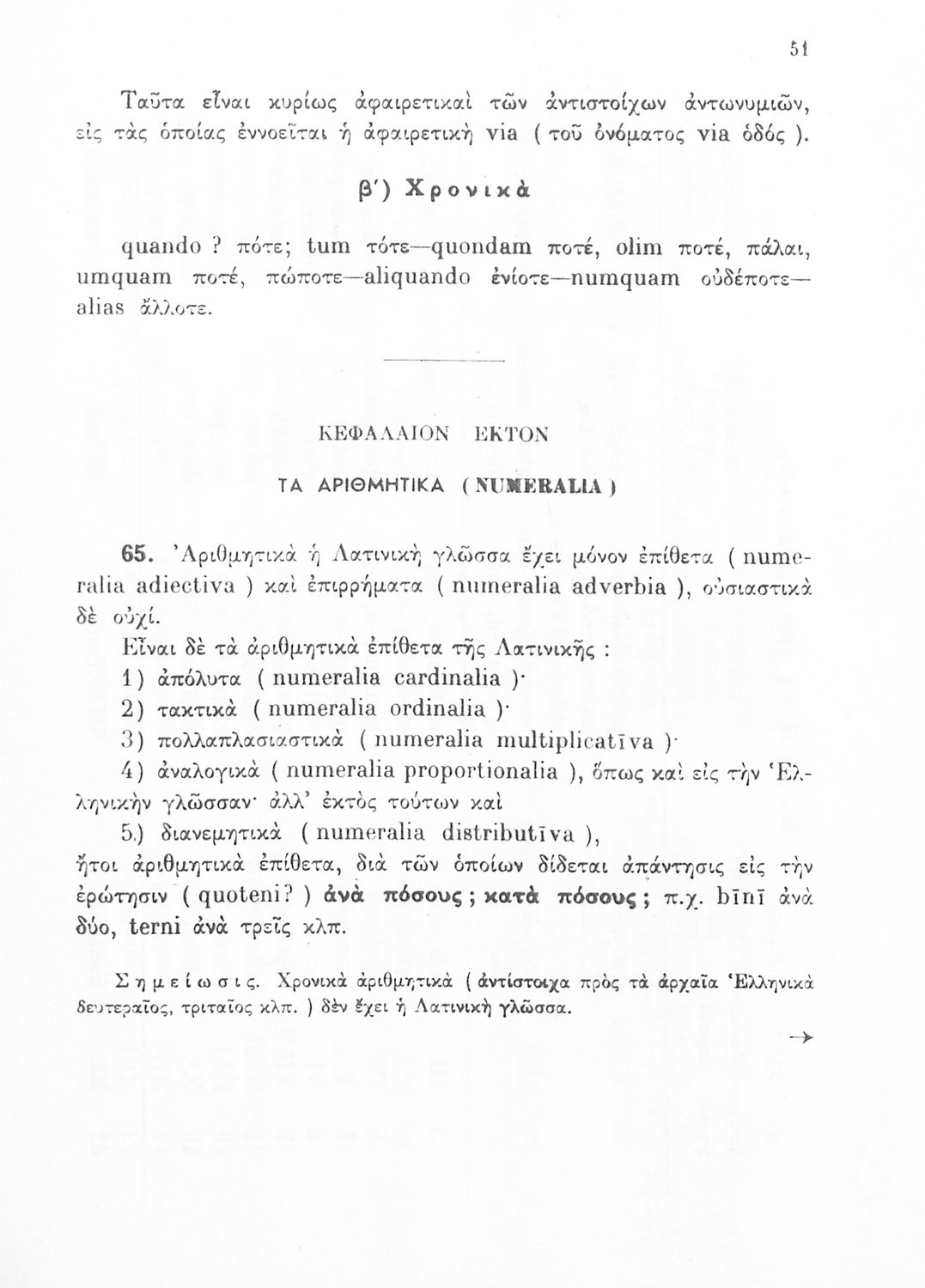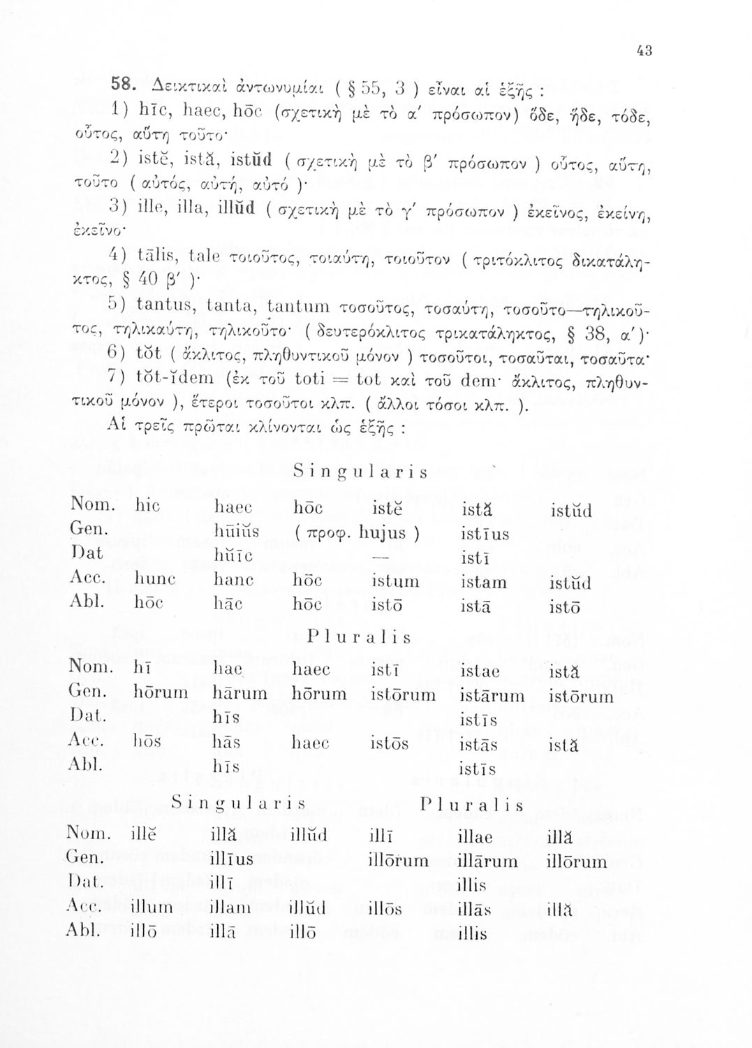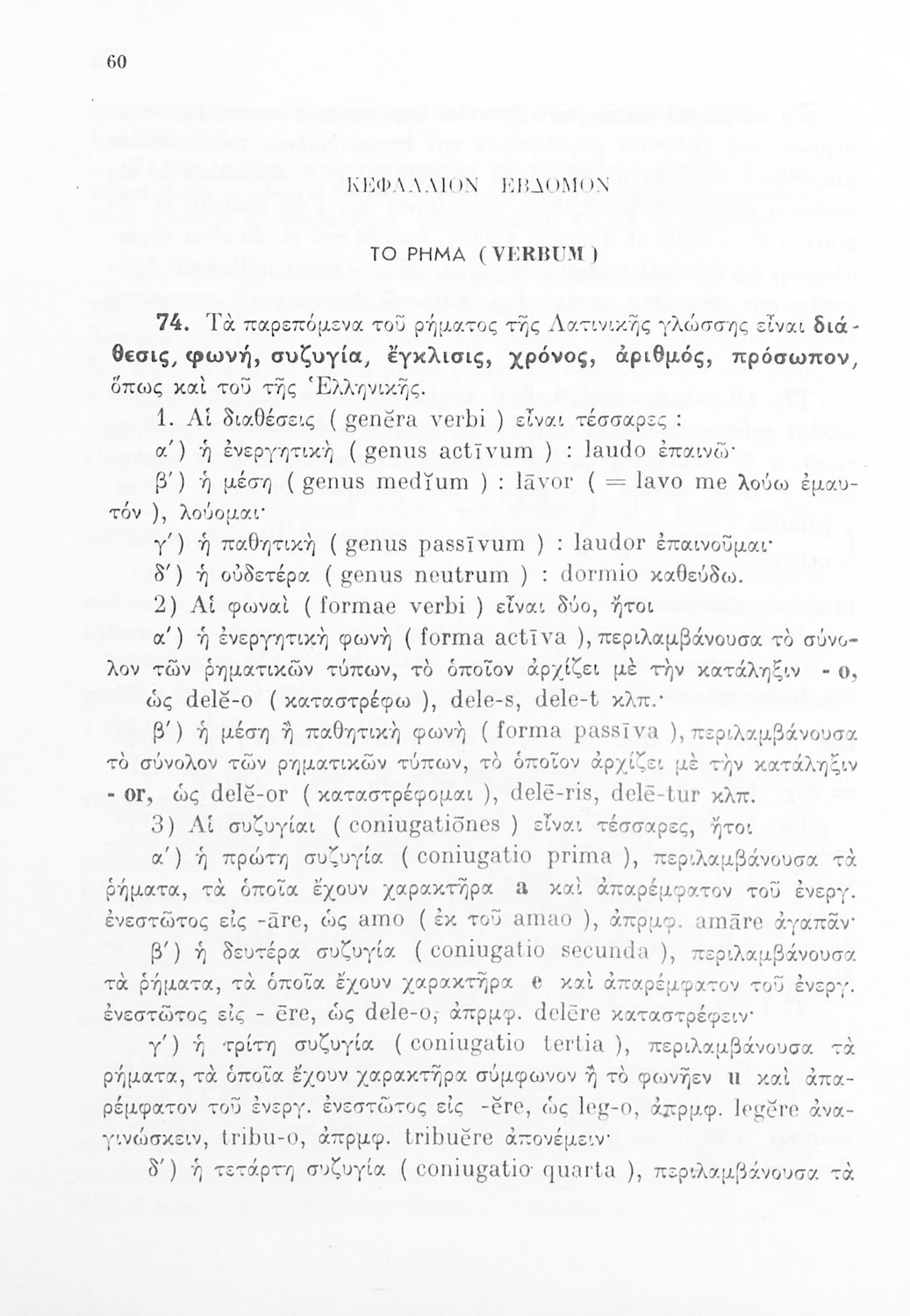 Βαθμίδα εκπαίδευσης: Δευτεροβάθμια Τάξη: Δ' Γυμνασίου / Ε' Γυμνασίου / ΣΤ' Γυμνασίου Μάθημα: Νέα Ελληνικά Γλώσσα: Απλή καθαρεύουσα Παρουσίαση περιεχομένου: Σχολικό εγχειρίδιο Λατινικών Δ΄, Ε΄ και ΣΤ΄ Γυμνασίου που περιλαμβάνει γραμματική και συντακτικό και είναι χωρισμένο σε φθογγολογικό, τυπολογικό και ετυμολογικό μέρος. Φέρει το σύμβολο της δικτατορίας. |