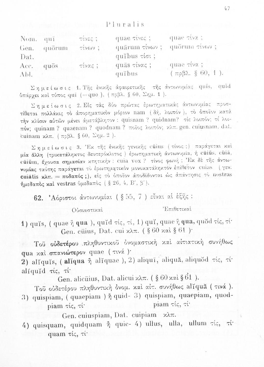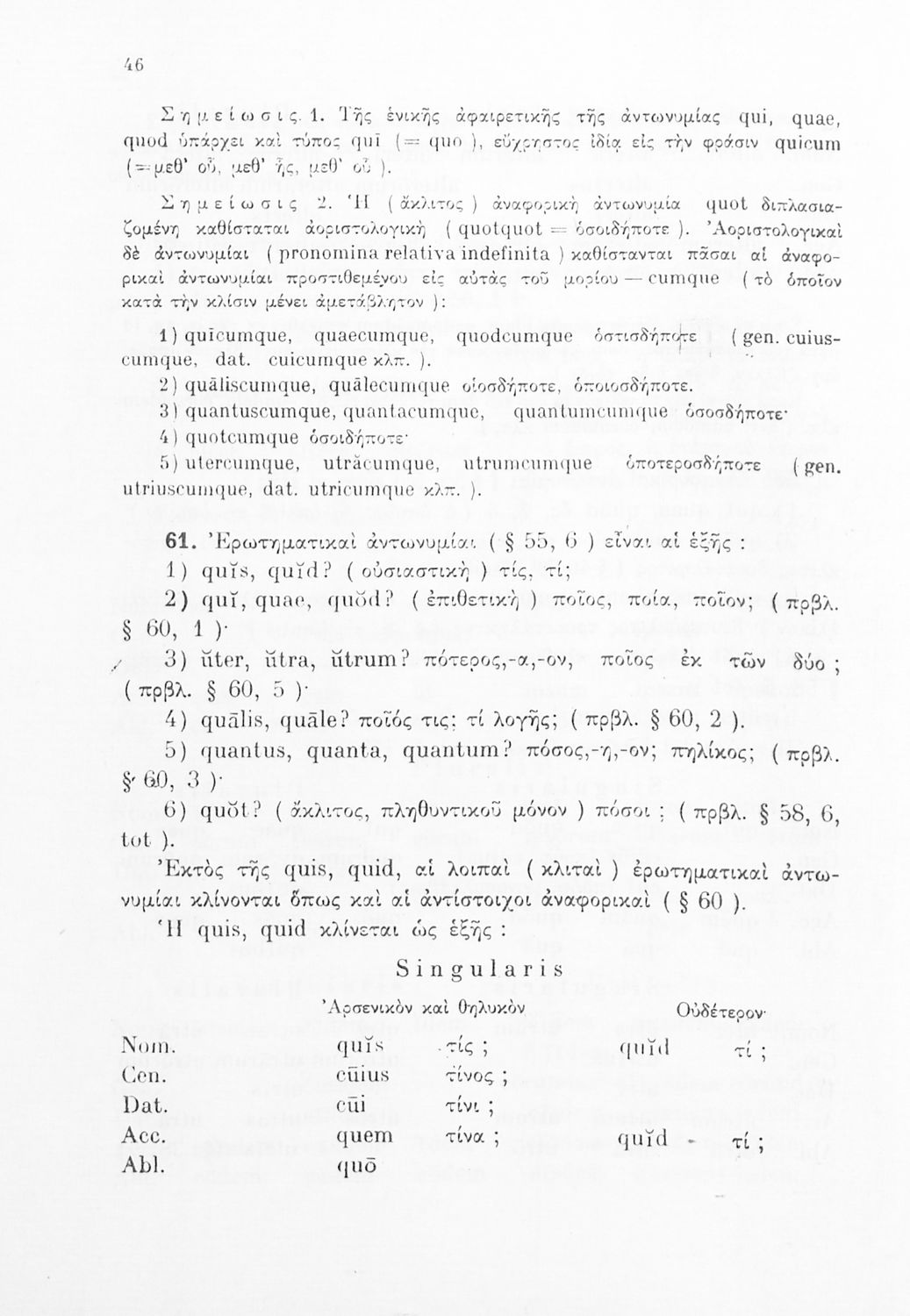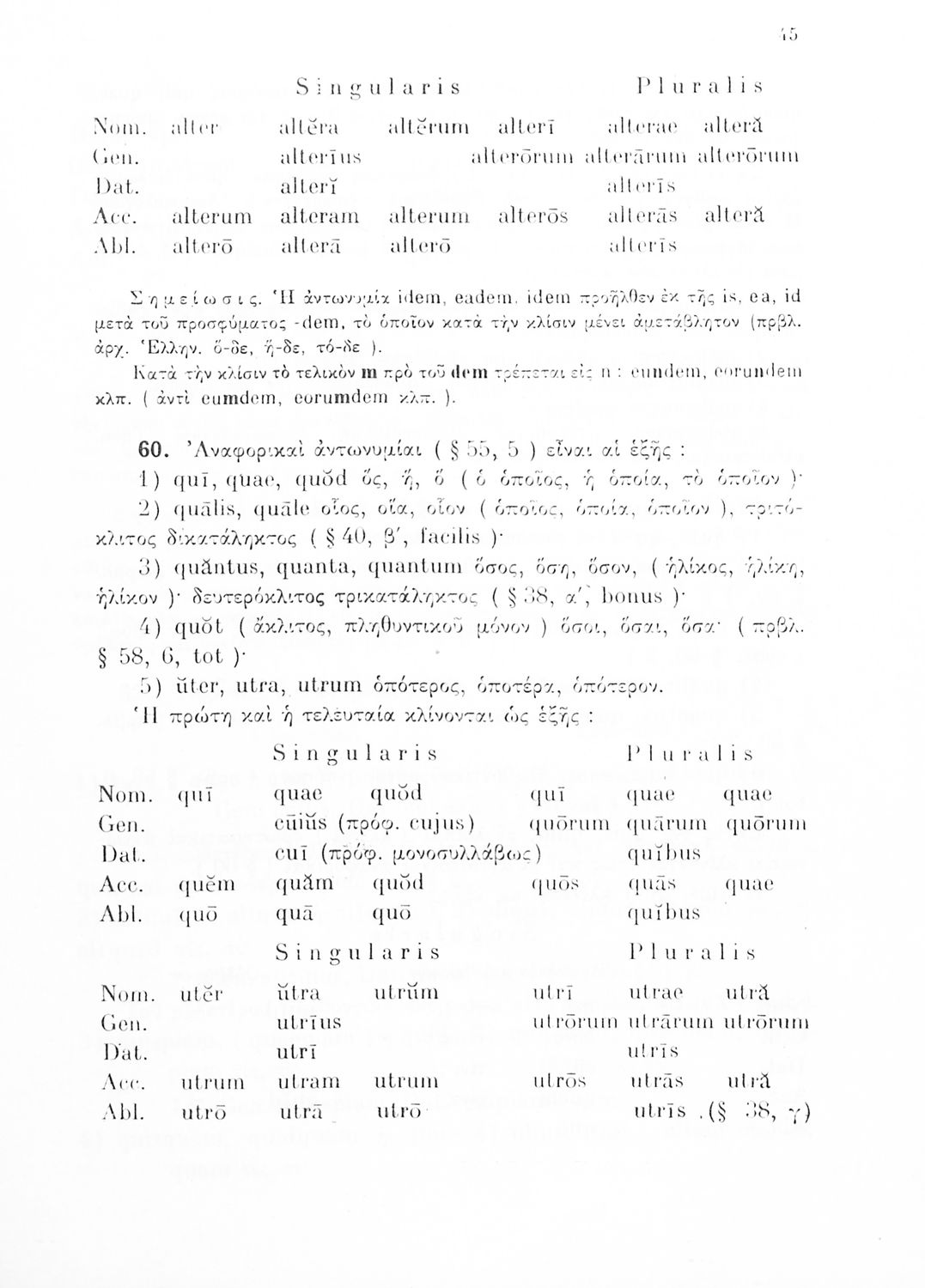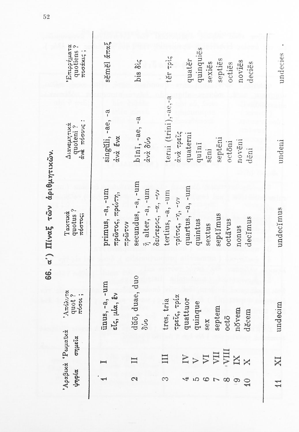 Βαθμίδα εκπαίδευσης: Δευτεροβάθμια Τάξη: Δ' Γυμνασίου / Ε' Γυμνασίου / ΣΤ' Γυμνασίου Μάθημα: Νέα Ελληνικά Γλώσσα: Απλή καθαρεύουσα Παρουσίαση περιεχομένου: Σχολικό εγχειρίδιο Λατινικών Δ΄, Ε΄ και ΣΤ΄ Γυμνασίου που περιλαμβάνει γραμματική και συντακτικό και είναι χωρισμένο σε φθογγολογικό, τυπολογικό και ετυμολογικό μέρος. Φέρει το σύμβολο της δικτατορίας. |