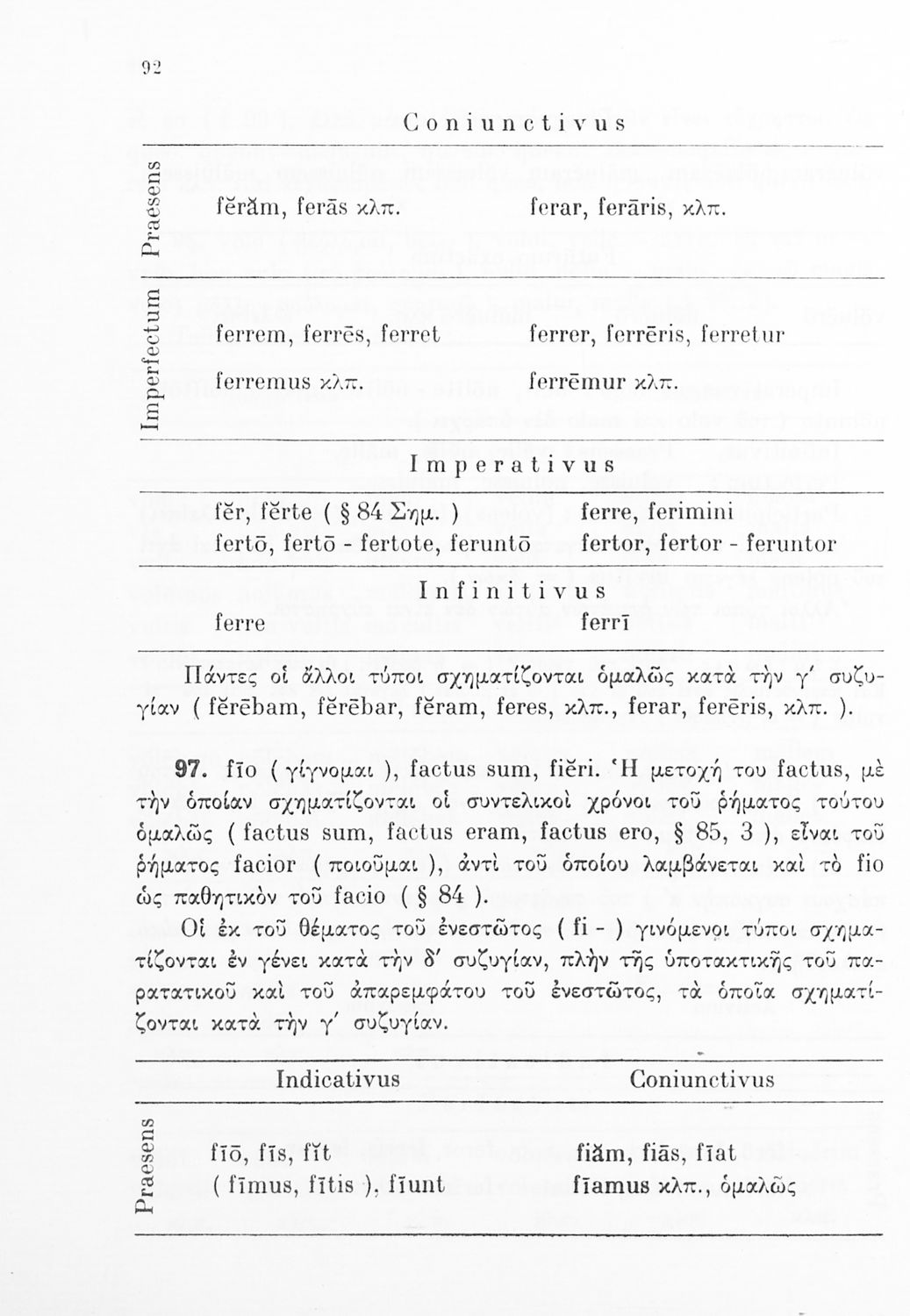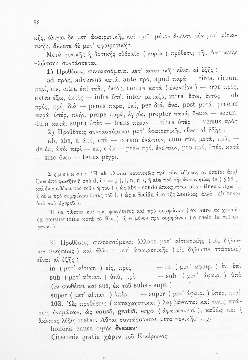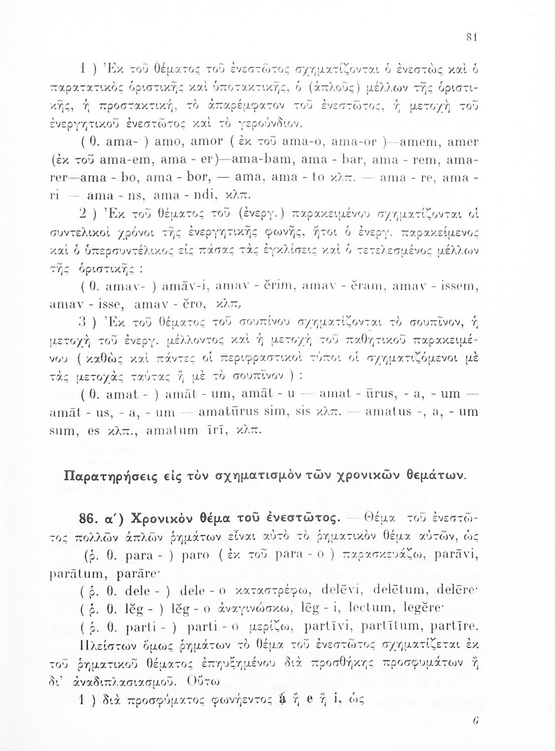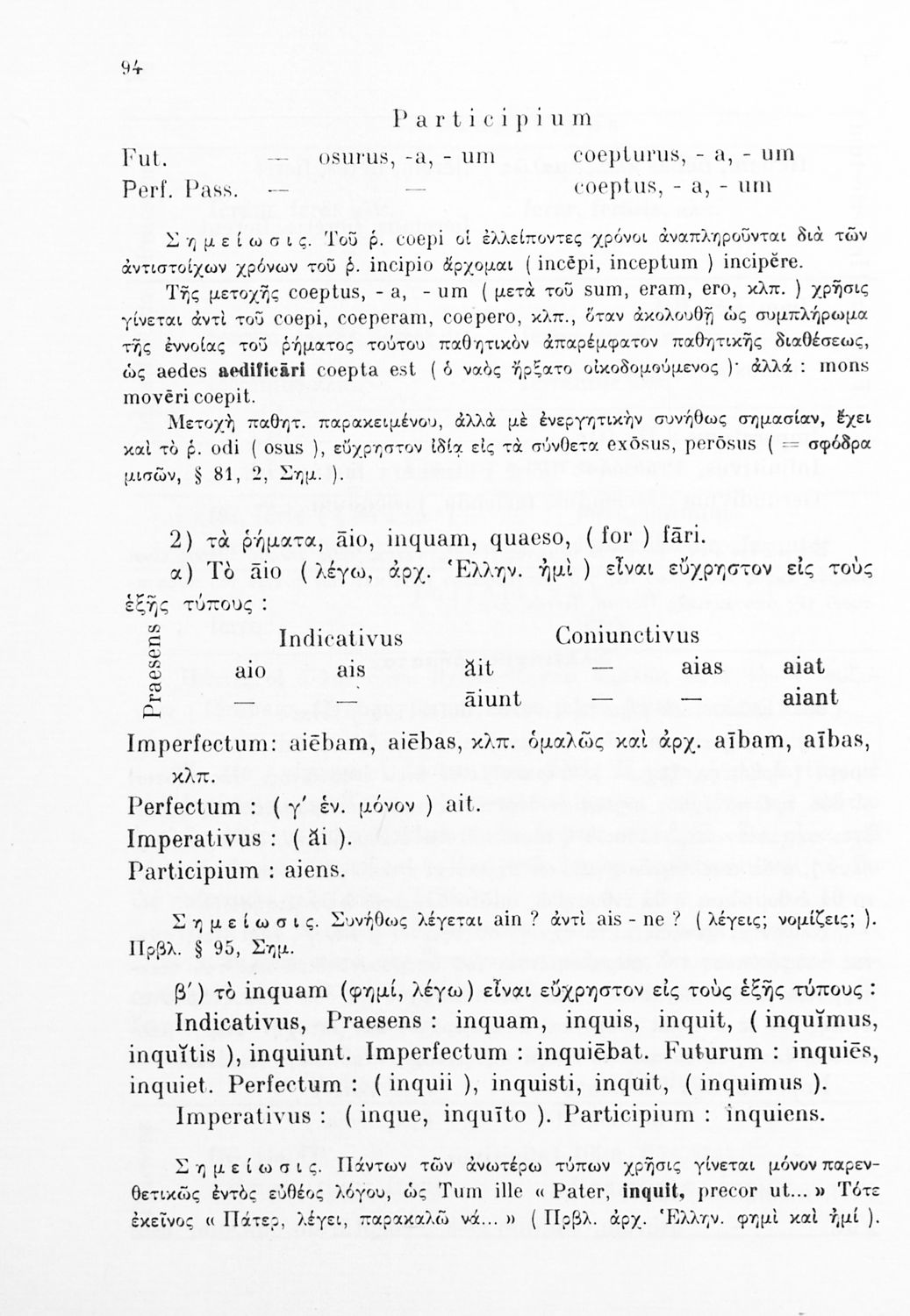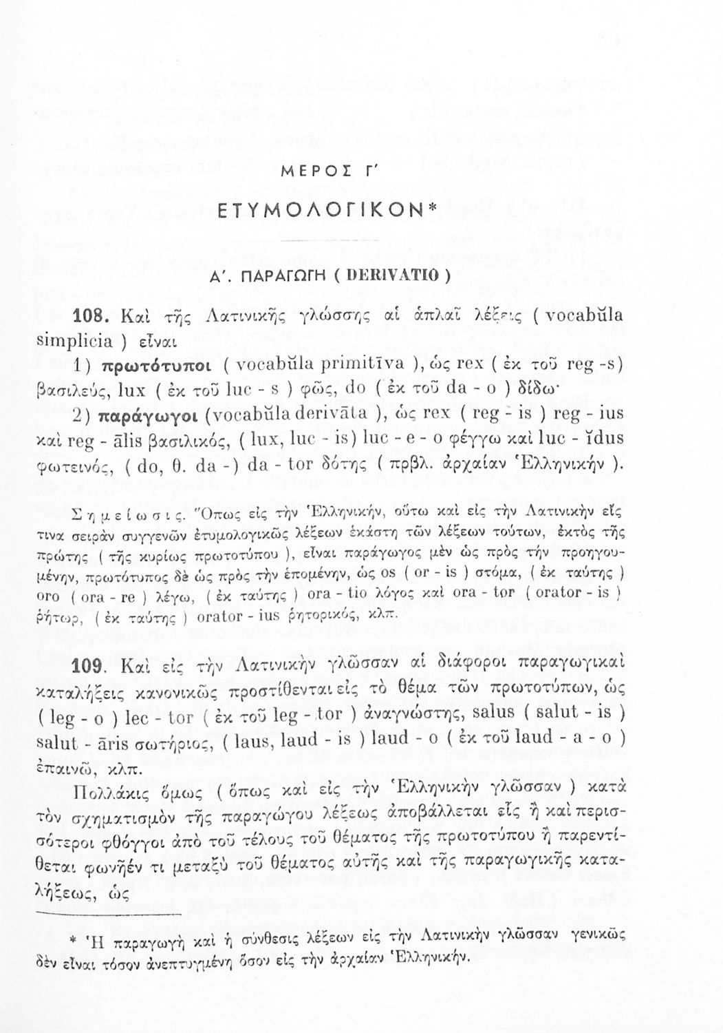 Σχολικό εγχειρίδιο Λατινικών Γυμνασίου που περιλαμβάνει γραμματική και συντακτικό και είναι χωρισμένο σε φθογγολογικό, τυπολογικό και ετυμολογικό μέρος.