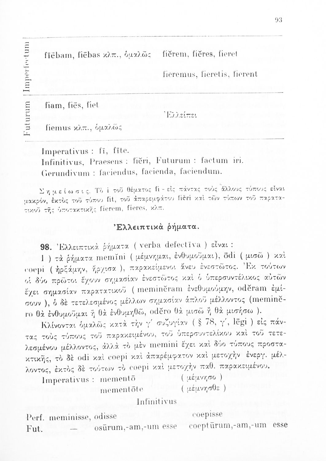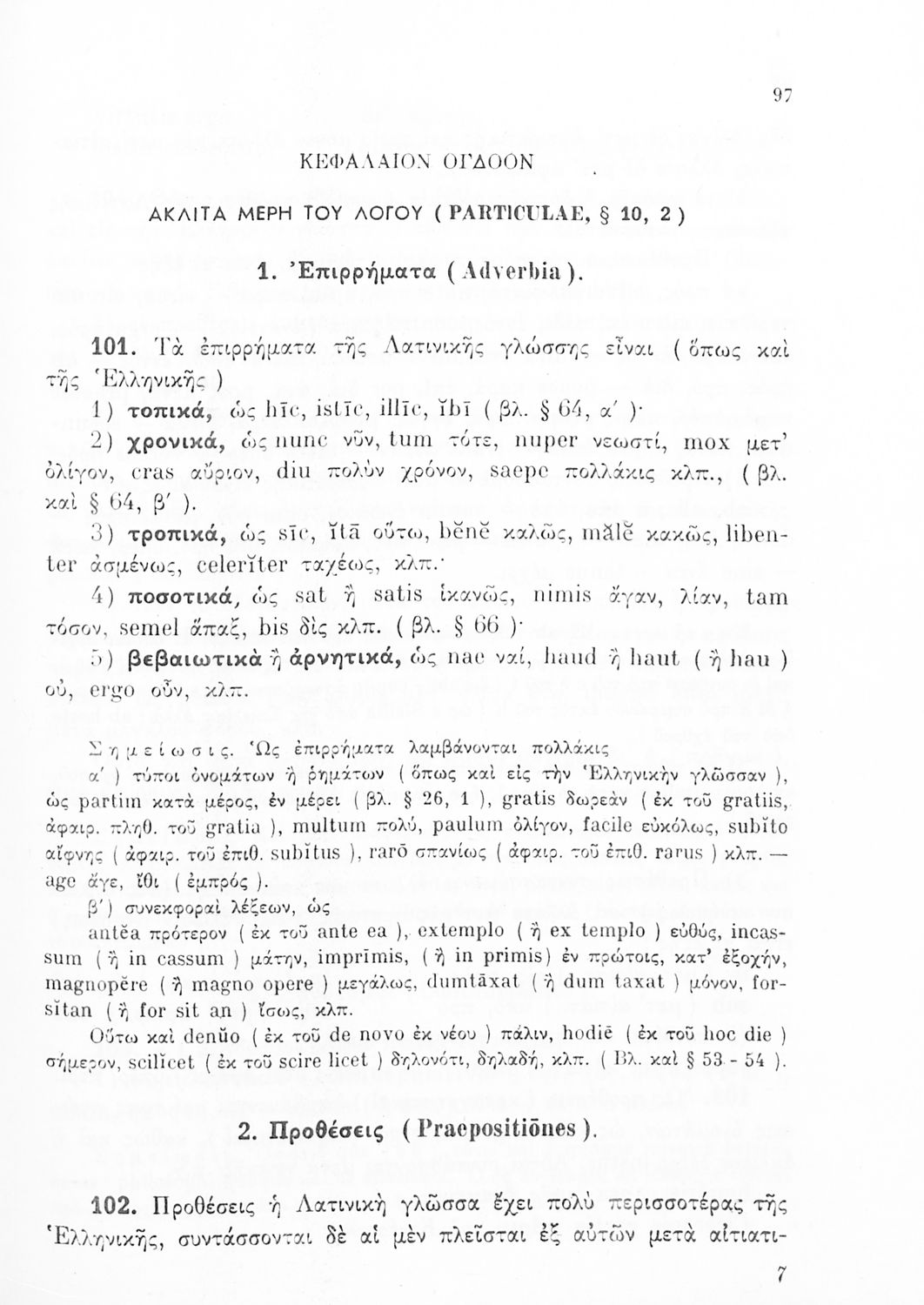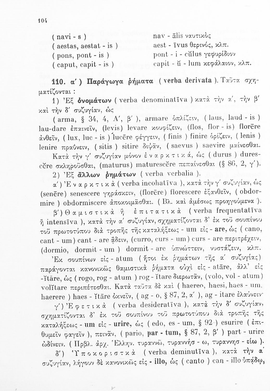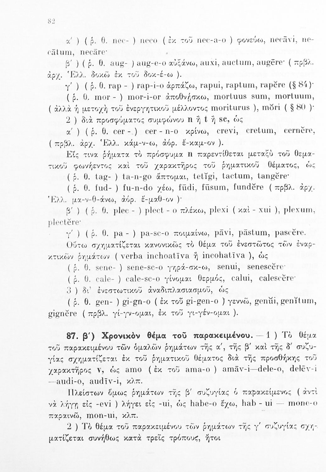 Σχολικό εγχειρίδιο Λατινικών Γυμνασίου που περιλαμβάνει γραμματική και συντακτικό και είναι χωρισμένο σε φθογγολογικό, τυπολογικό και ετυμολογικό μέρος.