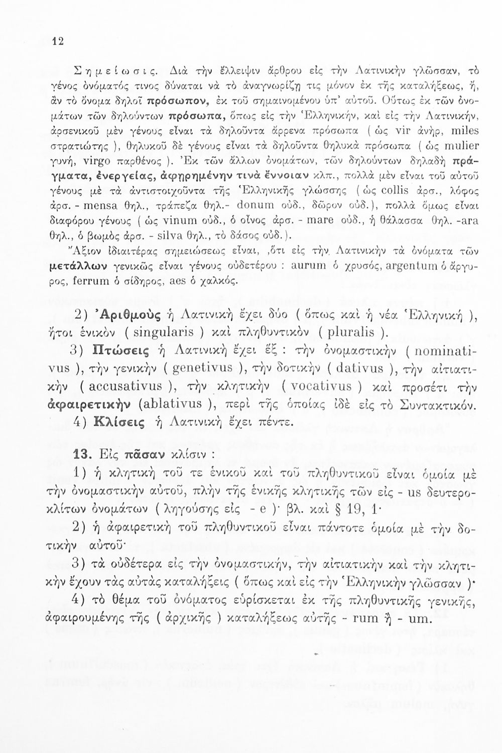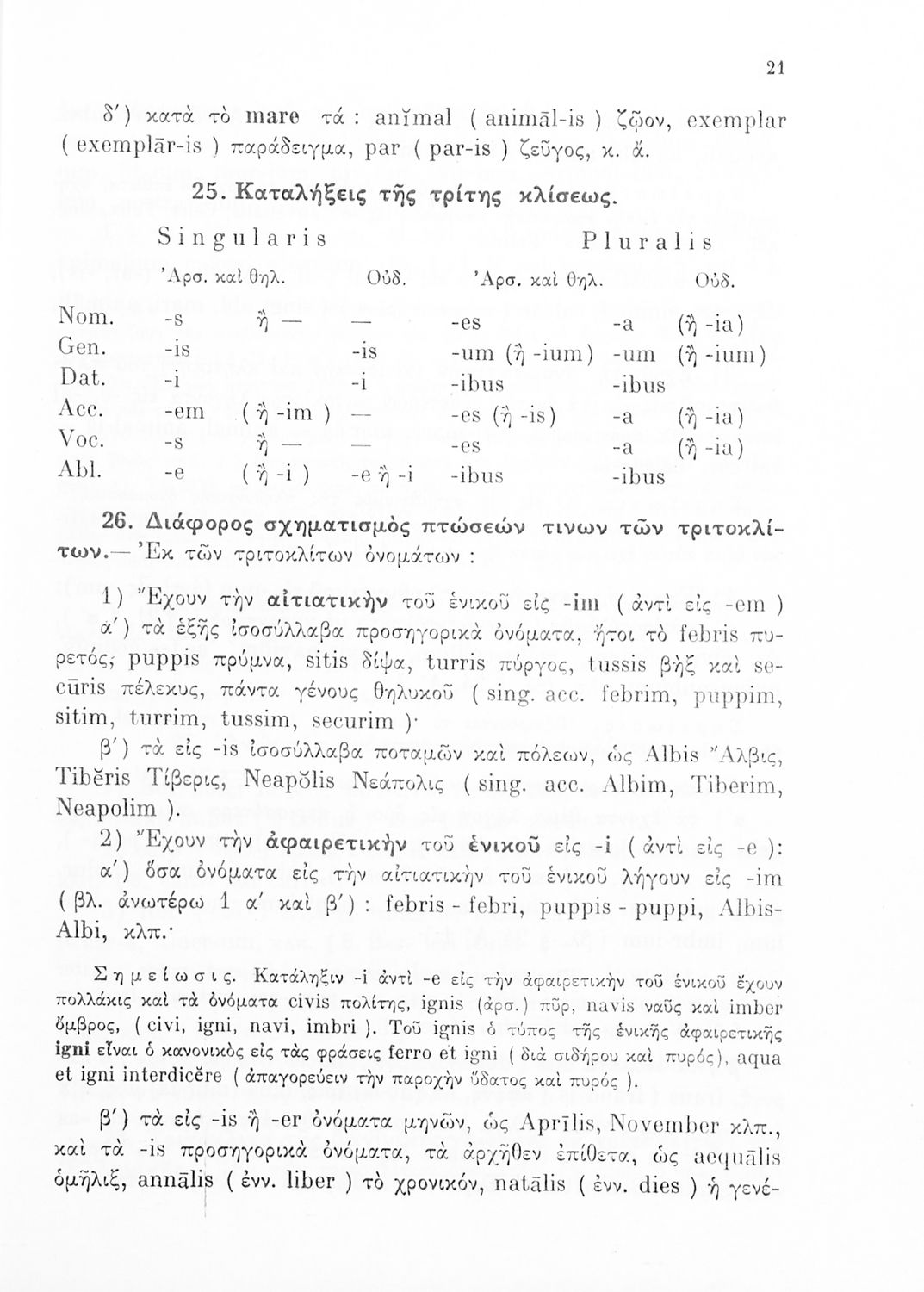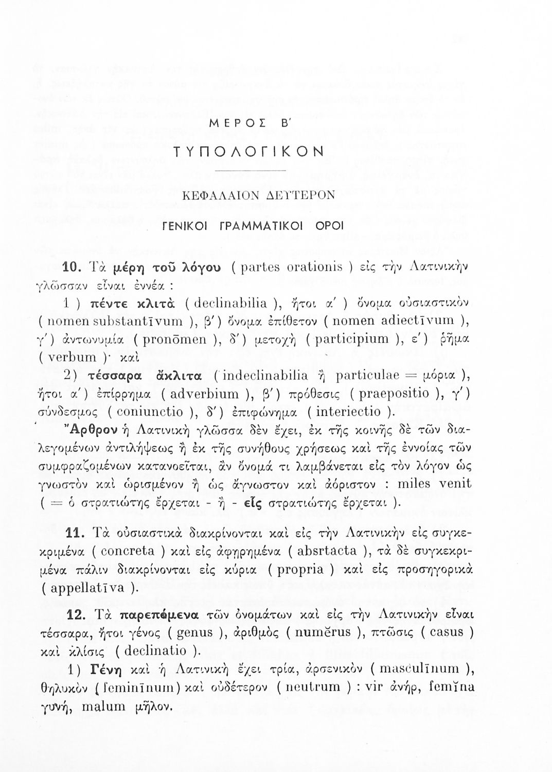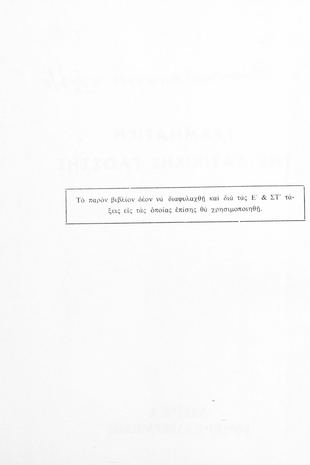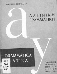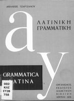 Βαθμίδα εκπαίδευσης: Δευτεροβάθμια Τάξη: Δ' Γυμνασίου / Ε' Γυμνασίου / ΣΤ' Γυμνασίου Μάθημα: Νέα Ελληνικά Γλώσσα: Απλή καθαρεύουσα Παρουσίαση περιεχομένου: Σχολικό εγχειρίδιο Λατινικών Δ΄, Ε΄ και ΣΤ΄ Γυμνασίου που περιλαμβάνει γραμματική και συντακτικό και είναι χωρισμένο σε φθογγολογικό, τυπολογικό και ετυμολογικό μέρος. Φέρει το σύμβολο της δικτατορίας. |