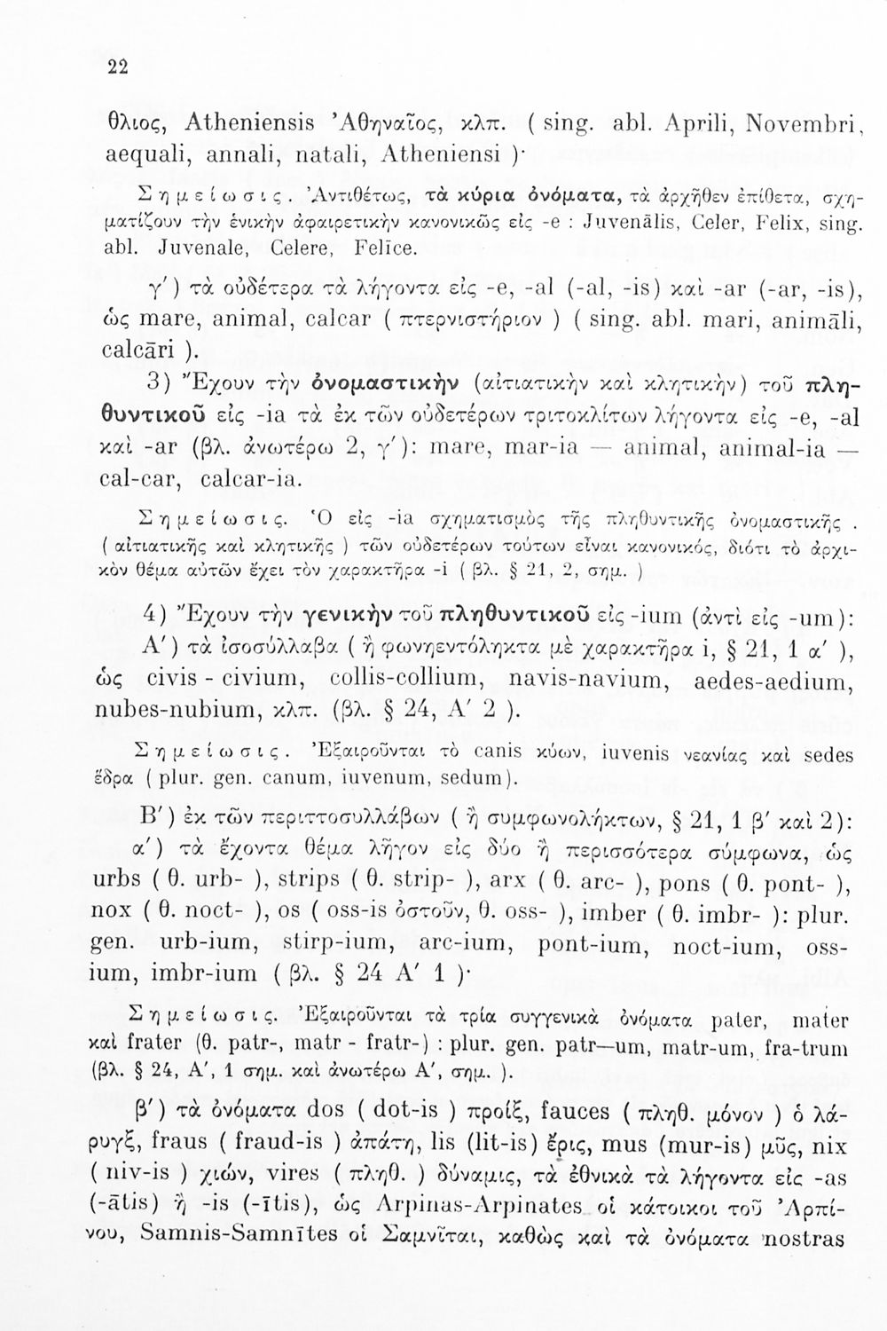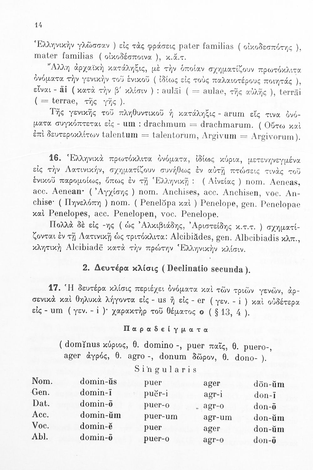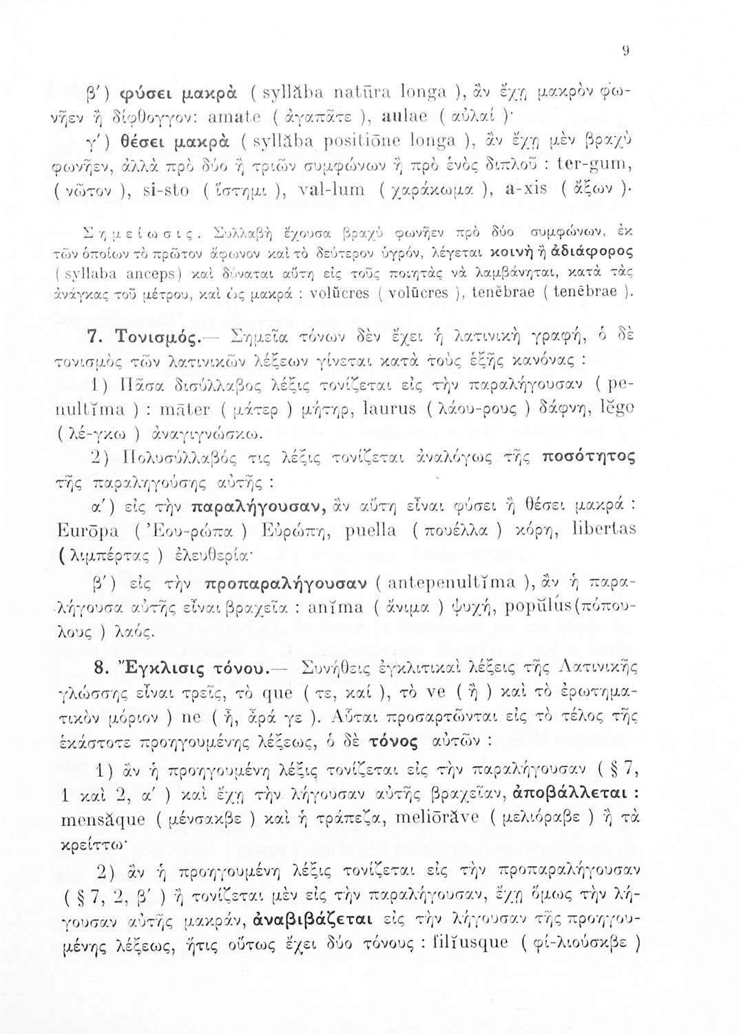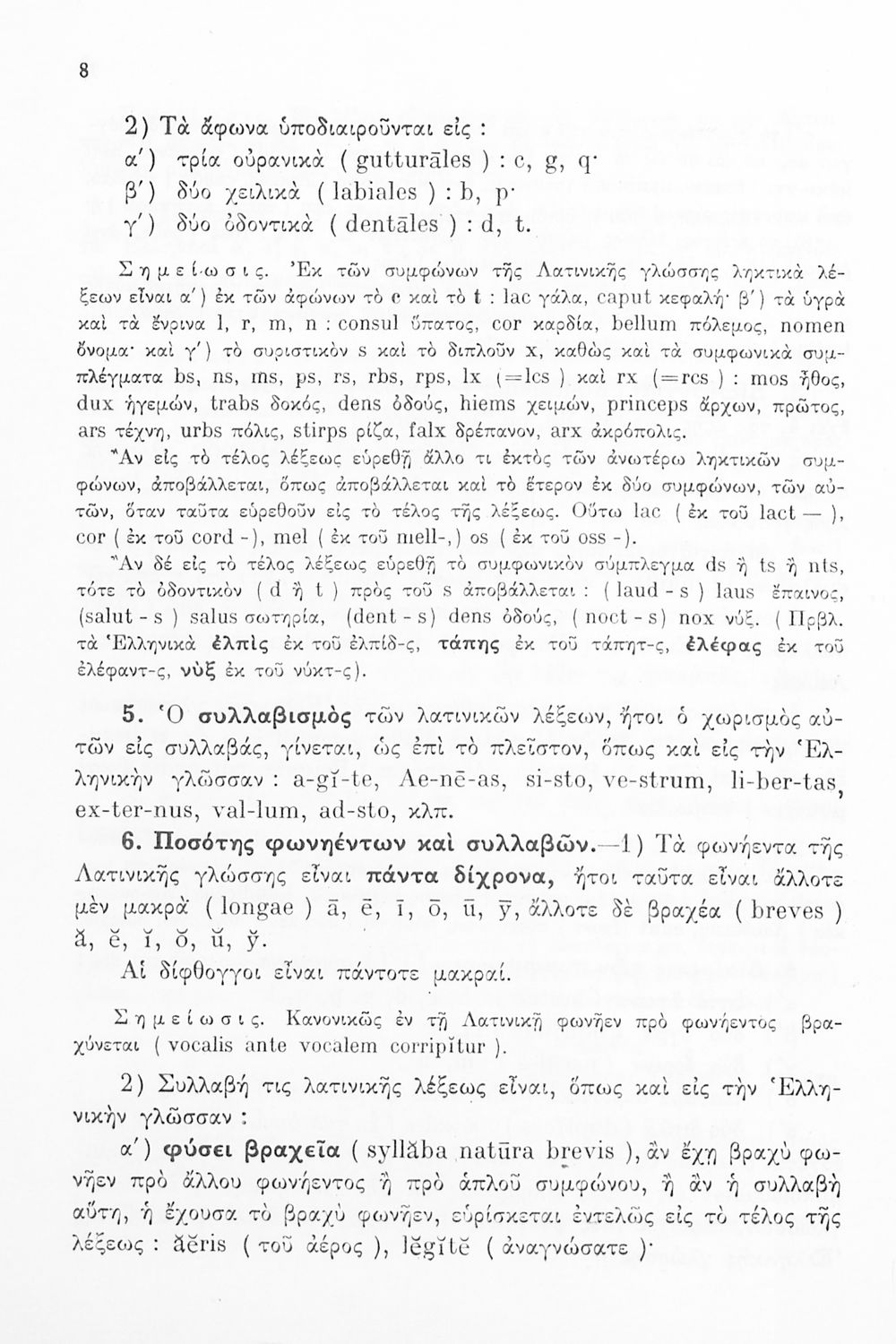 Βαθμίδα εκπαίδευσης: Δευτεροβάθμια Τάξη: Δ' Γυμνασίου / Ε' Γυμνασίου / ΣΤ' Γυμνασίου Μάθημα: Νέα Ελληνικά Γλώσσα: Απλή καθαρεύουσα Παρουσίαση περιεχομένου: Σχολικό εγχειρίδιο Λατινικών Δ΄, Ε΄ και ΣΤ΄ Γυμνασίου που περιλαμβάνει γραμματική και συντακτικό και είναι χωρισμένο σε φθογγολογικό, τυπολογικό και ετυμολογικό μέρος. Φέρει το σύμβολο της δικτατορίας. |